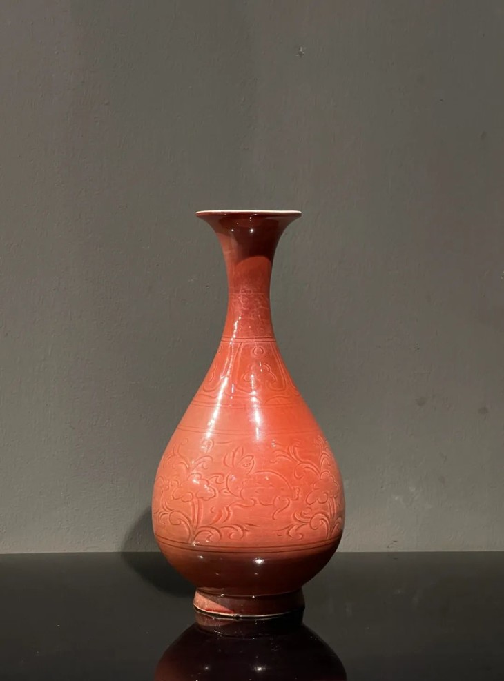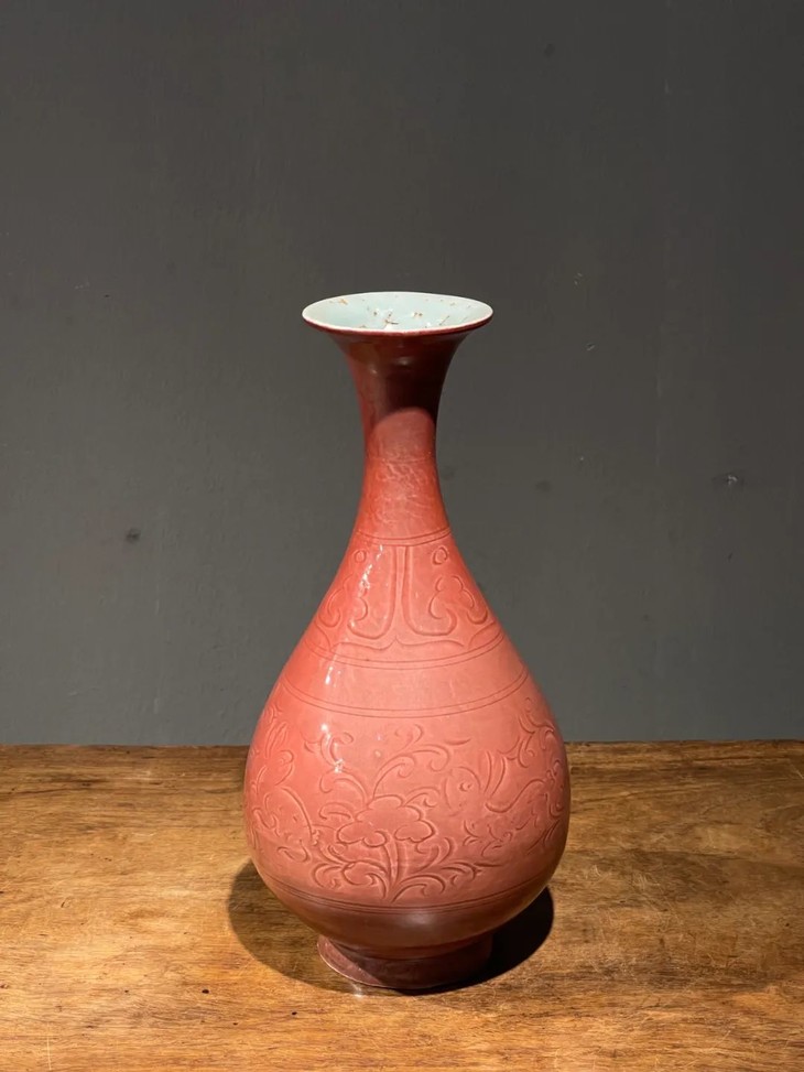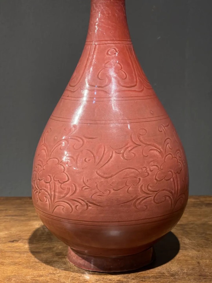 这是一件造型典雅刻花生动的红釉刻花卉玉兔纹玉壶春瓶,红釉刻花玉壶春瓶,依初创于元代的高温铜红釉覆盖与刻划划瓷胎上烧造而成,仿元代早明风格玉壶春瓶造型瘦长优雅,刻划花卉玉兔纹生动豪迈,红釉肥厚呈俗称“猪肝红”的红中略带黑色调,高圈足内与口沿内部鸭蛋青色具开片痕,整体风格粗中有细,豪迈自然。