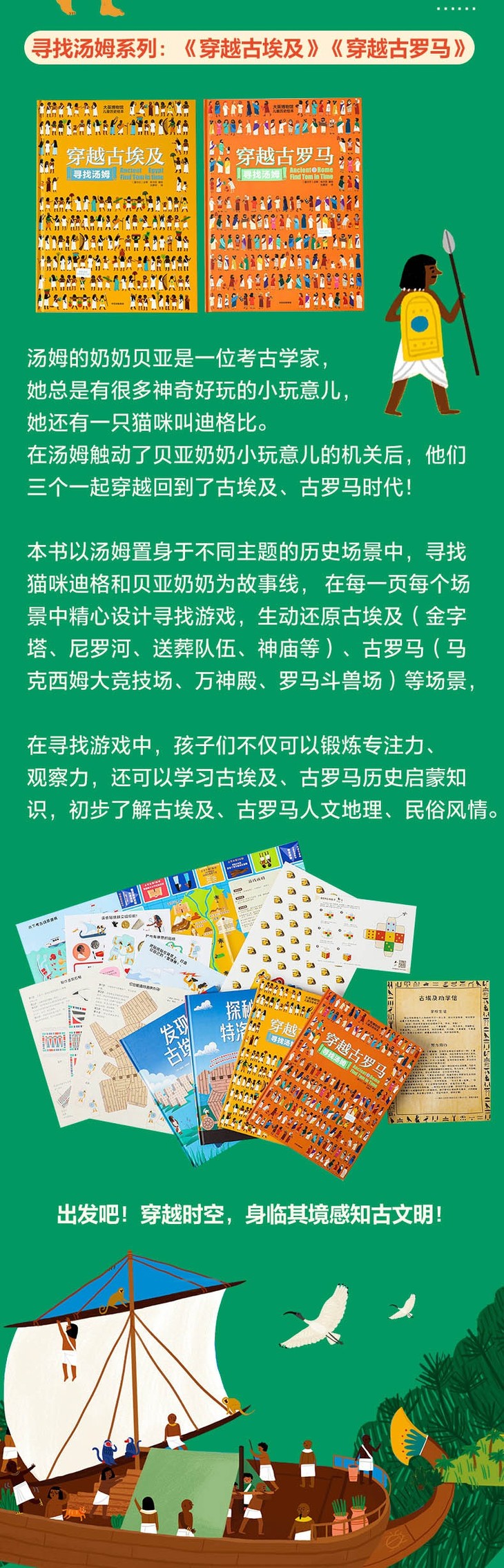 这套有趣又有料的历史绘本,充满惟妙惟肖的精美绘图和令人着迷的古埃及、古罗马元素。本书以汤姆置身于各个不同的历史场景寻找贝亚奶奶和猫咪迪格比为线索,在每一页每个场景中精心设计寻找游戏,生动还原古埃及(金字塔、尼罗河、送葬队伍、神庙等)、古罗马(马克西姆大竞技场、万神殿、罗马斗兽场)等场景,让孩子在有趣的寻找游戏中了解古城的人文风情。