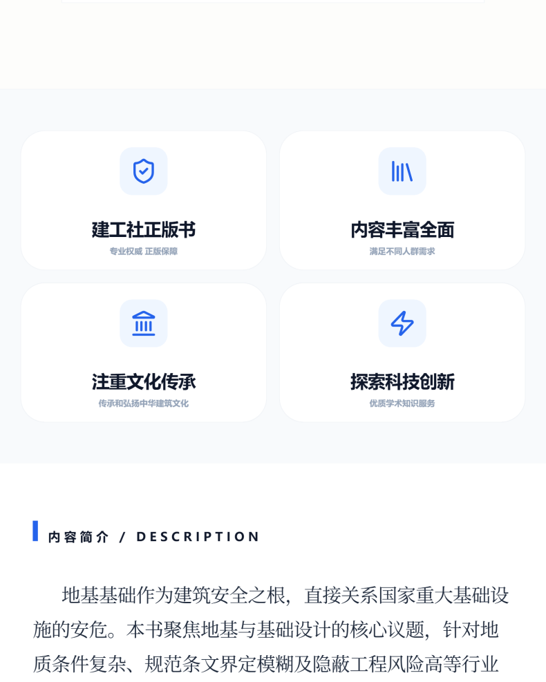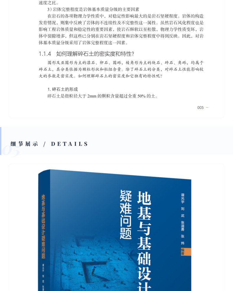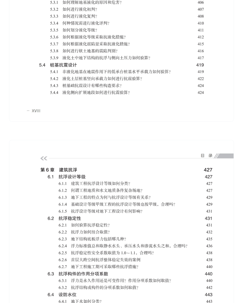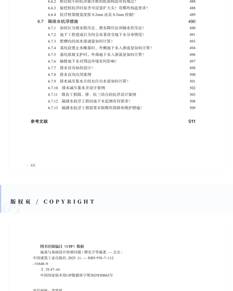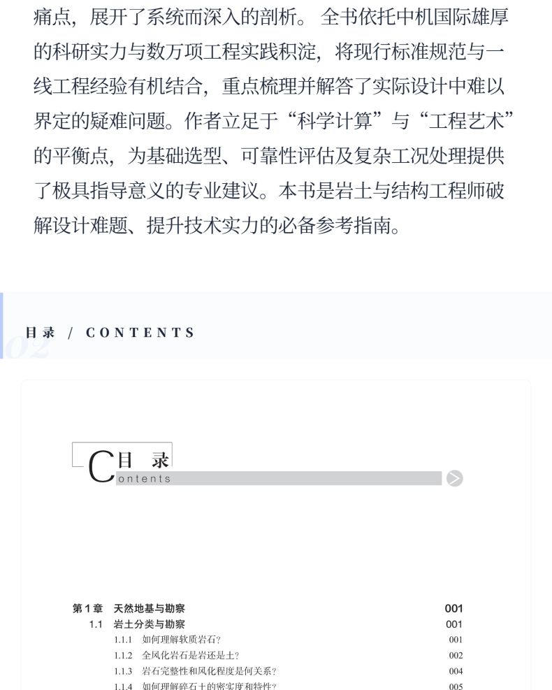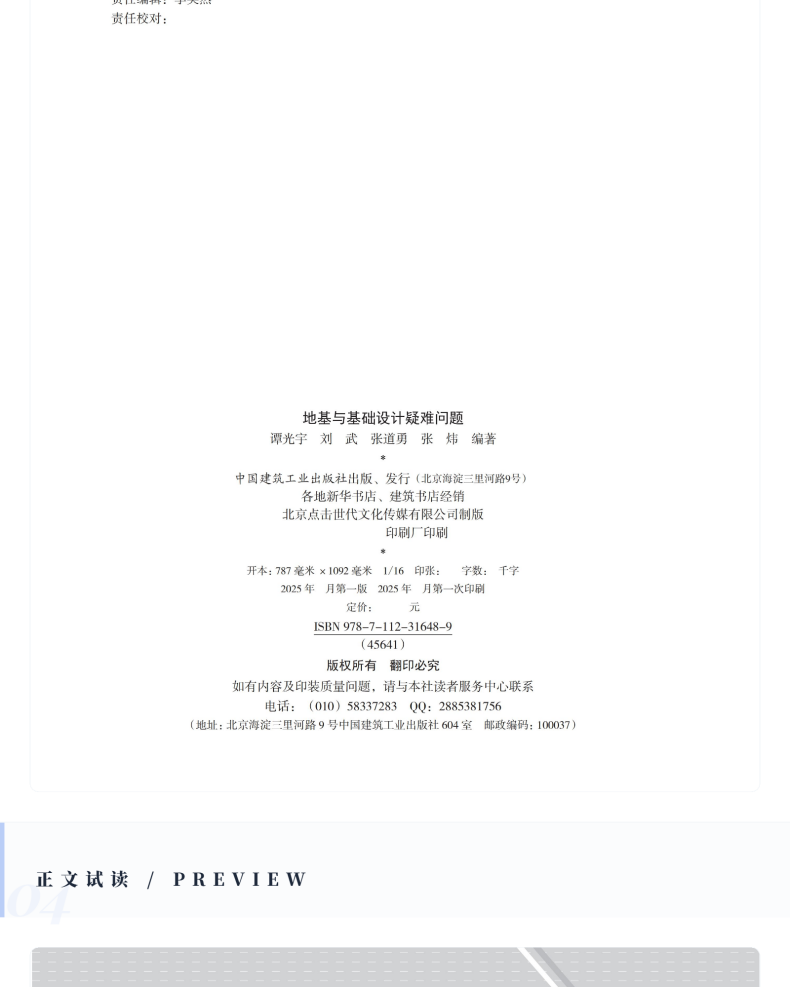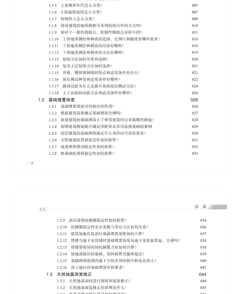 随着我国城市化进程加速,高层建筑、地下空间开发及复杂地质环境下的工程建设规模持续扩大,抗浮失效与地基基础设计问题频发,成为制约工程安全与经济效益的关键因素。现有规范与设计方法多针对传统工况,难以应对超深基坑、高水位软土区、既有建筑改造等新型挑战,行业亟需系统性技术革新。本书围绕新型抗浮体系与地基基础设计难题,整合前沿研究成果与工程实践经验,旨在填补学科空白,推动行业技术升级,具有显著的学术价值与实践意义。本书总结了我们对规范中疑难问题的理解与查证,以及近十年来参与项目的工程案例中常见问题的分析。通过这两方面的阐述,希望能够对设计人员有所帮助。 本书分为四个章节,第一章为天然地基,第二章为桩基础,第三章为地基处理,第四章为特殊地基,第五章为地基与基础抗震设计,第六章为建筑抗浮。