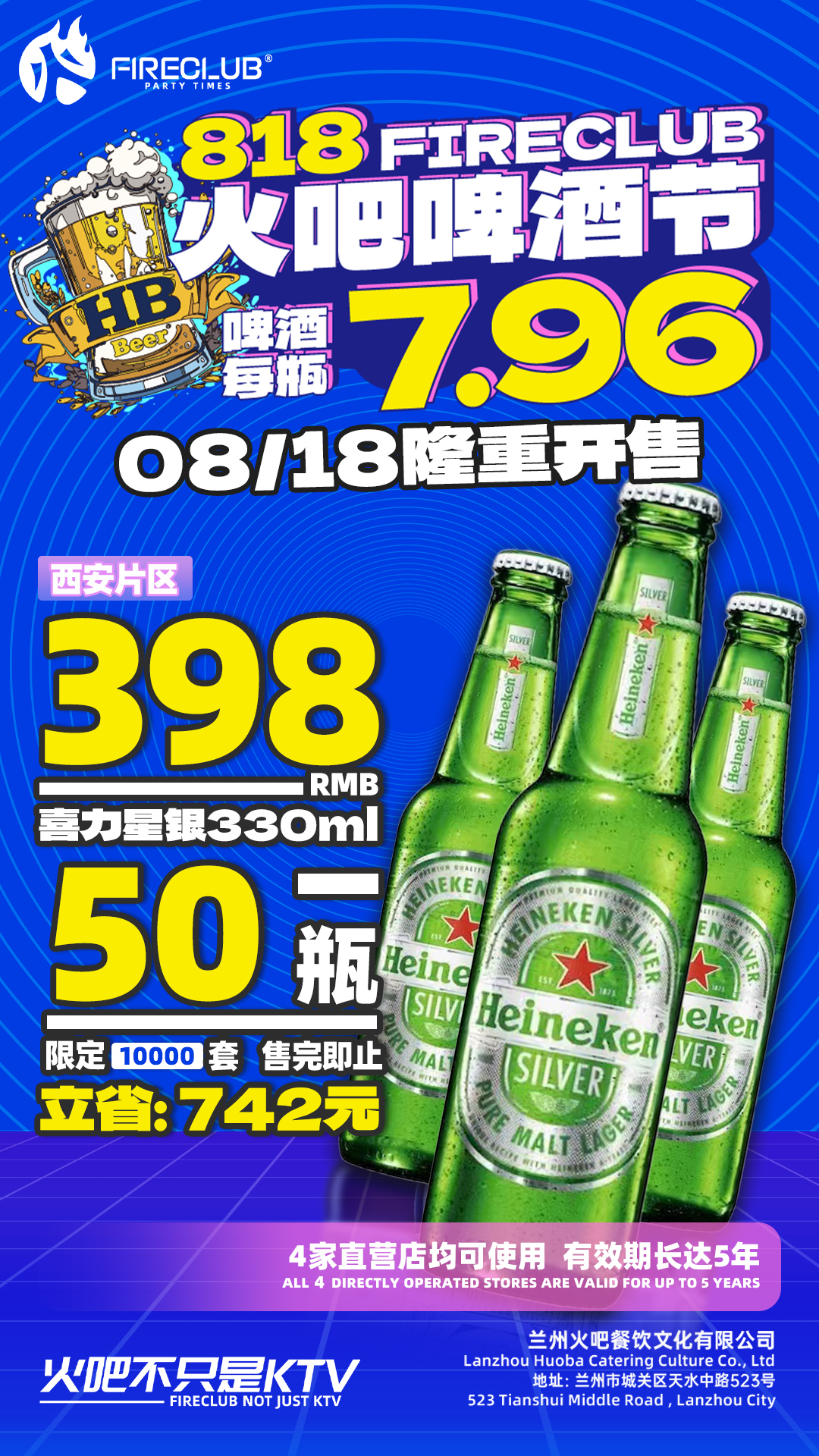 【西安通用】8月18日火吧啤酒节—398元50瓶喜力星银330ml—超值存酒卡