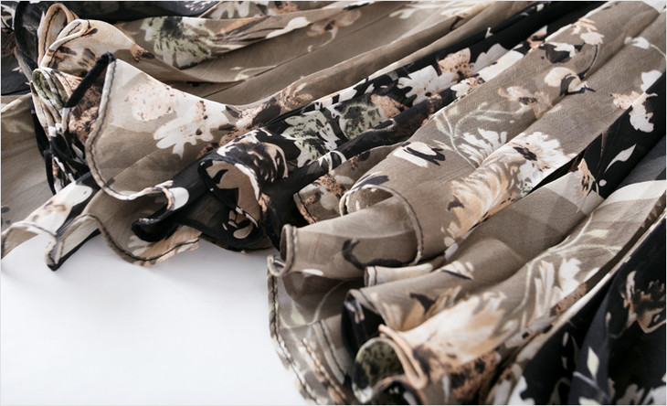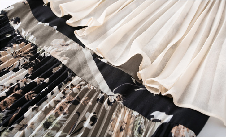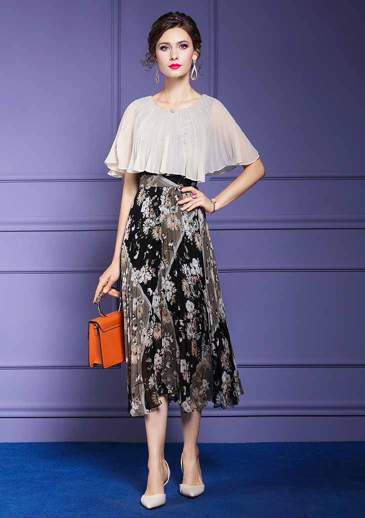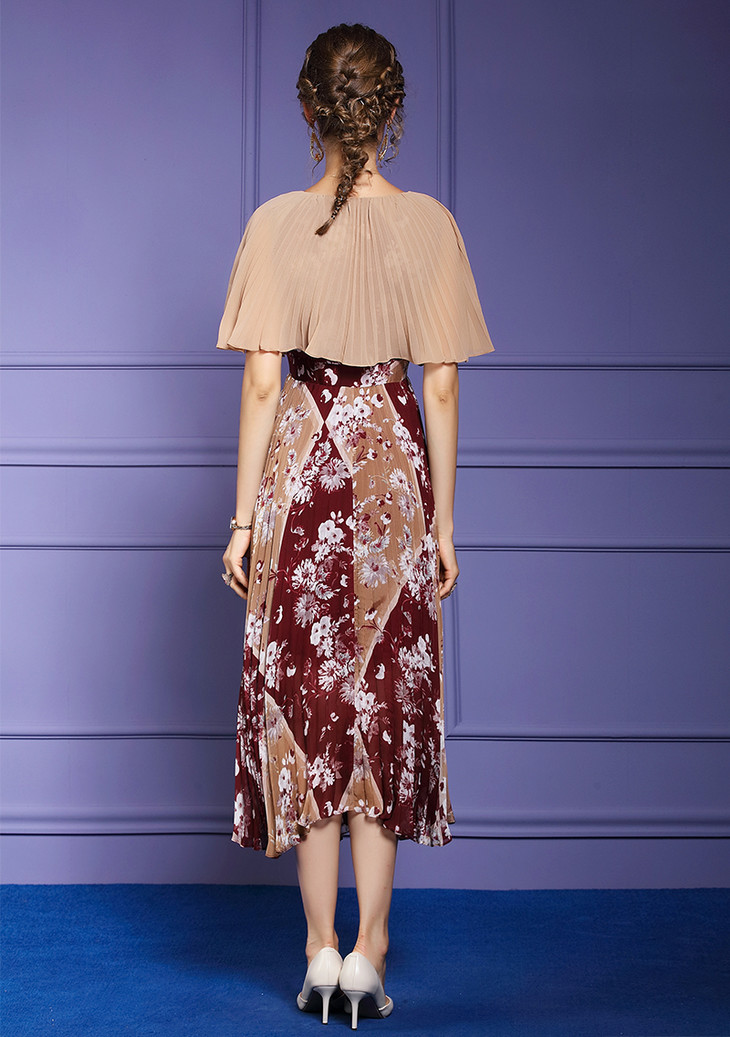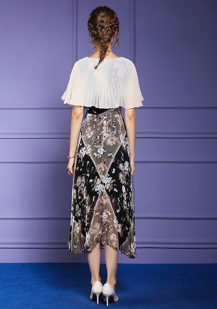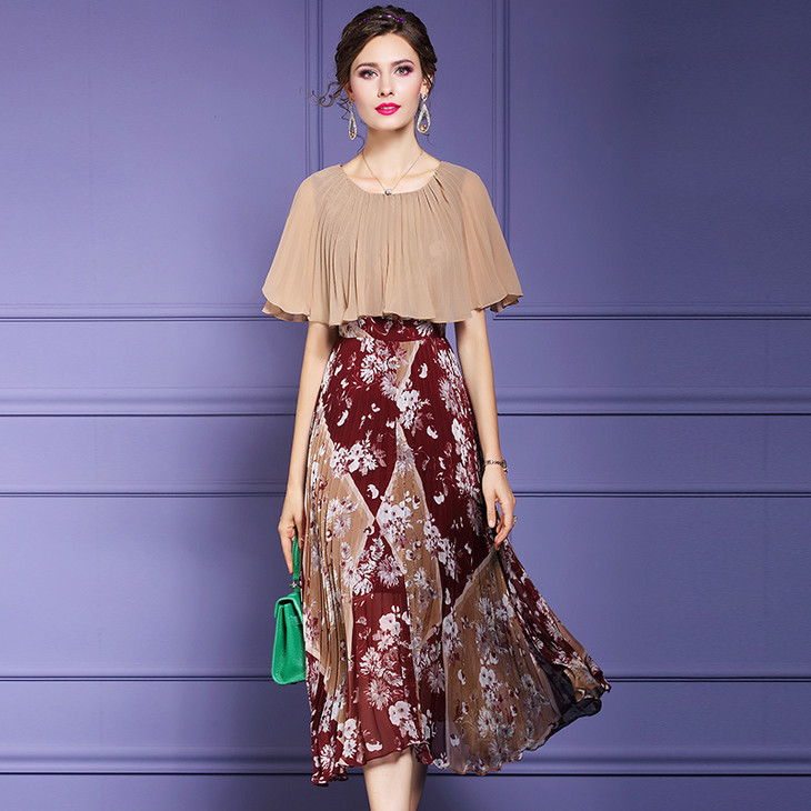 FMY-F20XL33147夏季复古印花雪纺斗篷式拼接假两件套连衣裙