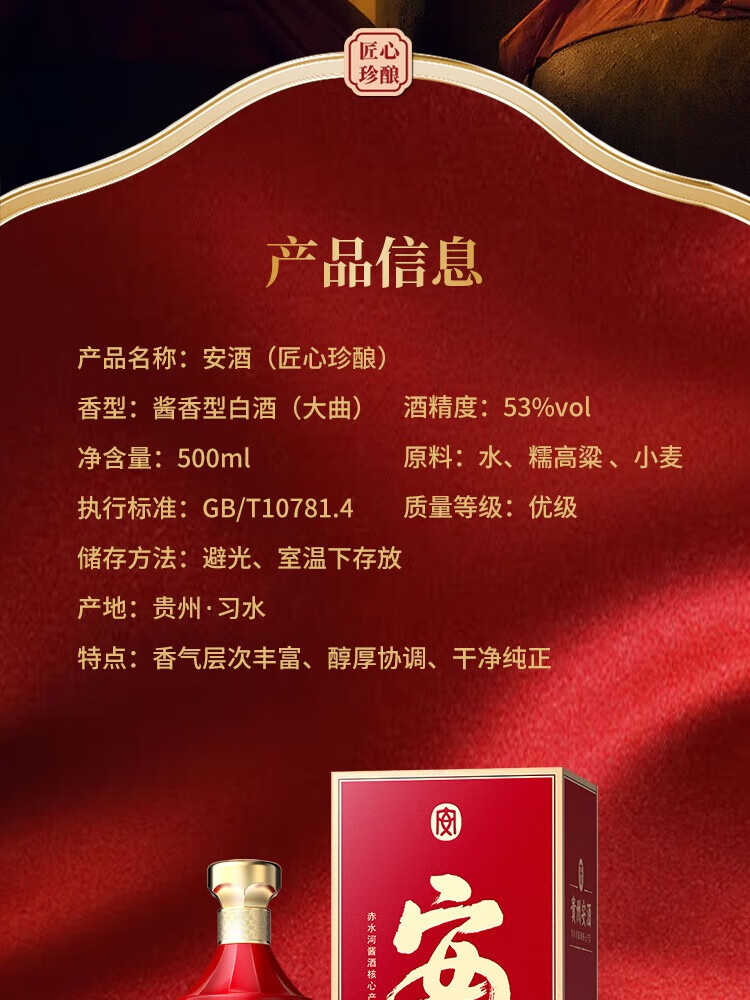 【年货节领券立减1000】 贵州安酒 匠心珍酿 酱香型白酒 53%vol 500mL 6瓶 整箱装