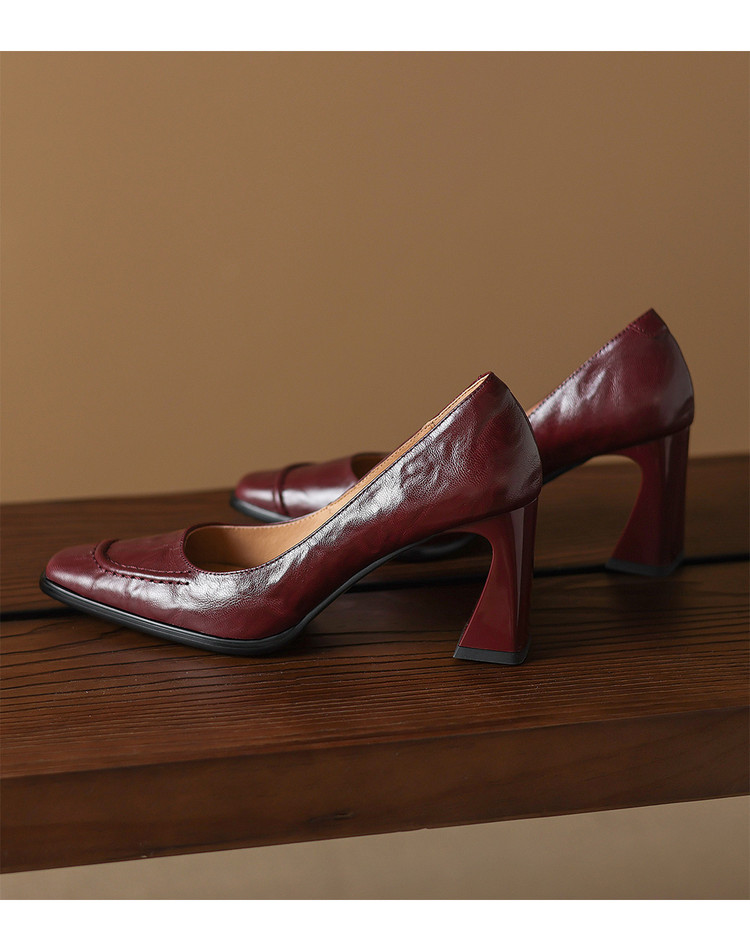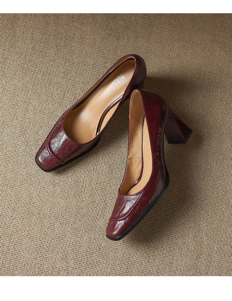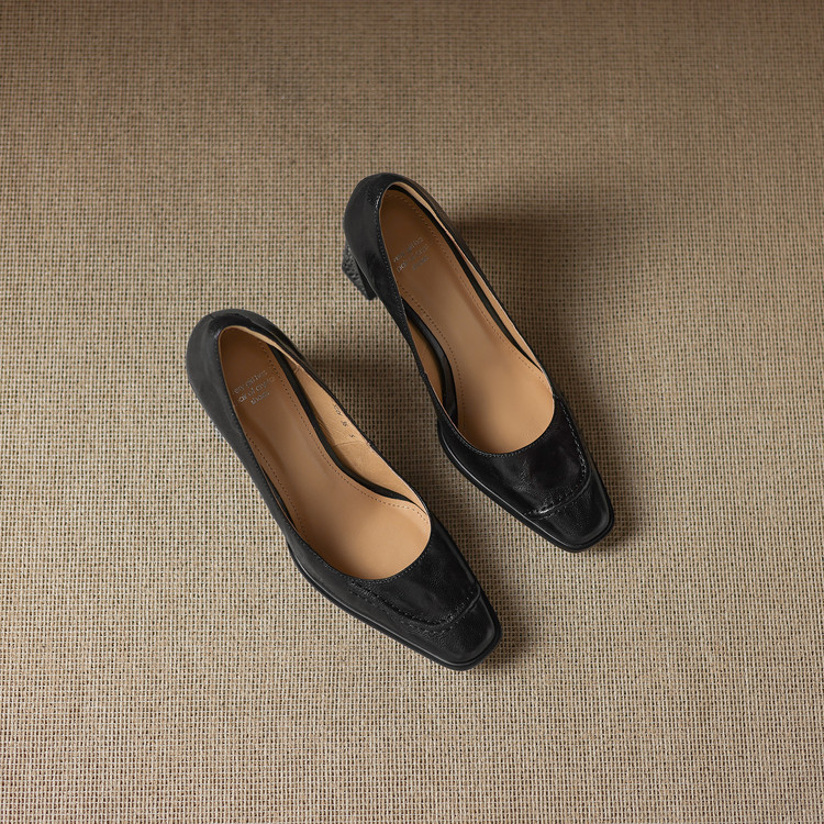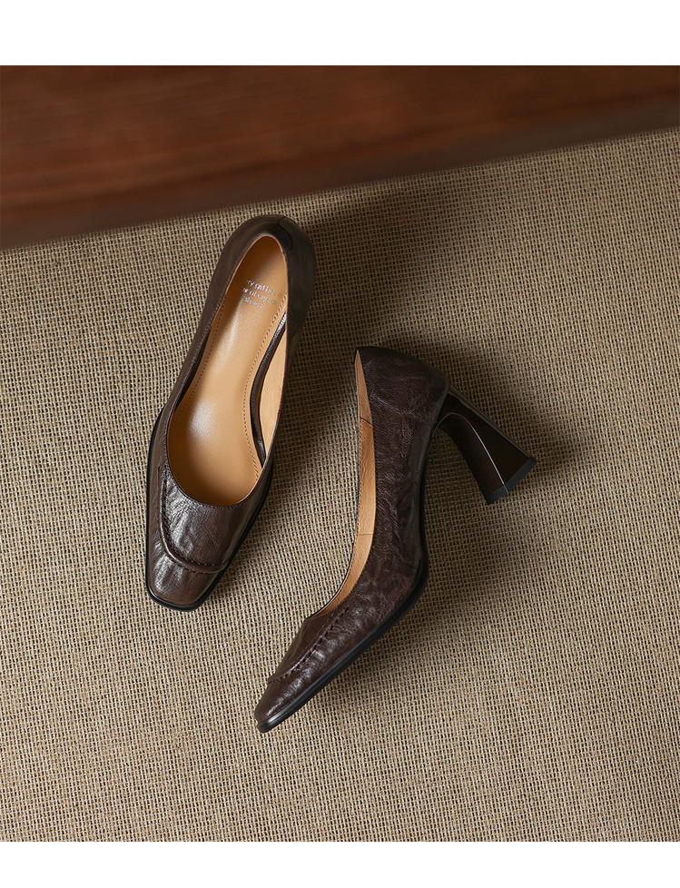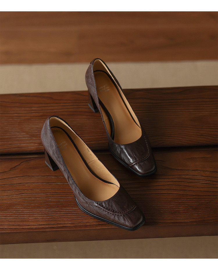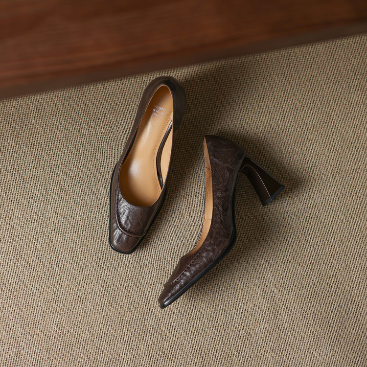 【预售5天】柔软羊皮方头浅口一脚蹬单鞋女春秋季新款简约气质复古OL职业粗高跟鞋HB&5549