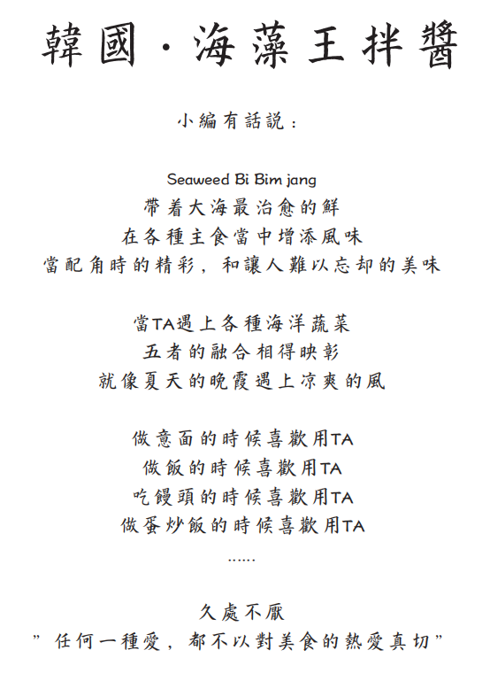 五种海洋蔬菜的结合,让整罐拌饭酱都充满了奇妙之处。