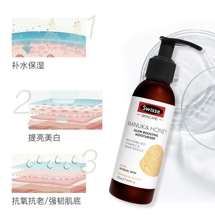 Swisse麦卢卡蜂蜜焕彩保湿乳120ml👍富含维生素C、葡萄籽油和乳木果油,滋润保湿💦,令肌肤水嫩饱满。还可有效舒缓肌肤,镇定红肿和刺激。滋润肌肤,修复肌肤,提亮匀亮肤色🤩,使肌肤更加光滑紧致。质地轻盈,持久滋润不粘腻,好推开好吸收。💁想要强效补水、祛黄提亮,选它❗