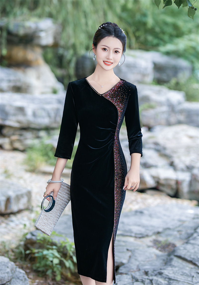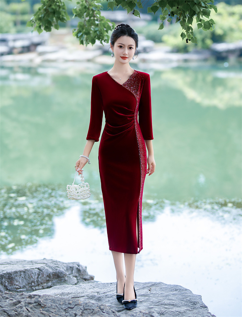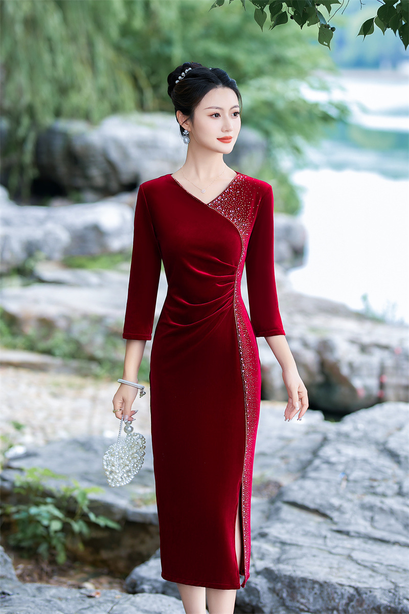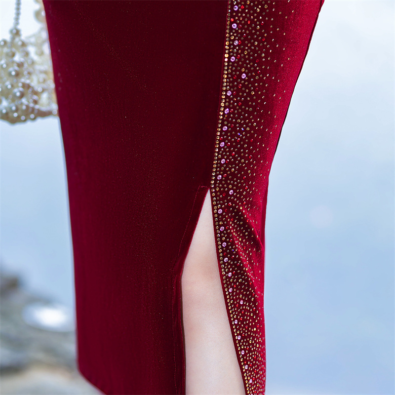 GX时尚改良中式丝绒烫钻V领大码旗袍 2023新款低领婚礼敬酒服