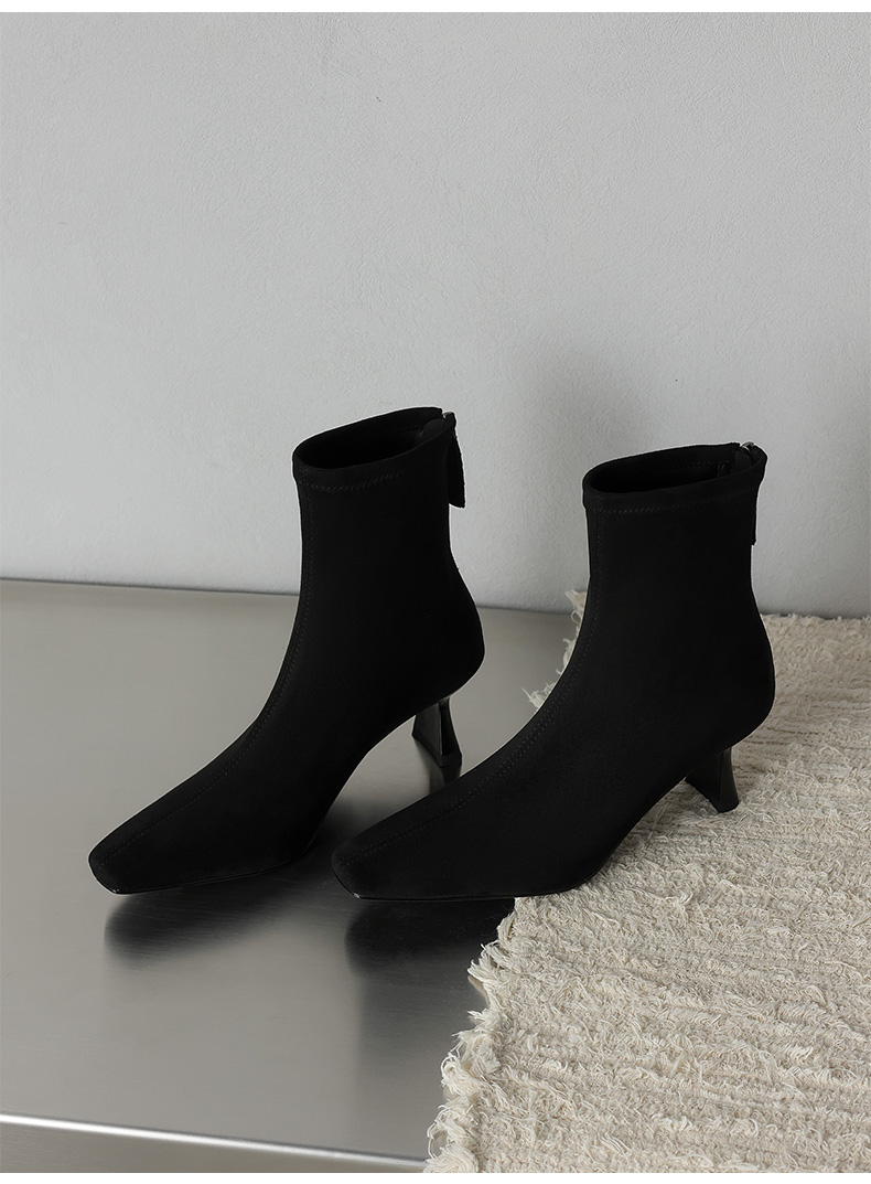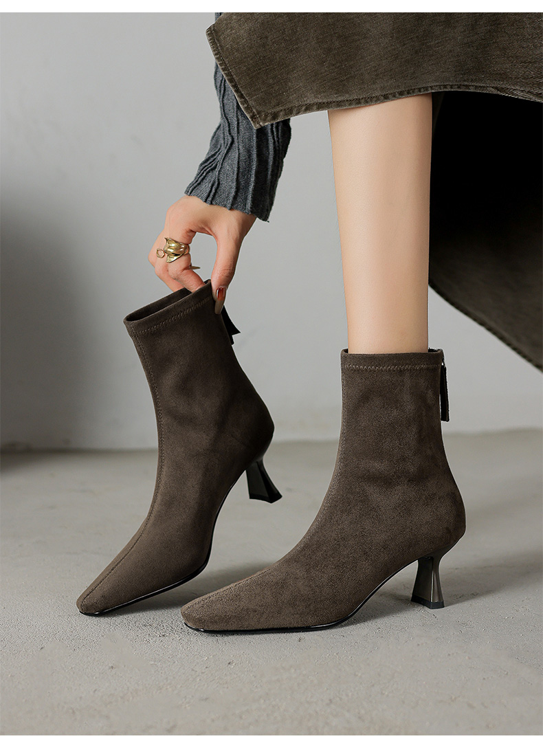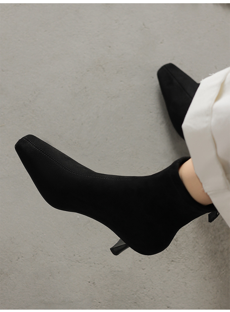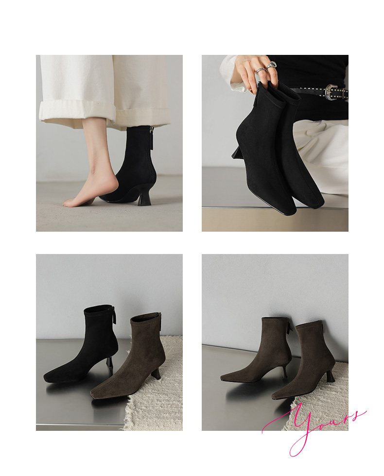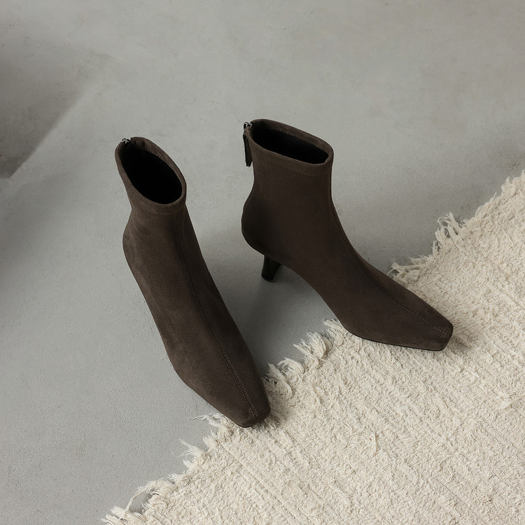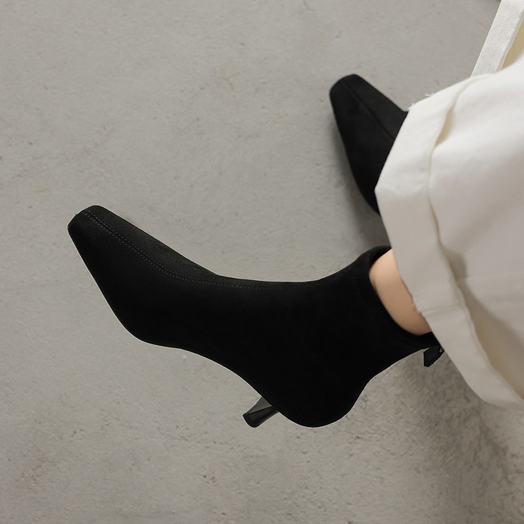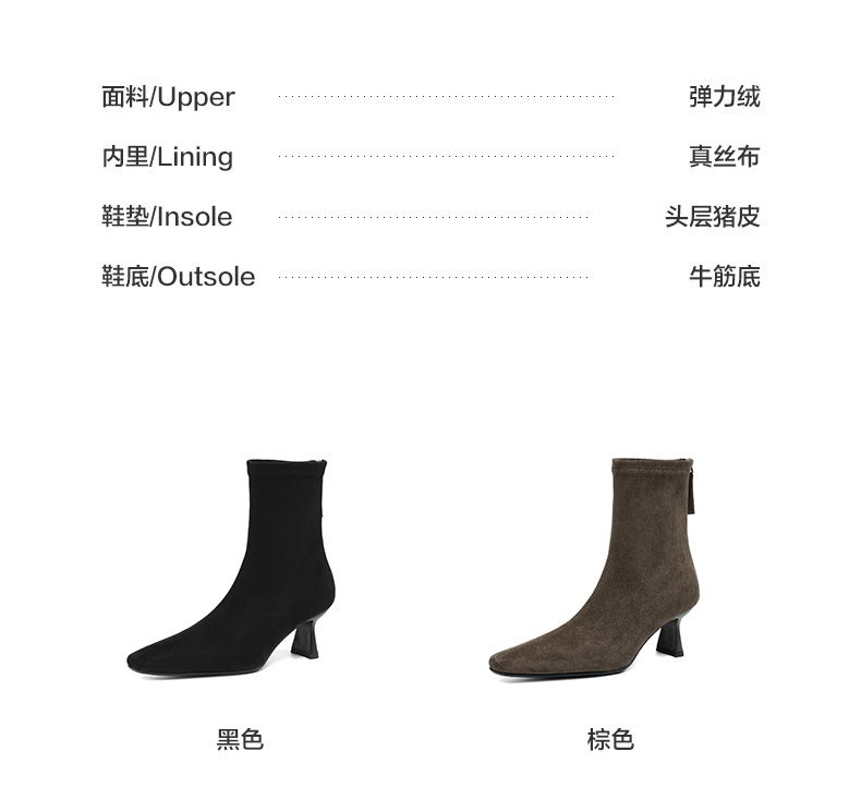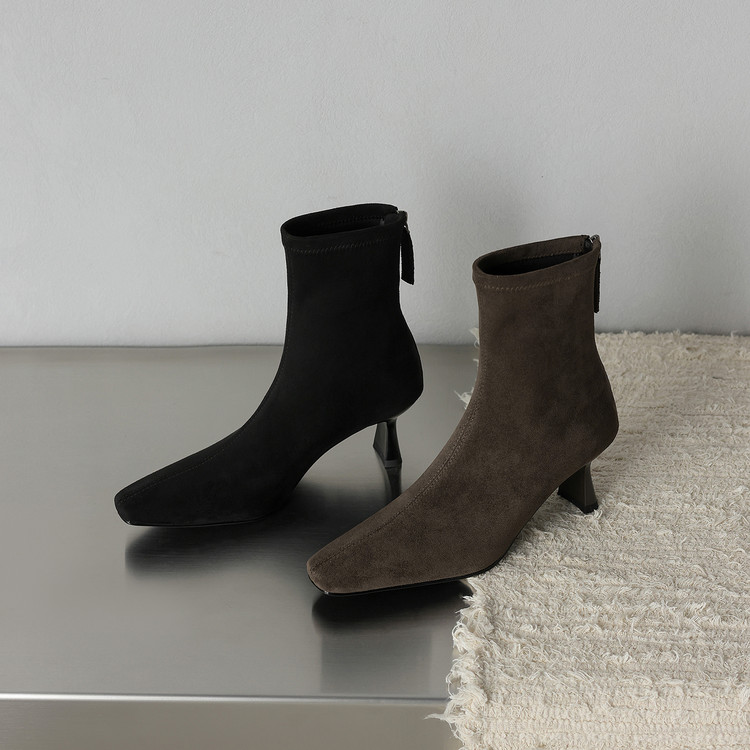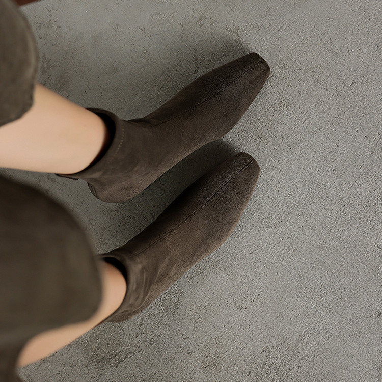 【预售5天】时尚绒面复古粗跟弹力靴女新款气质百搭方头高跟裸靴瘦瘦短靴WC&M3530