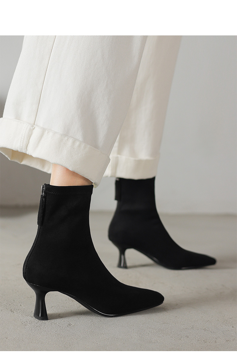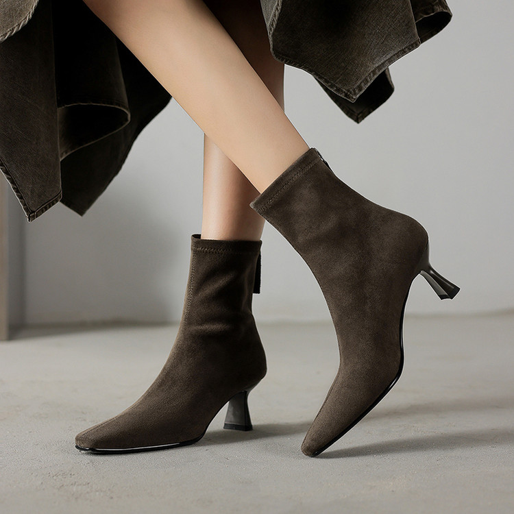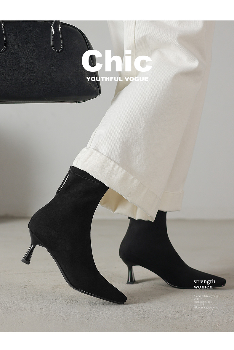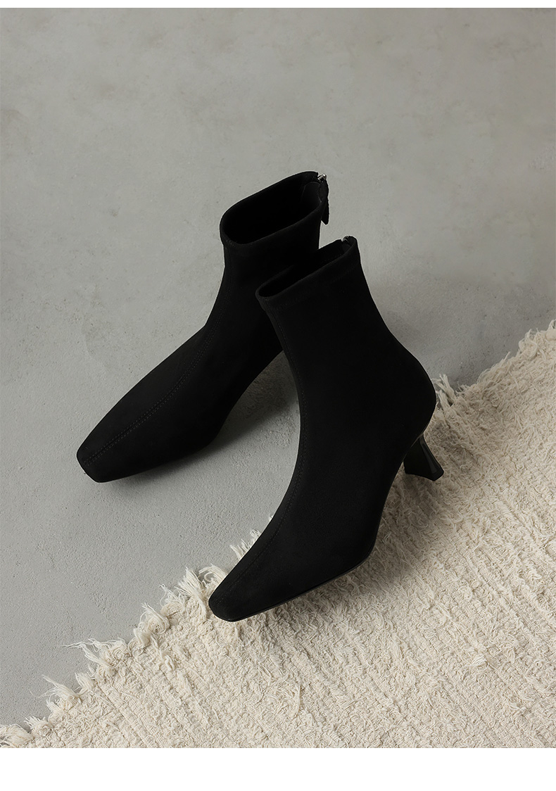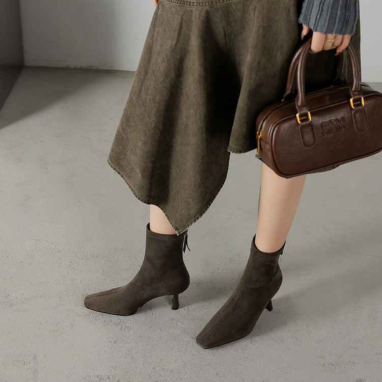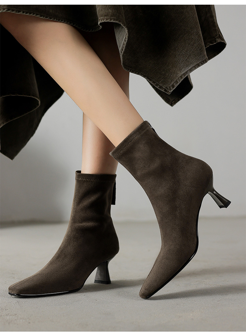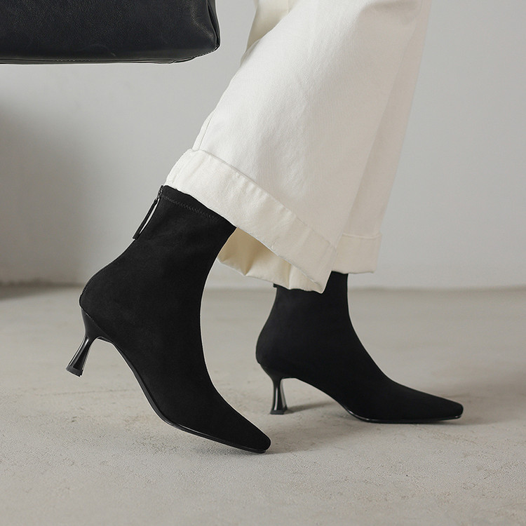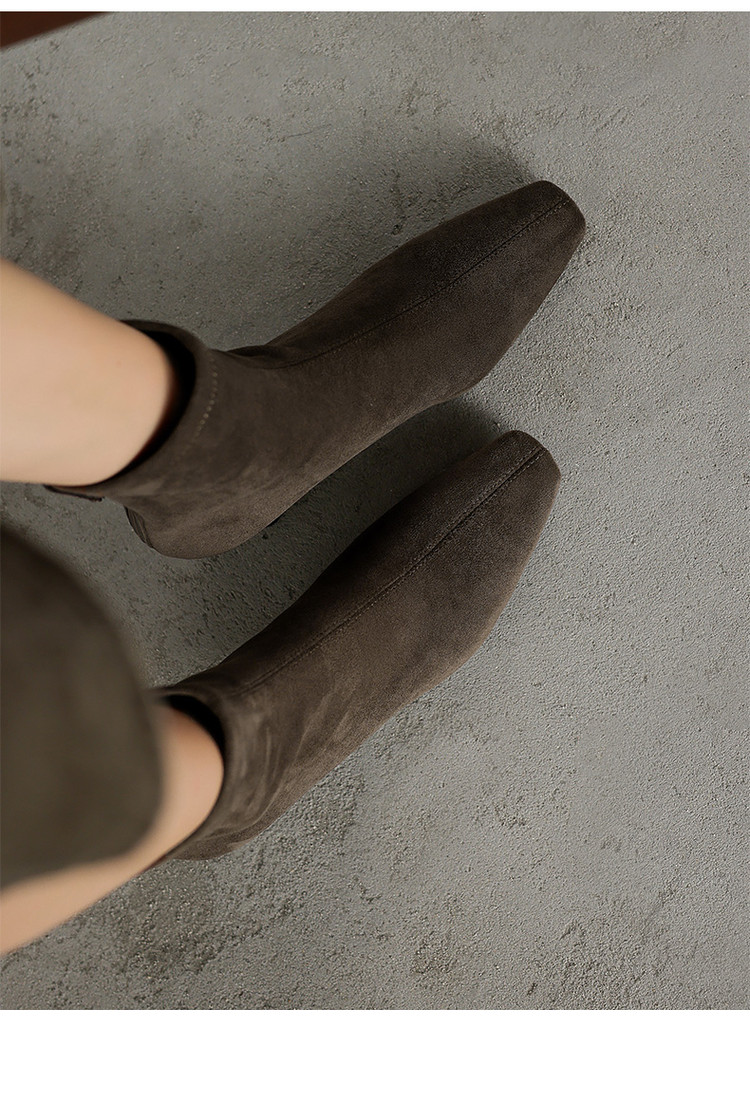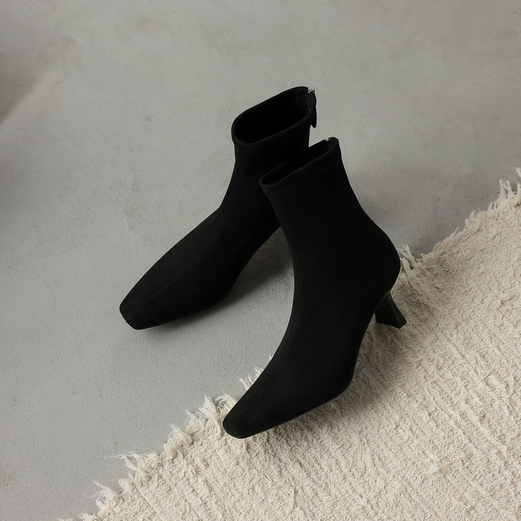 【预售5天】时尚绒面复古粗跟弹力靴女新款气质百搭方头高跟裸靴瘦瘦短靴WC&M3530