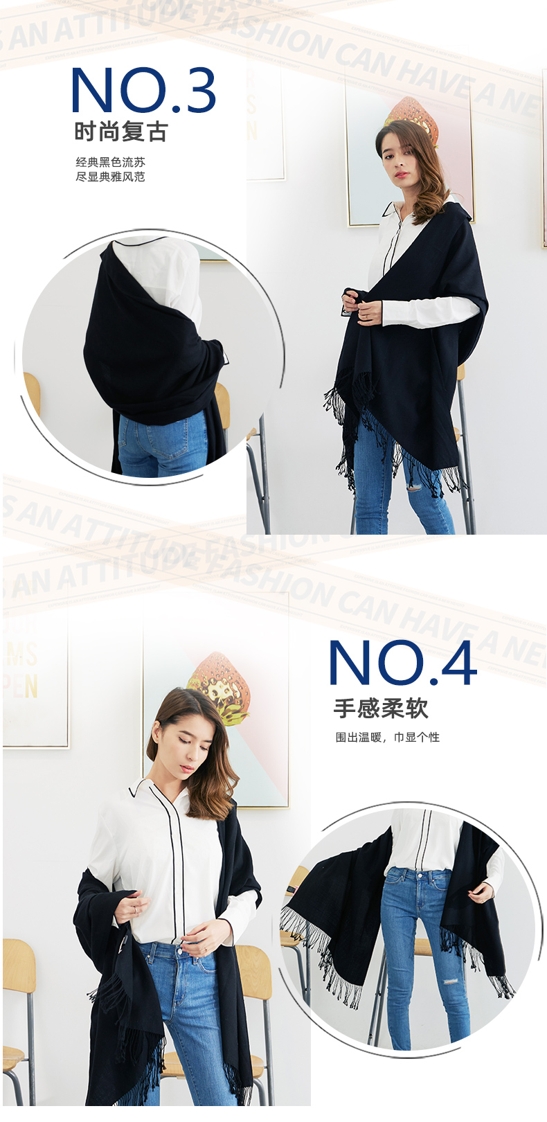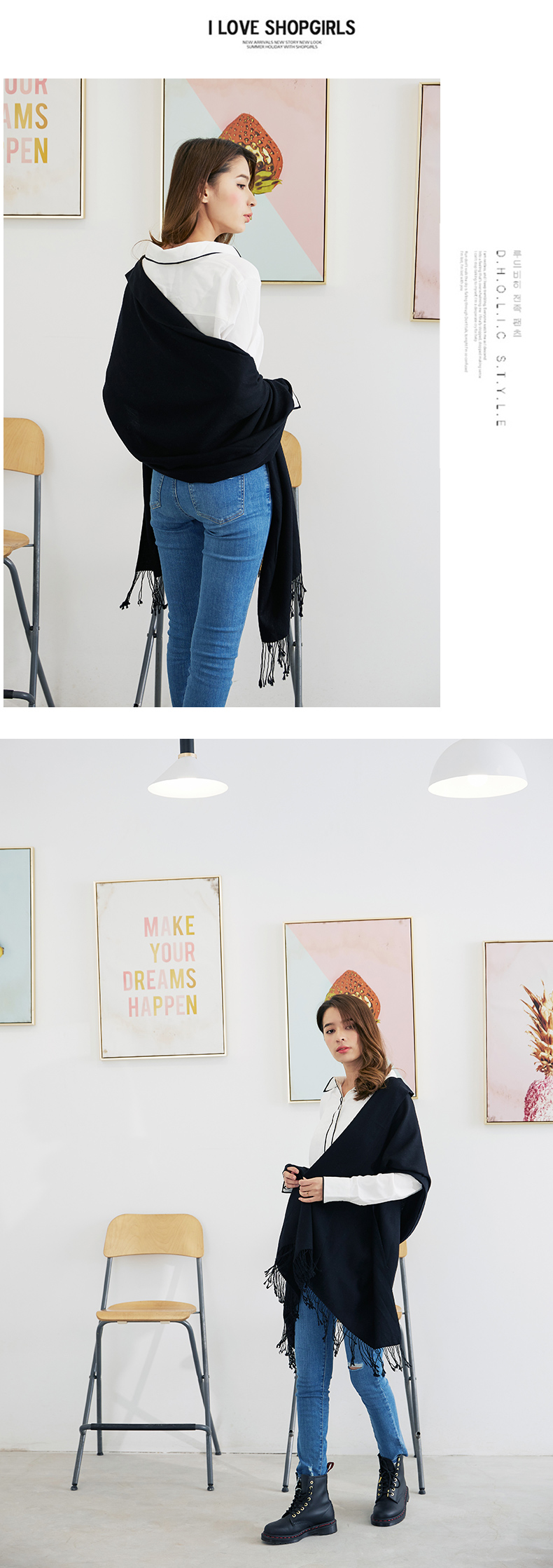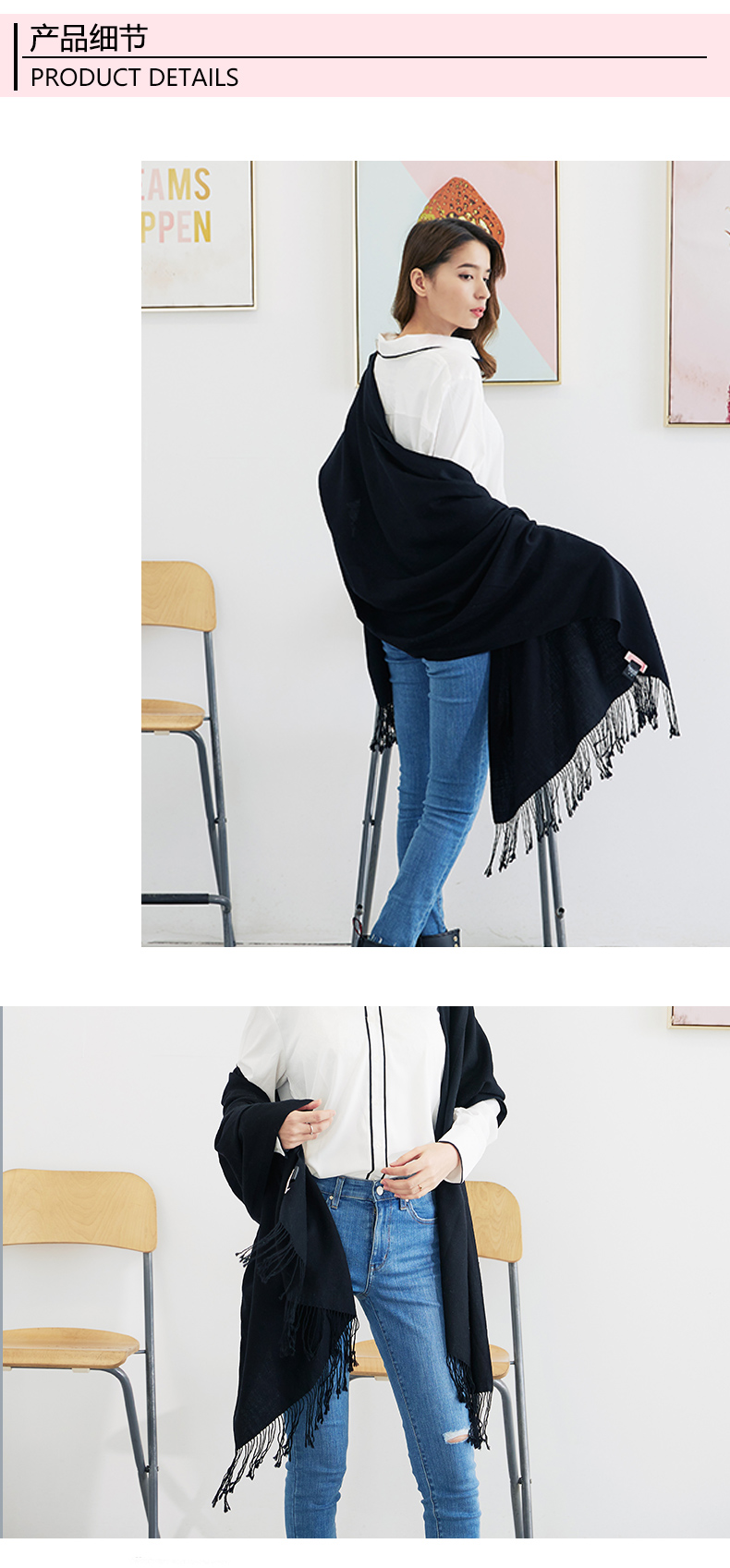 雪绒花Edelweiss 绵羊毛大披肩黑色保暖纯色长方形围巾春秋季通用