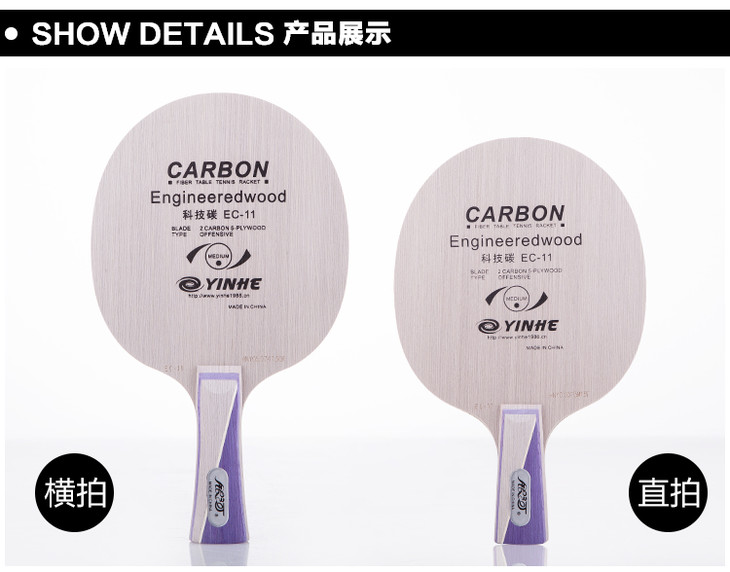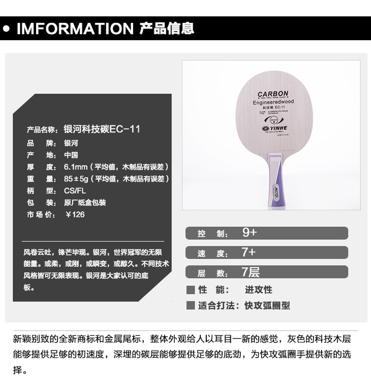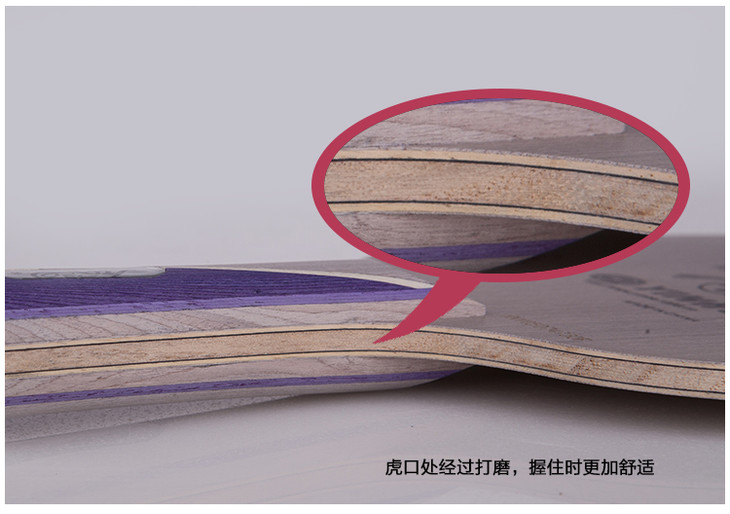 新颖别致的全新商标和金属尾标,整体外观给人以耳目一新的感觉,灰色的科技木表层能够提供充足的初速度,深埋的碳层能够提供充足的底劲,为快攻弧圈选手提供一种新的选择。