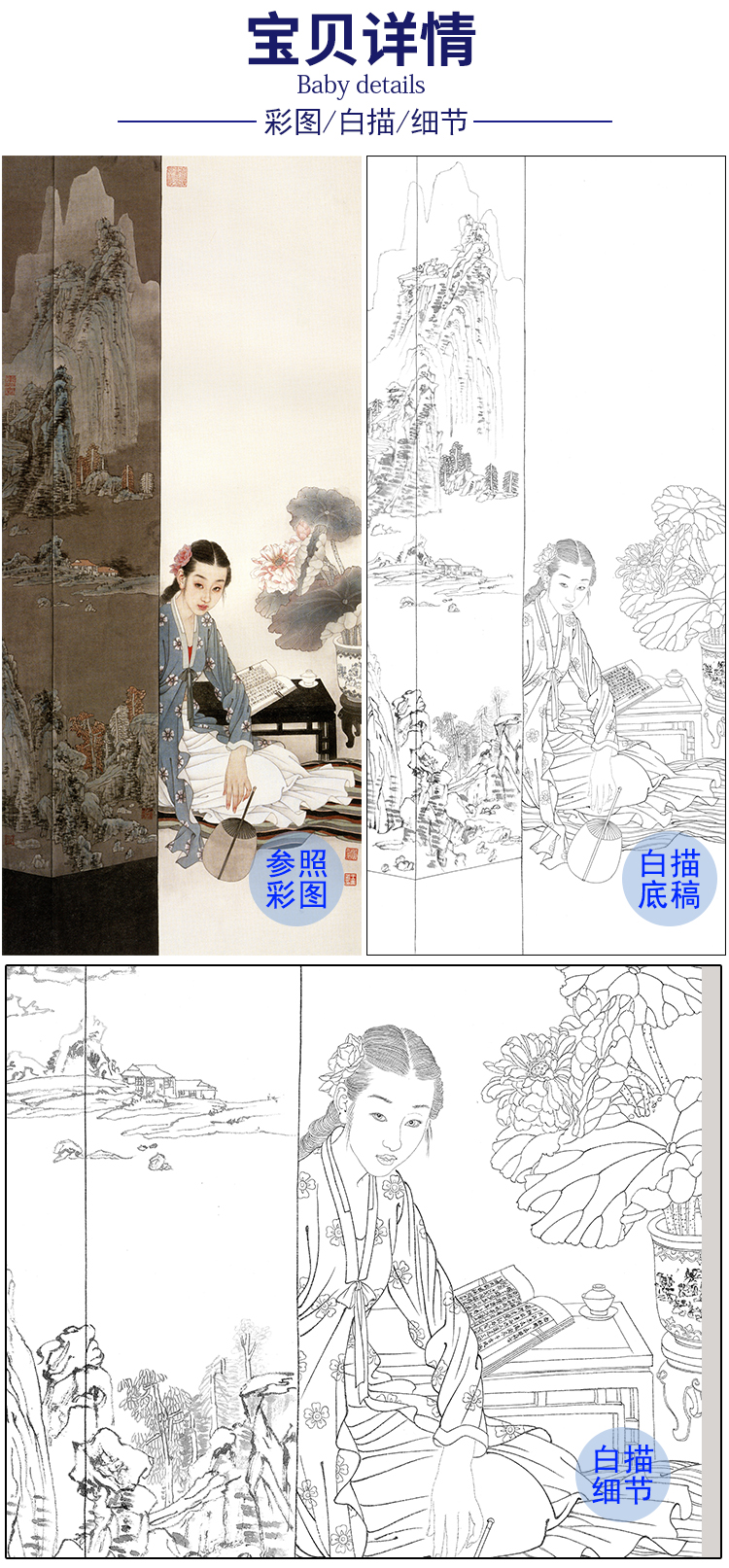 竖幅工笔传统仕女人物白描底稿-王美芳《蝉》-多种白描尺寸可选-B174
