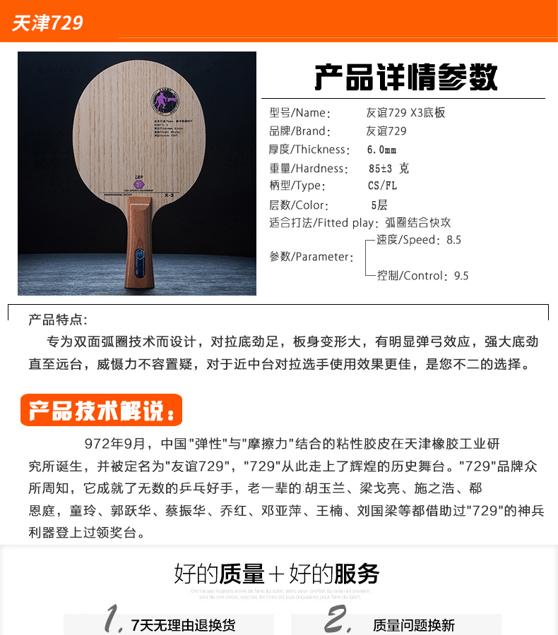 友谊729 X-3 专业5层纯木乒乓球拍底板两面弧圈型
