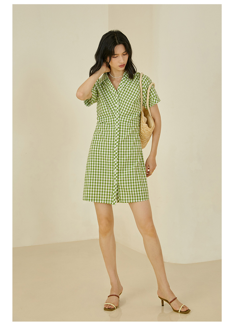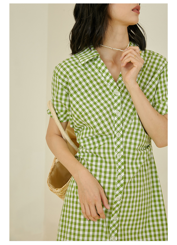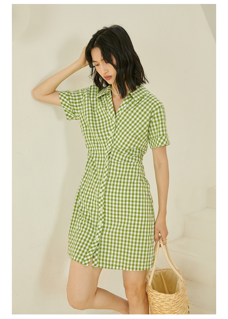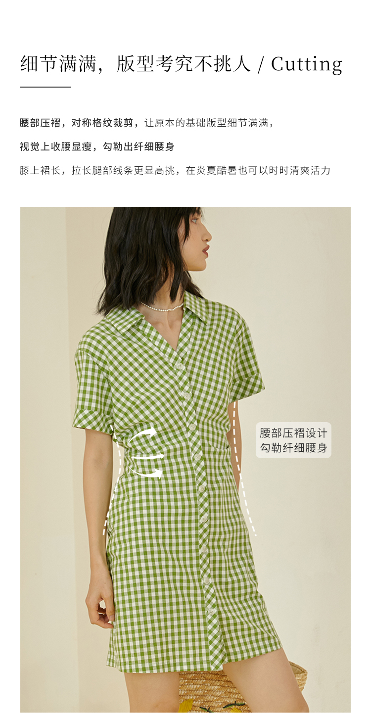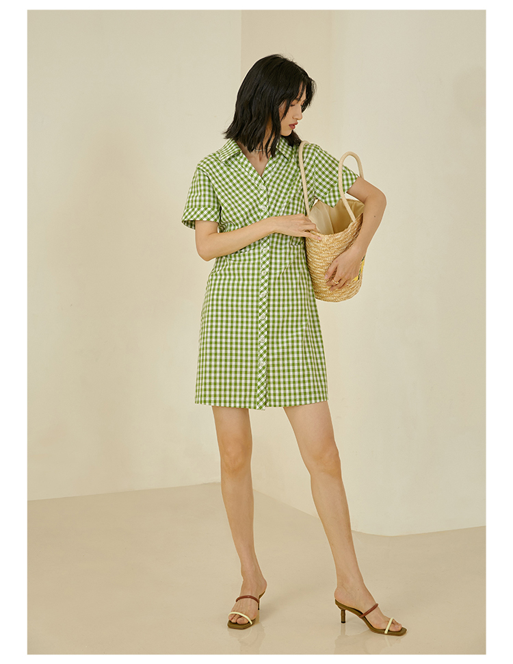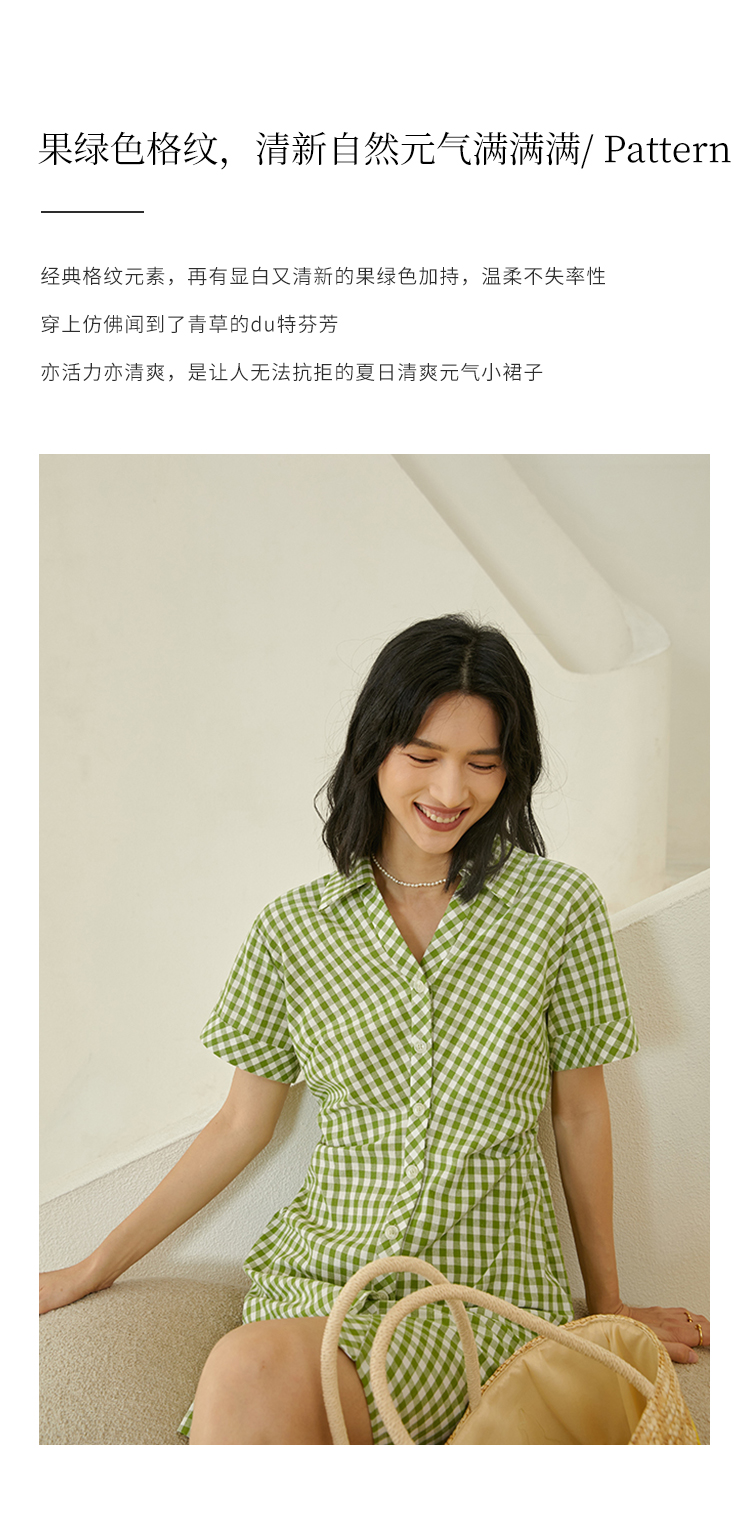 HeyDress法式田园连衣裙女夏季高腰抽褶设计感格纹气质纯棉短裙子