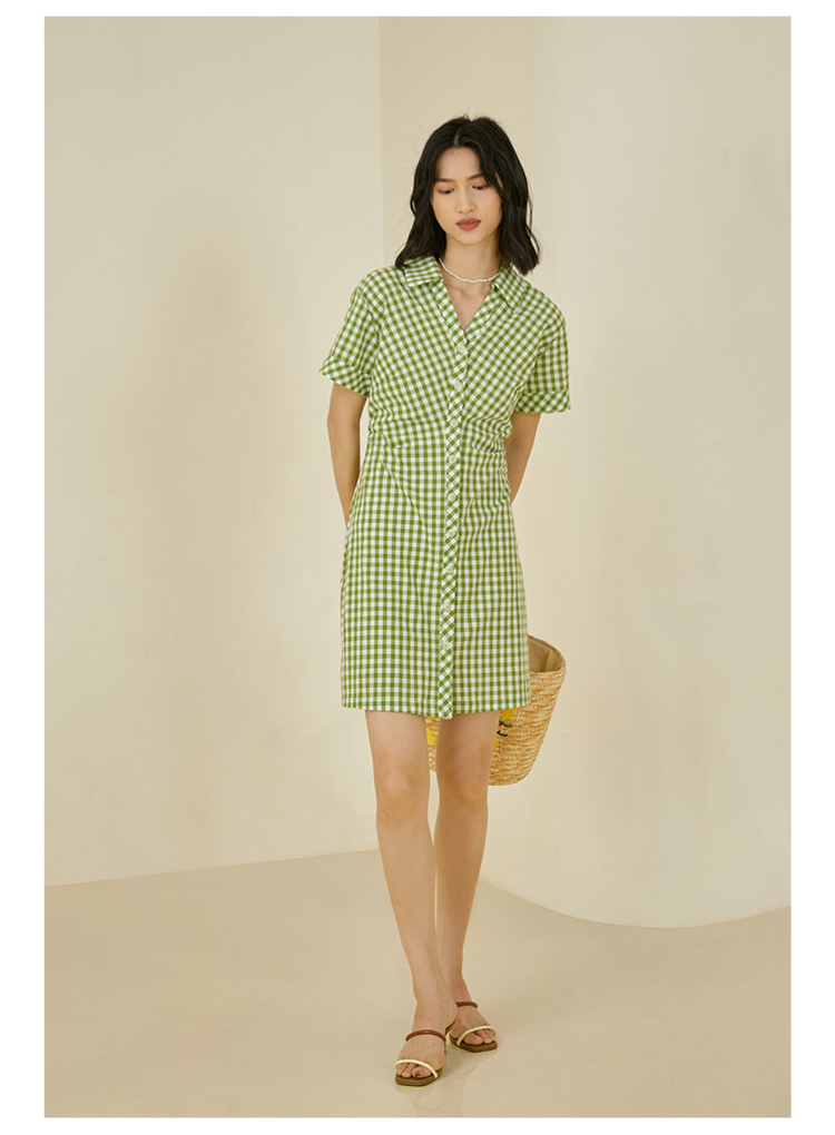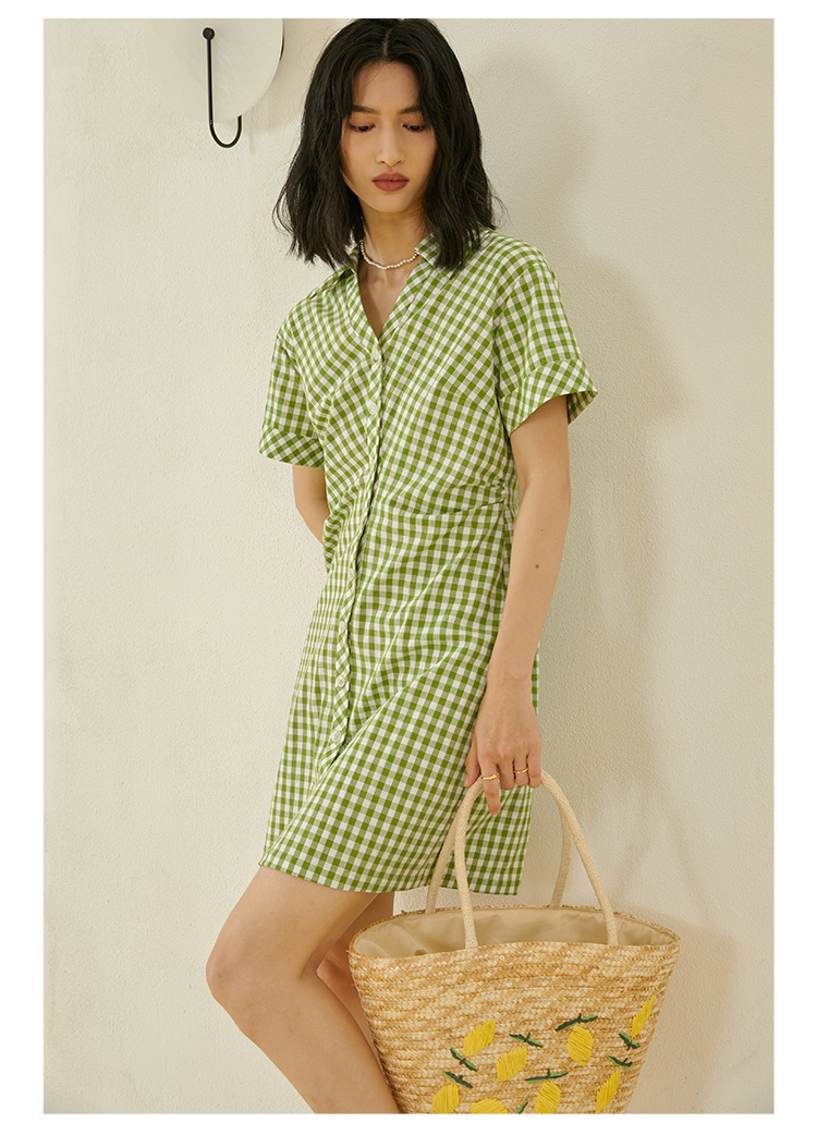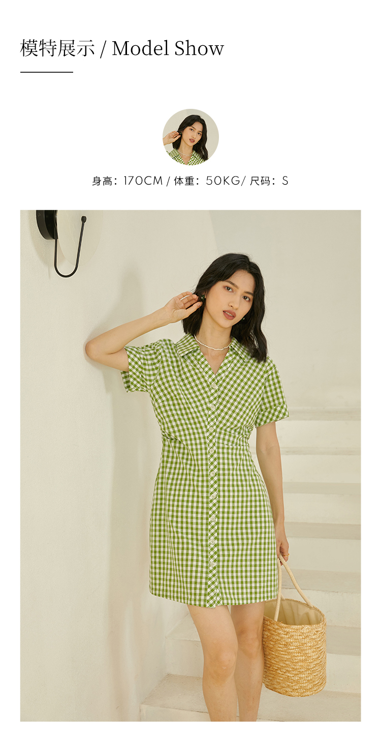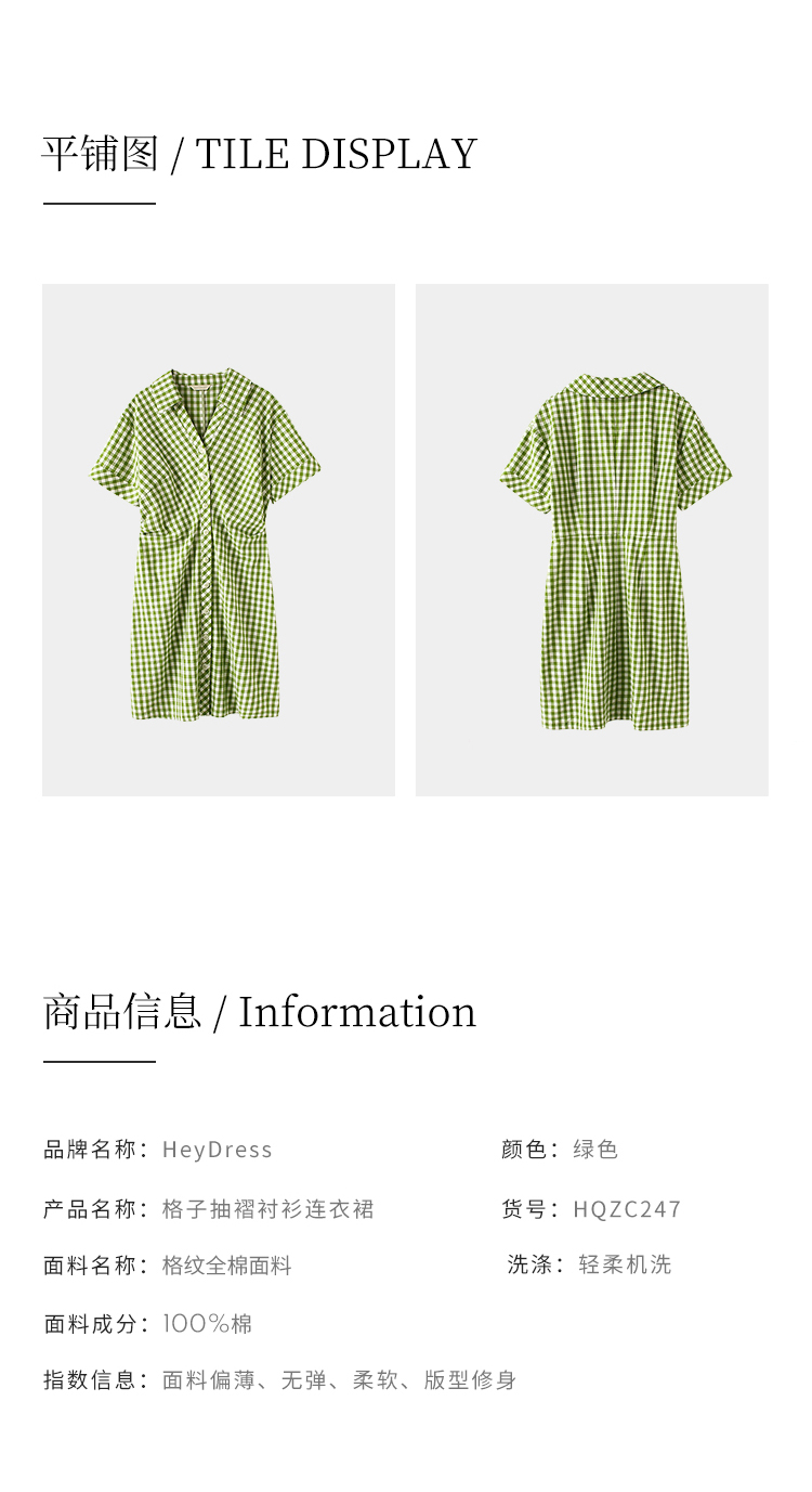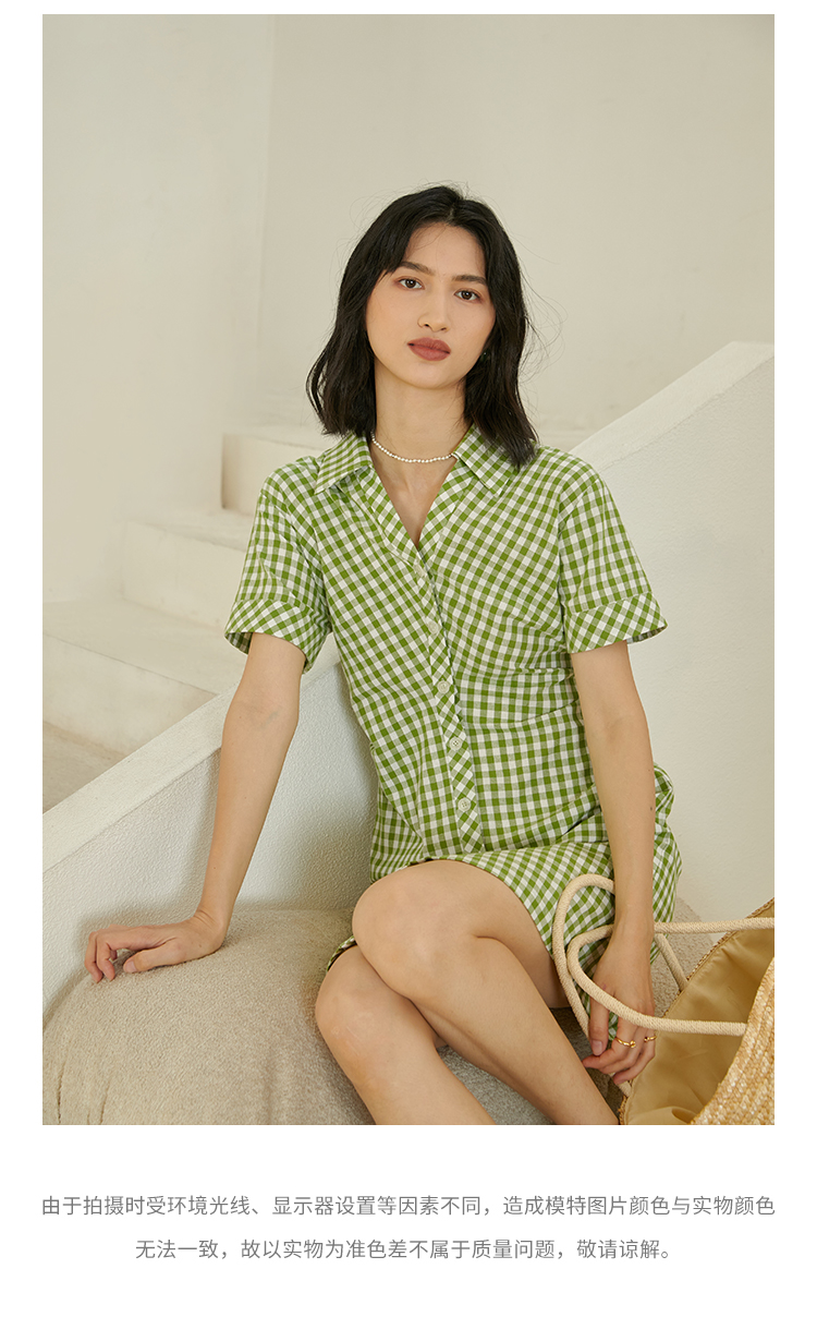 HeyDress法式田园连衣裙女夏季高腰抽褶设计感格纹气质纯棉短裙子