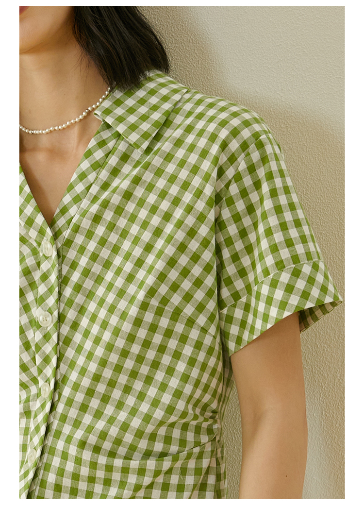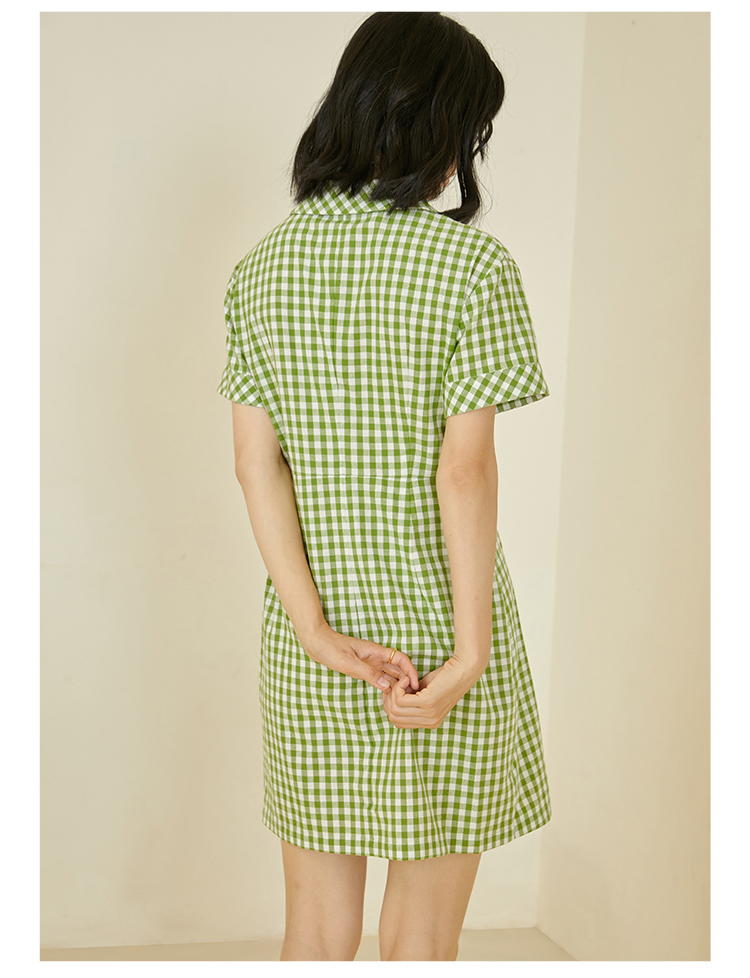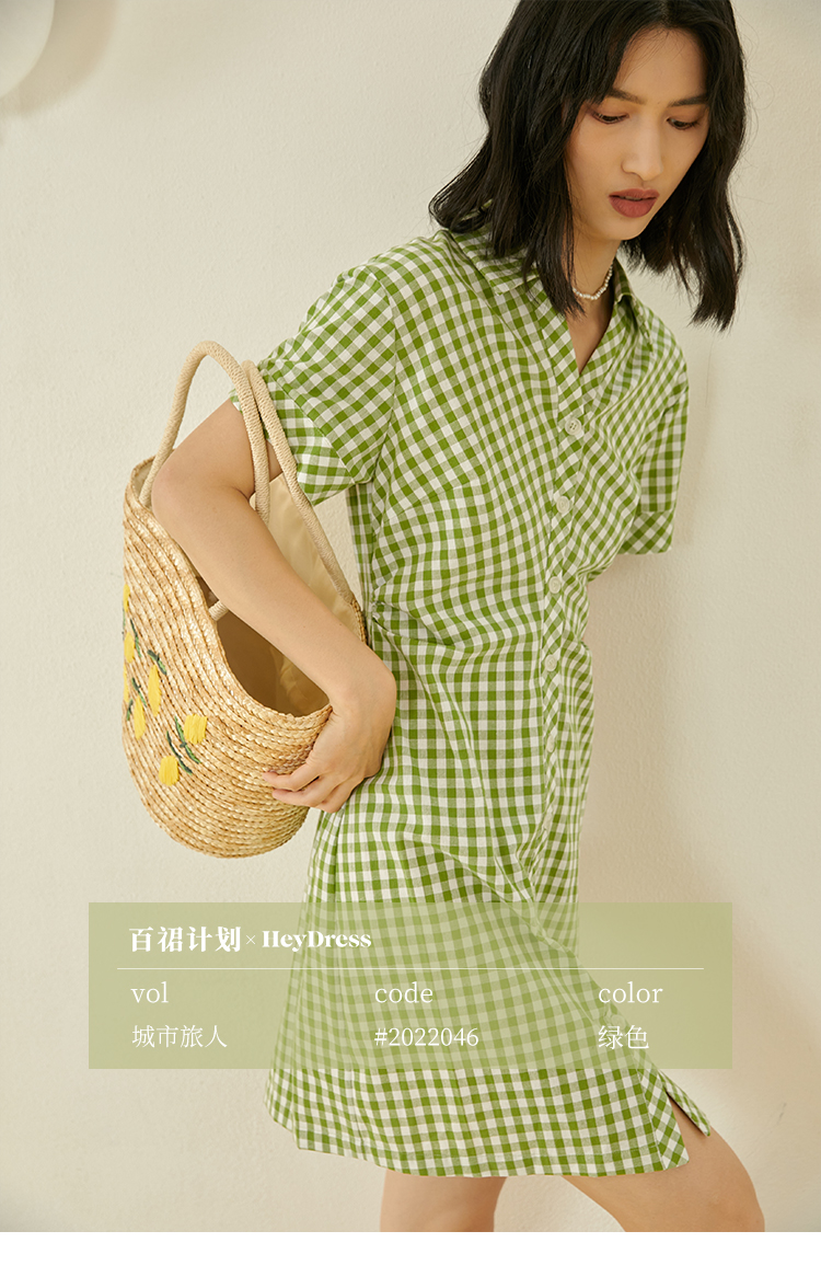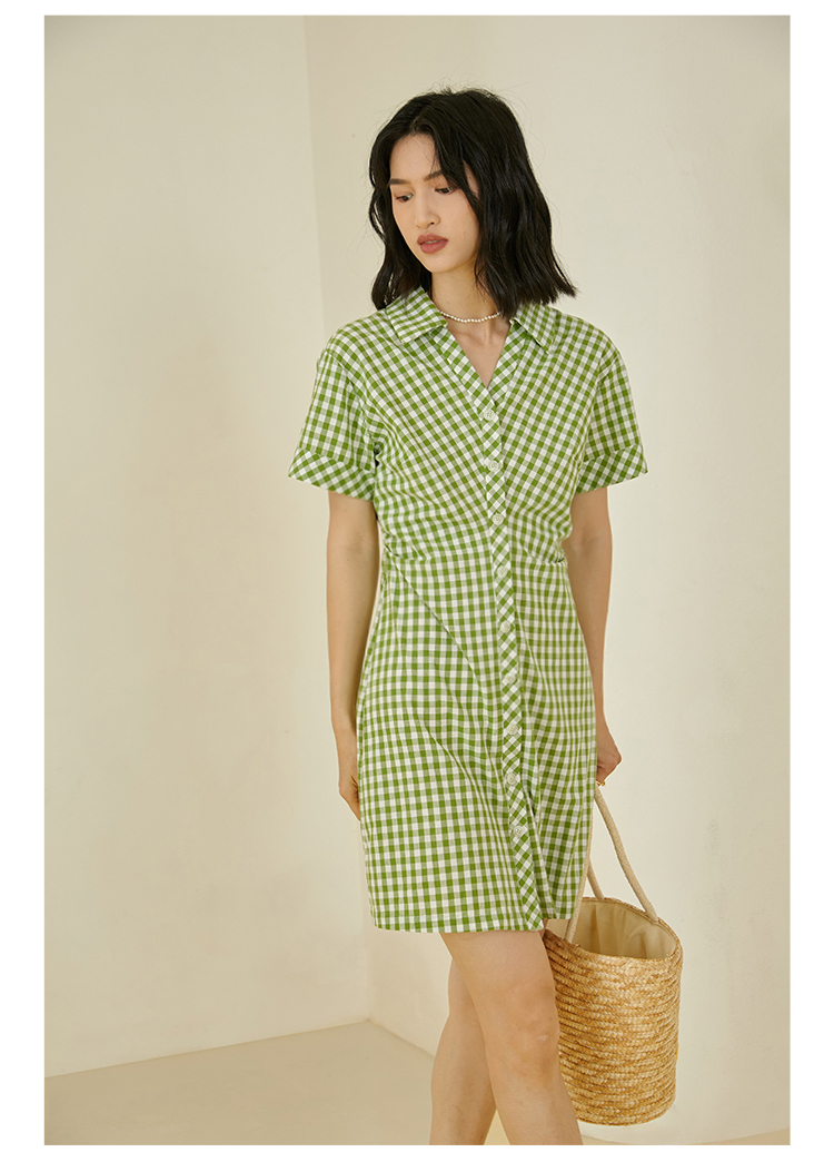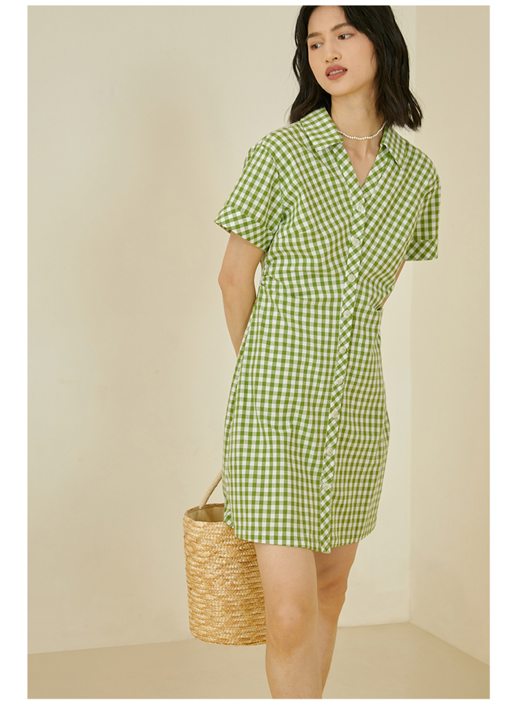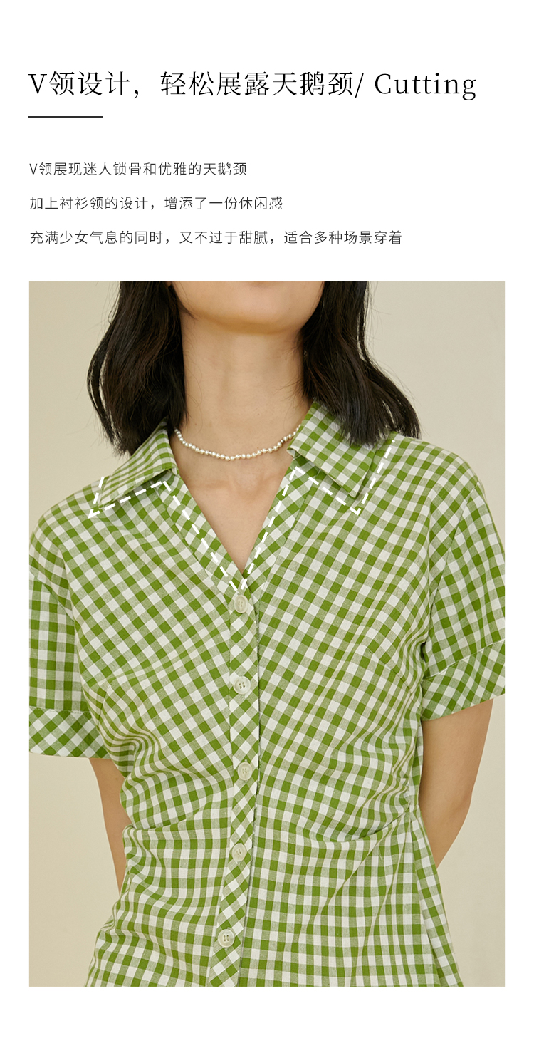 HeyDress法式田园连衣裙女夏季高腰抽褶设计感格纹气质纯棉短裙子