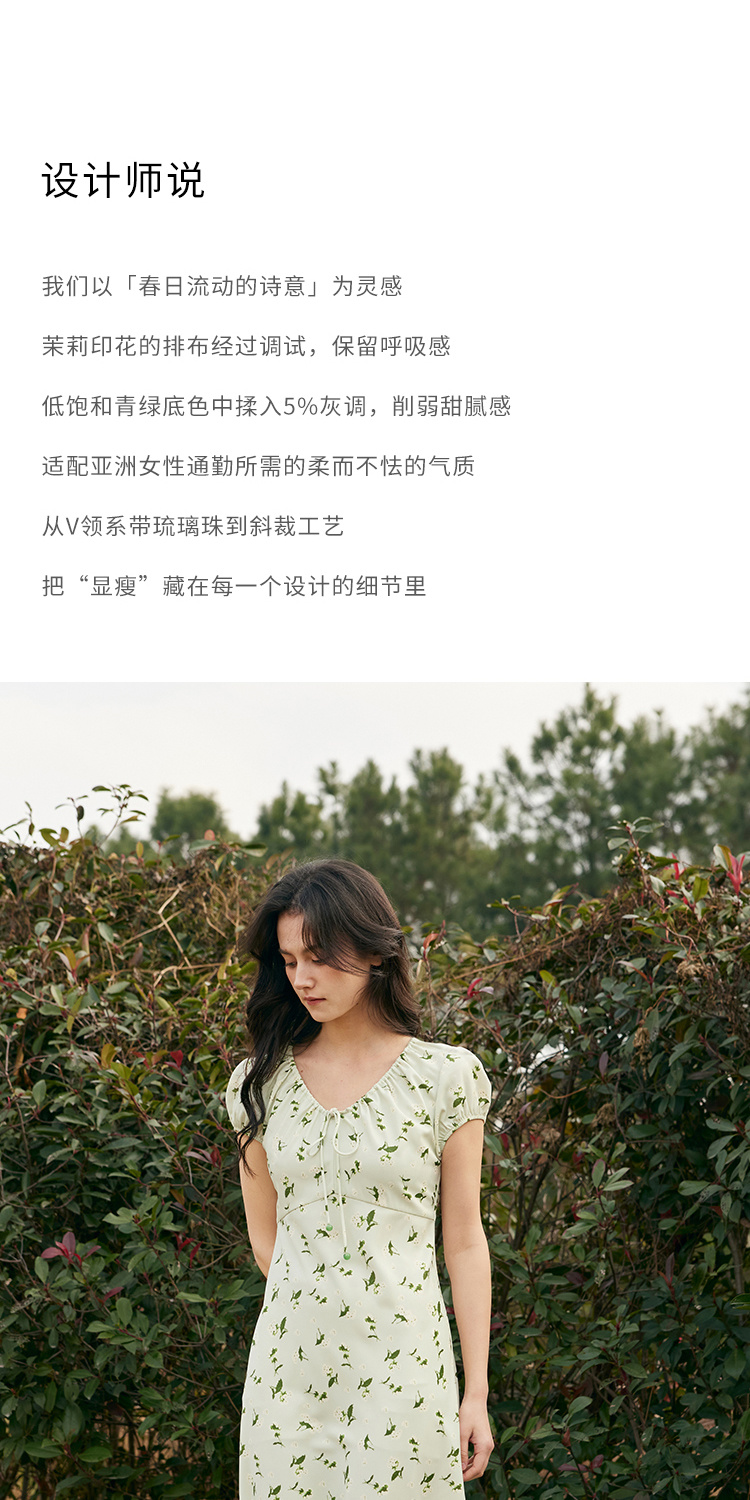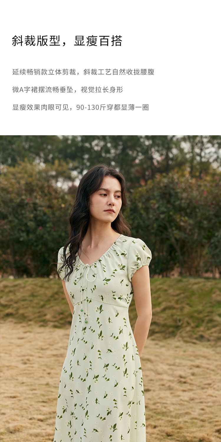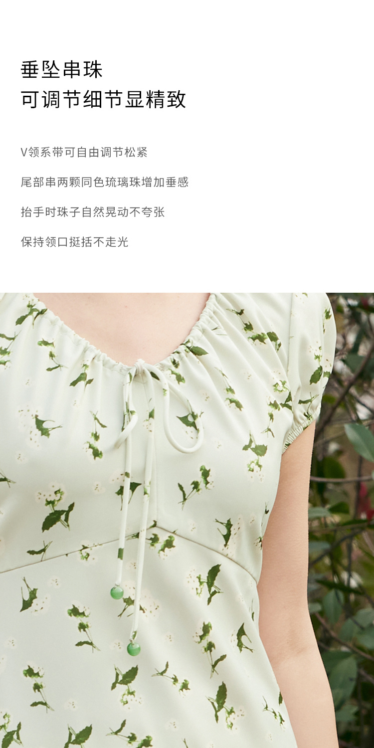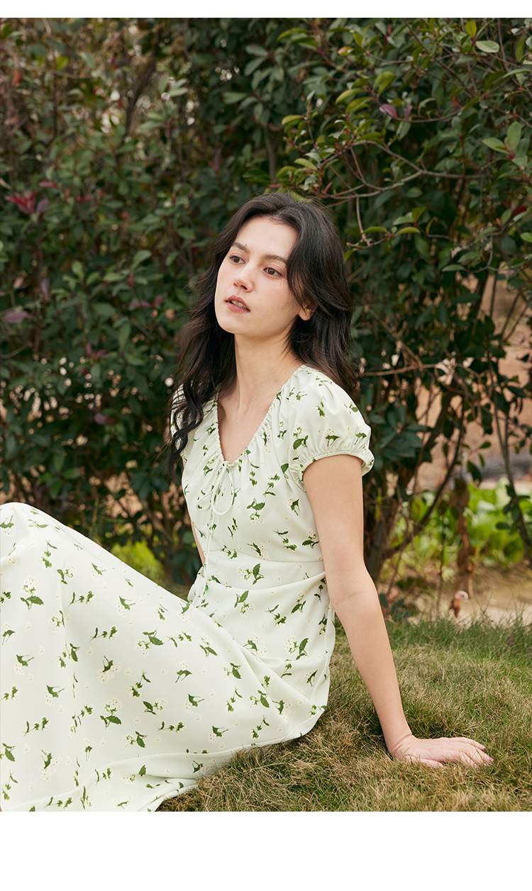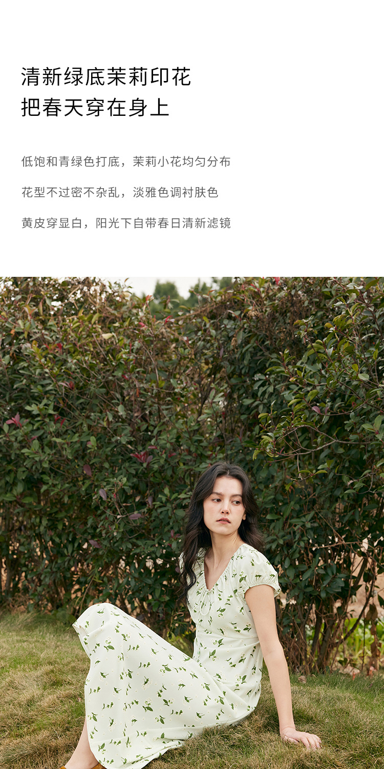 HeyDress法式茉莉印花连衣裙女夏季V领收腰设计浪漫气质度假裙子