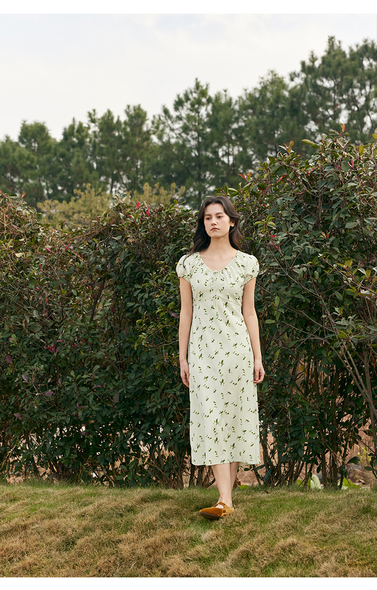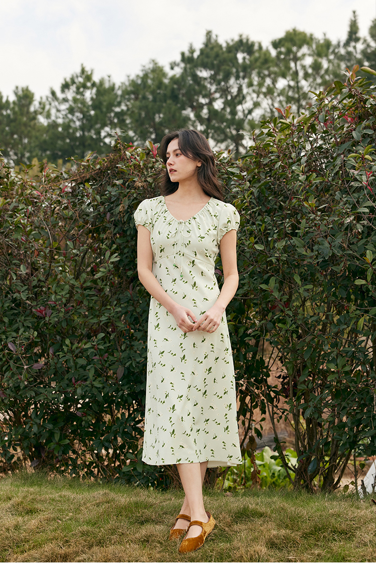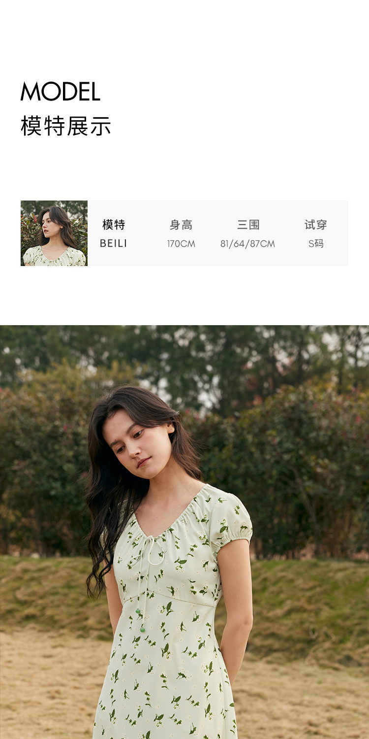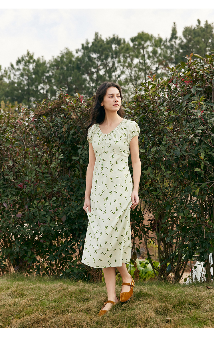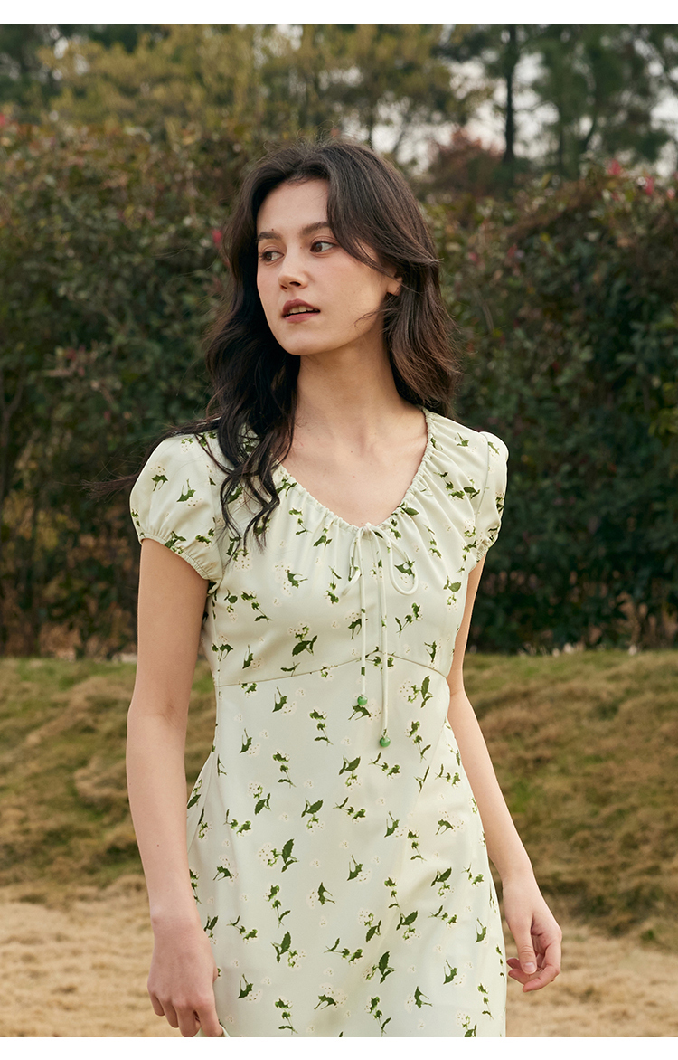 HeyDress法式茉莉印花连衣裙女夏季V领收腰设计浪漫气质度假裙子