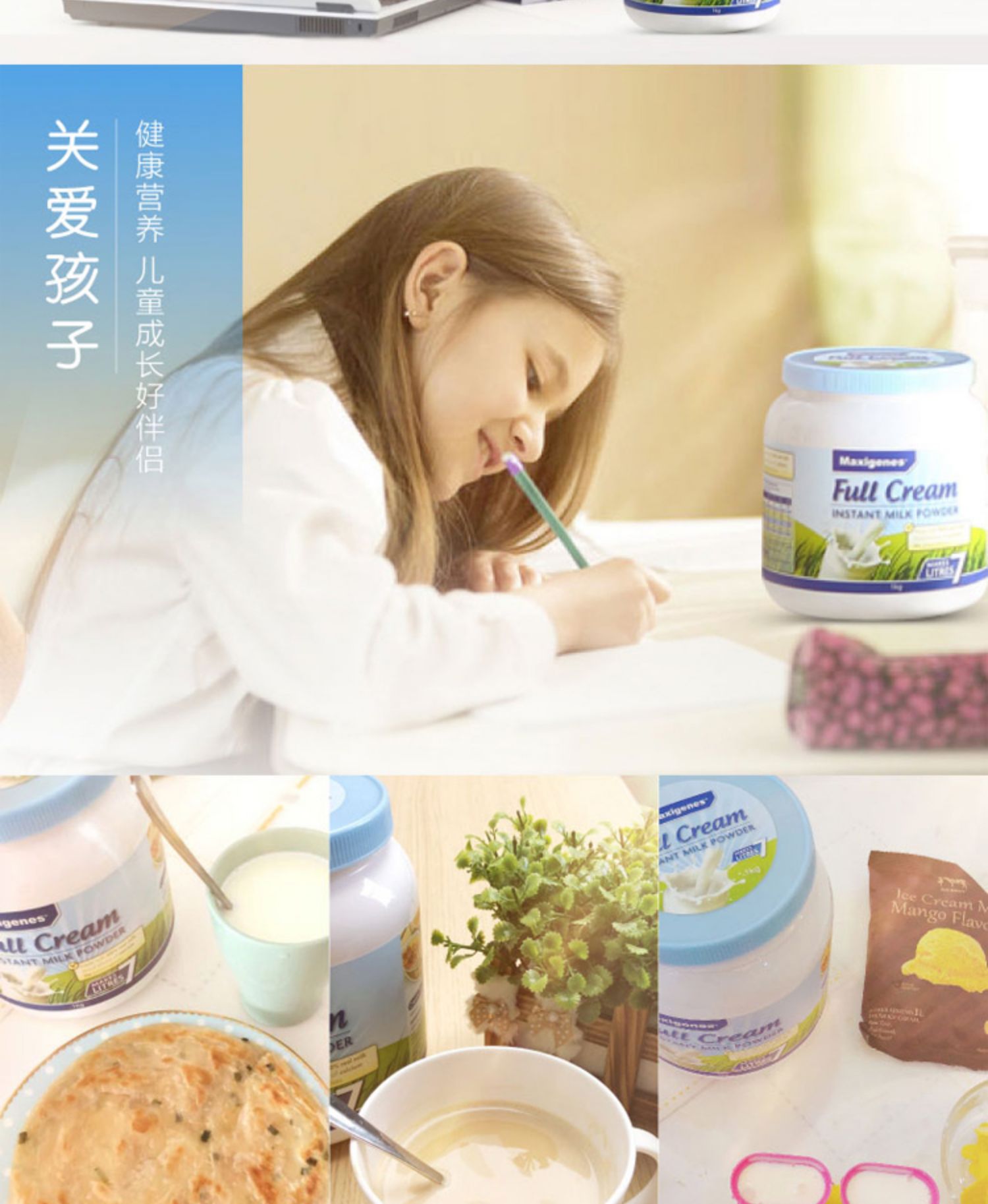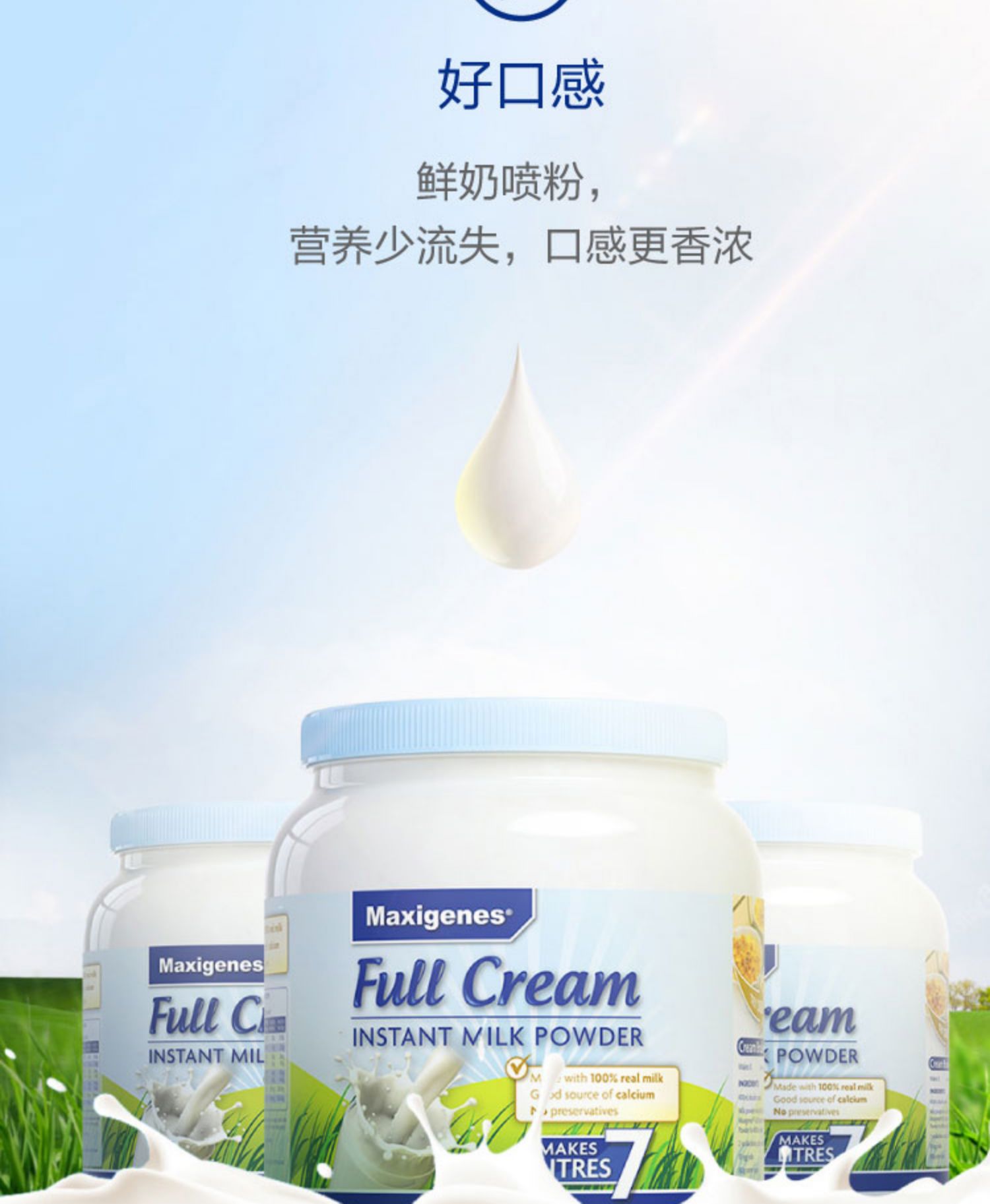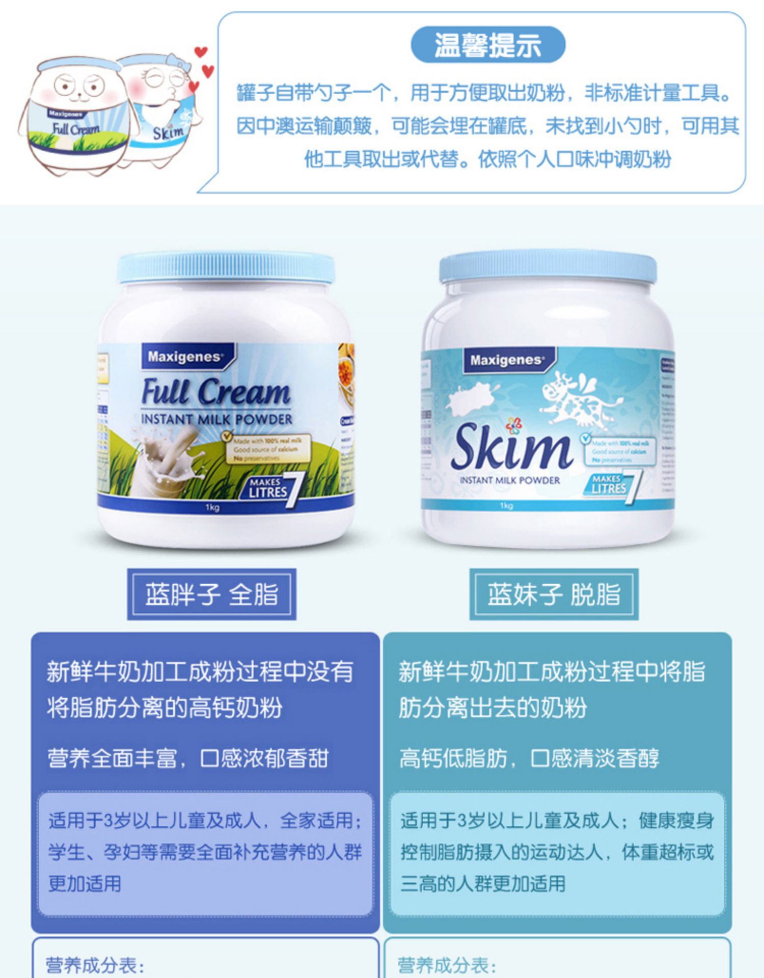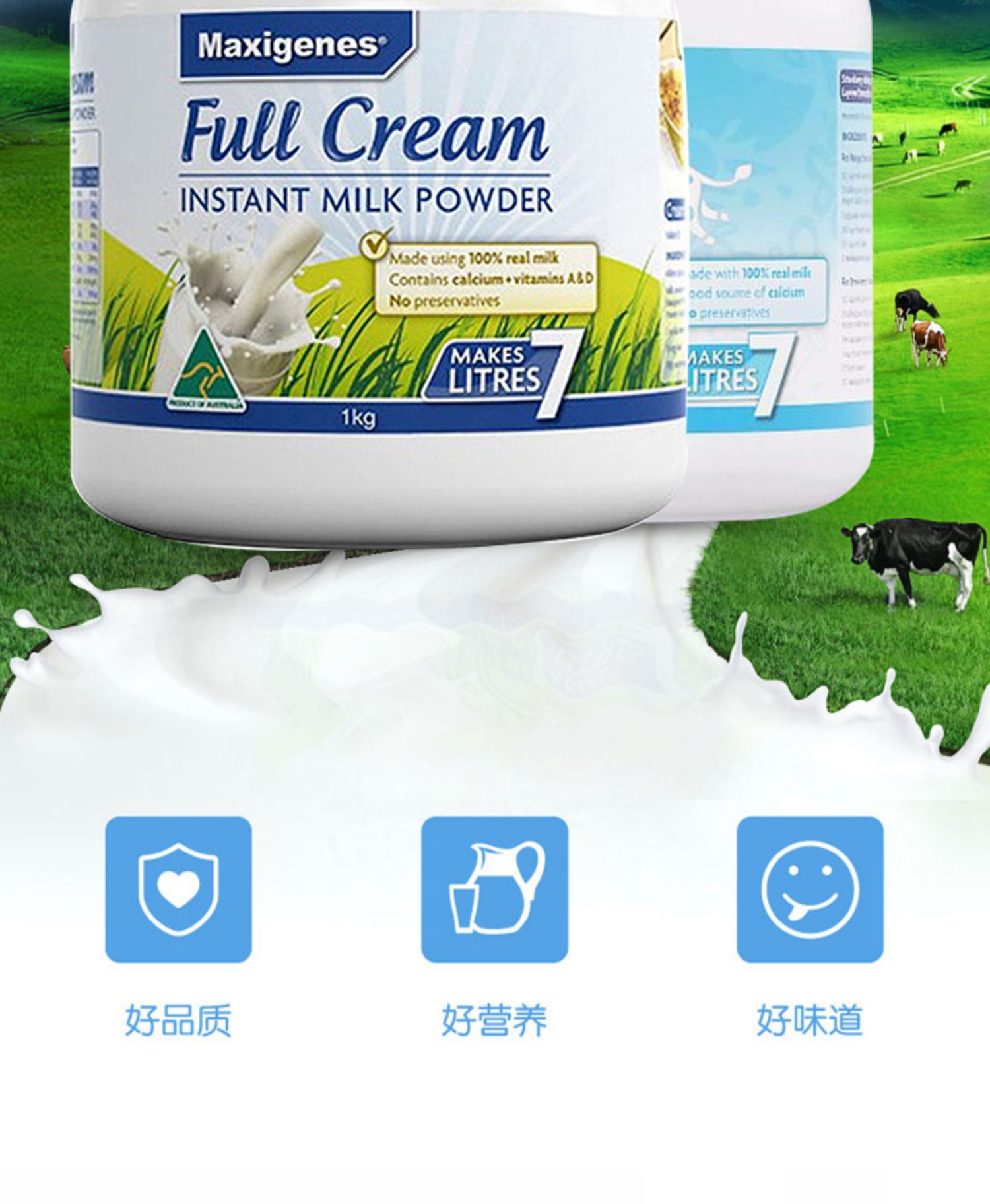 美可卓 Maxigenes 澳洲进口美可卓蓝胖子全脂蓝妹子脱脂牛奶粉学生1kg 跨境购