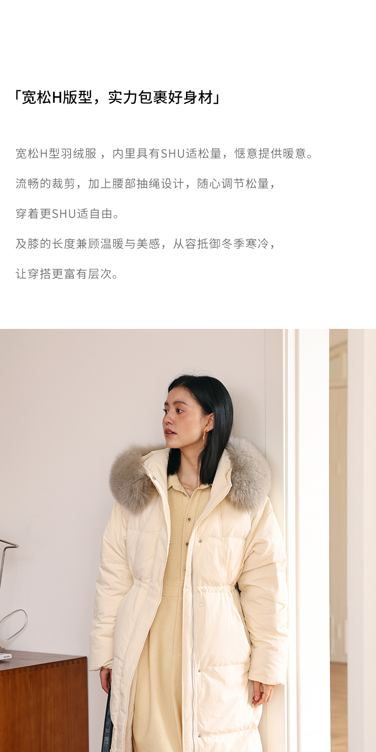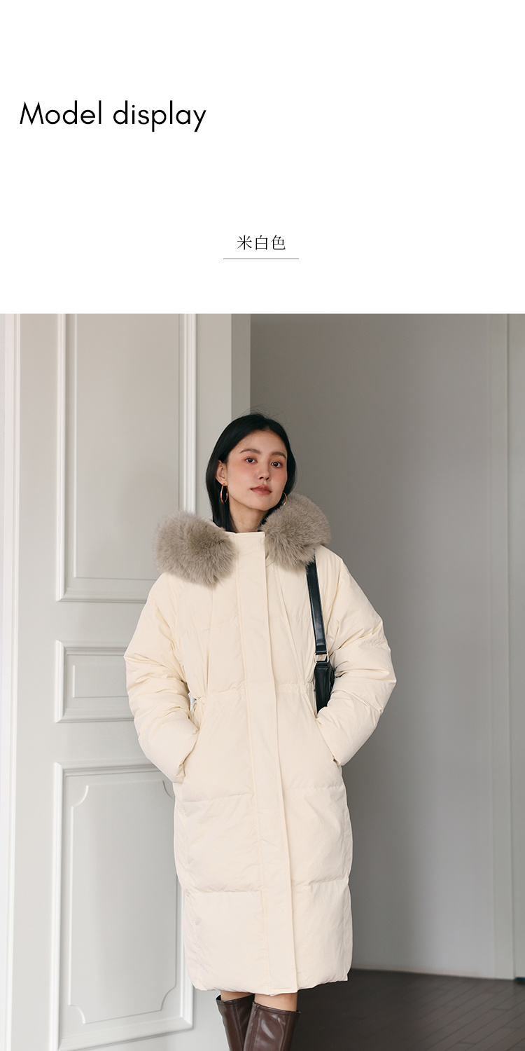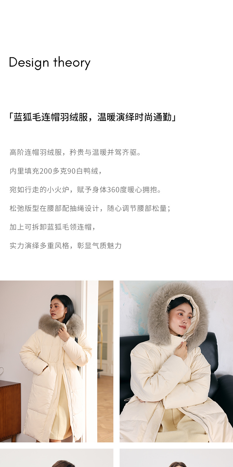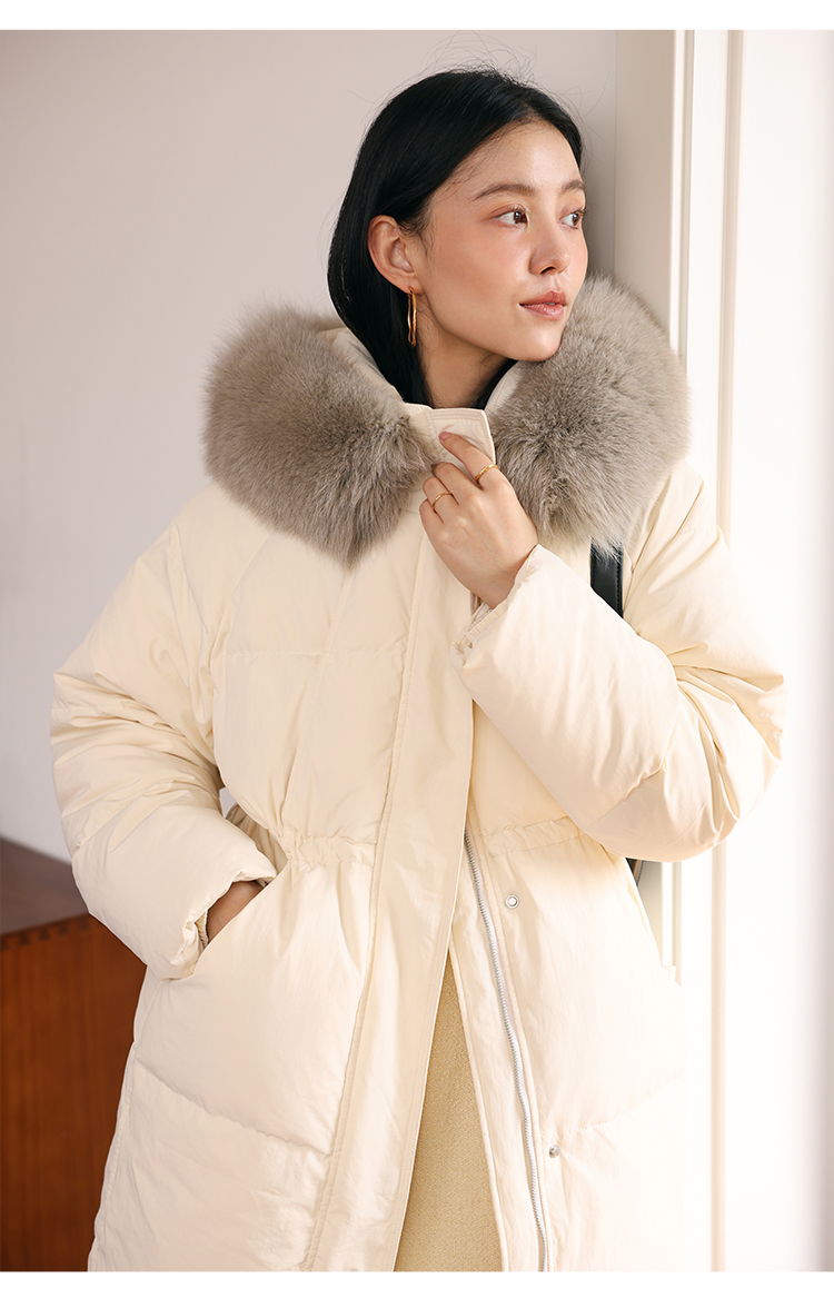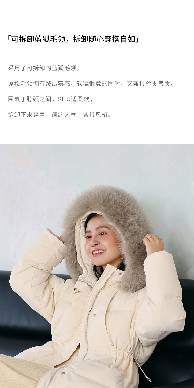 HeyDress蓝狐毛连帽羽绒服女冬季宽松收腰高克重白鸭绒中长款外套