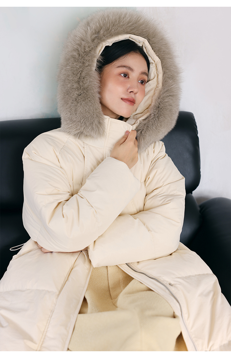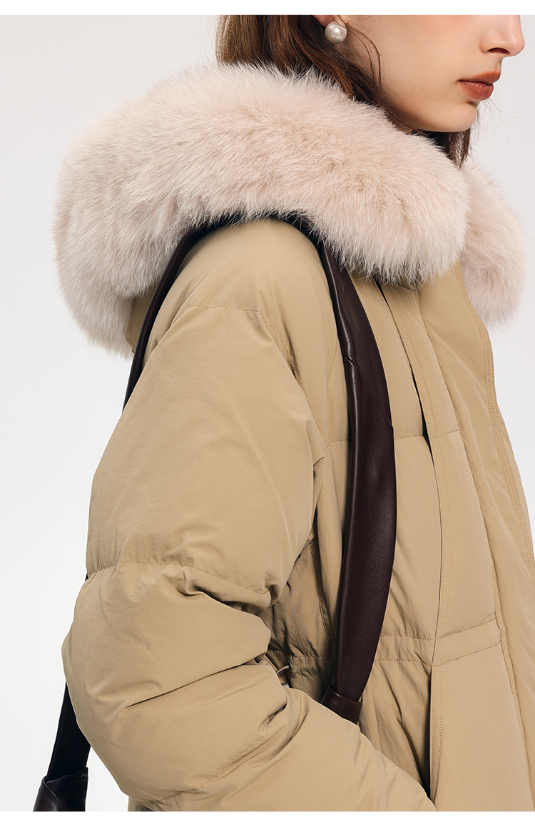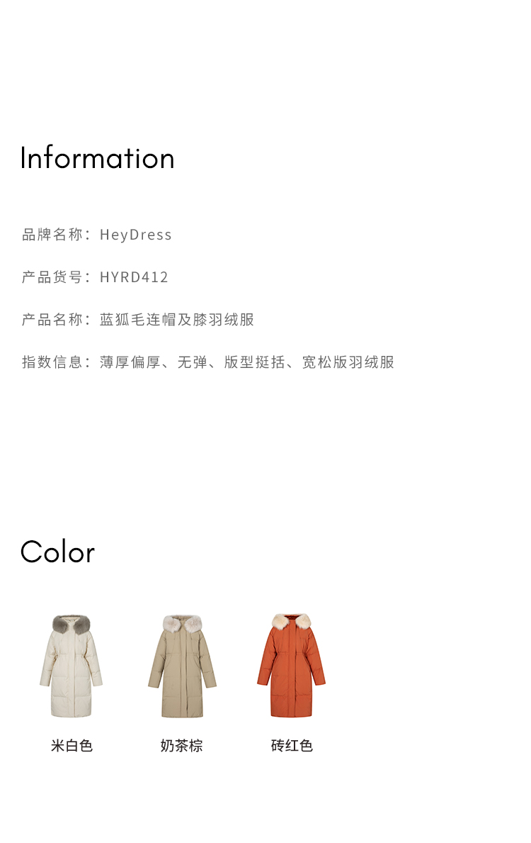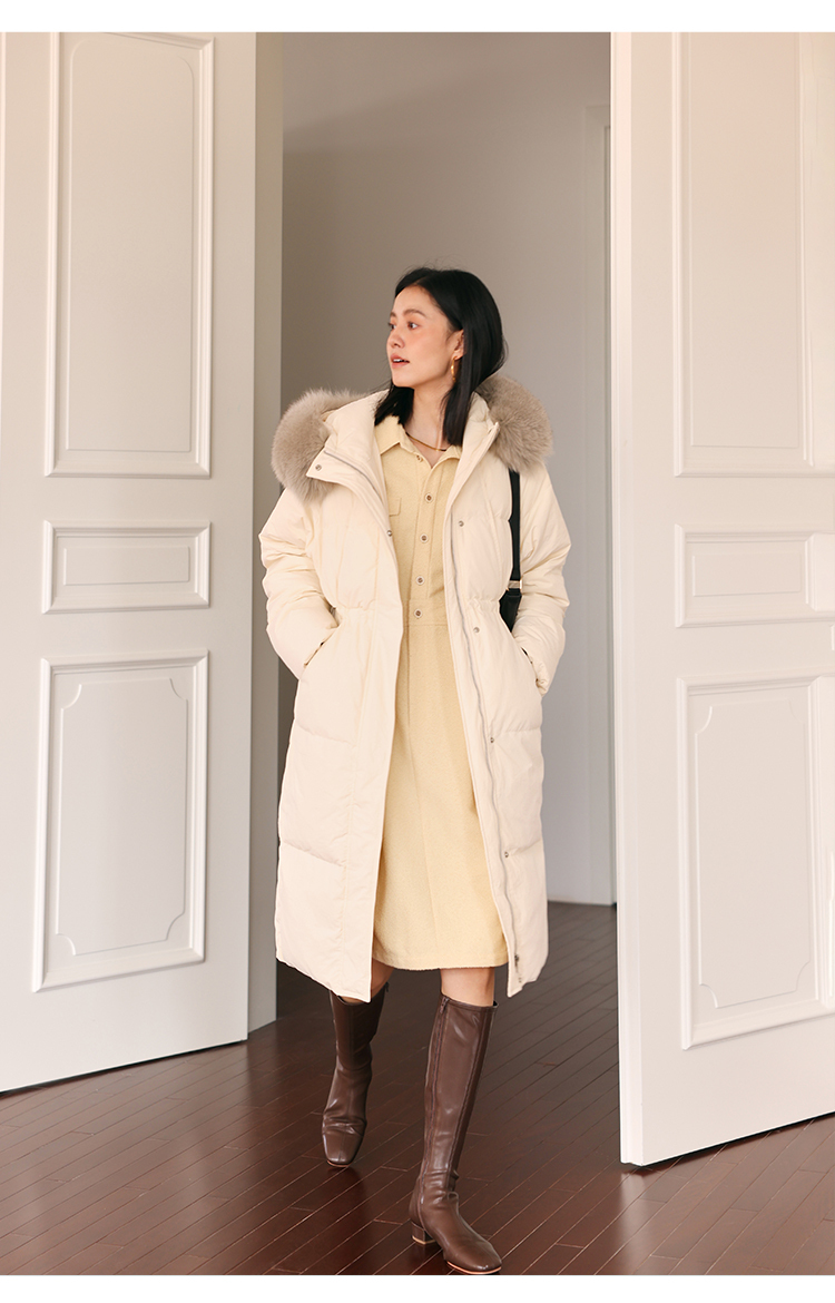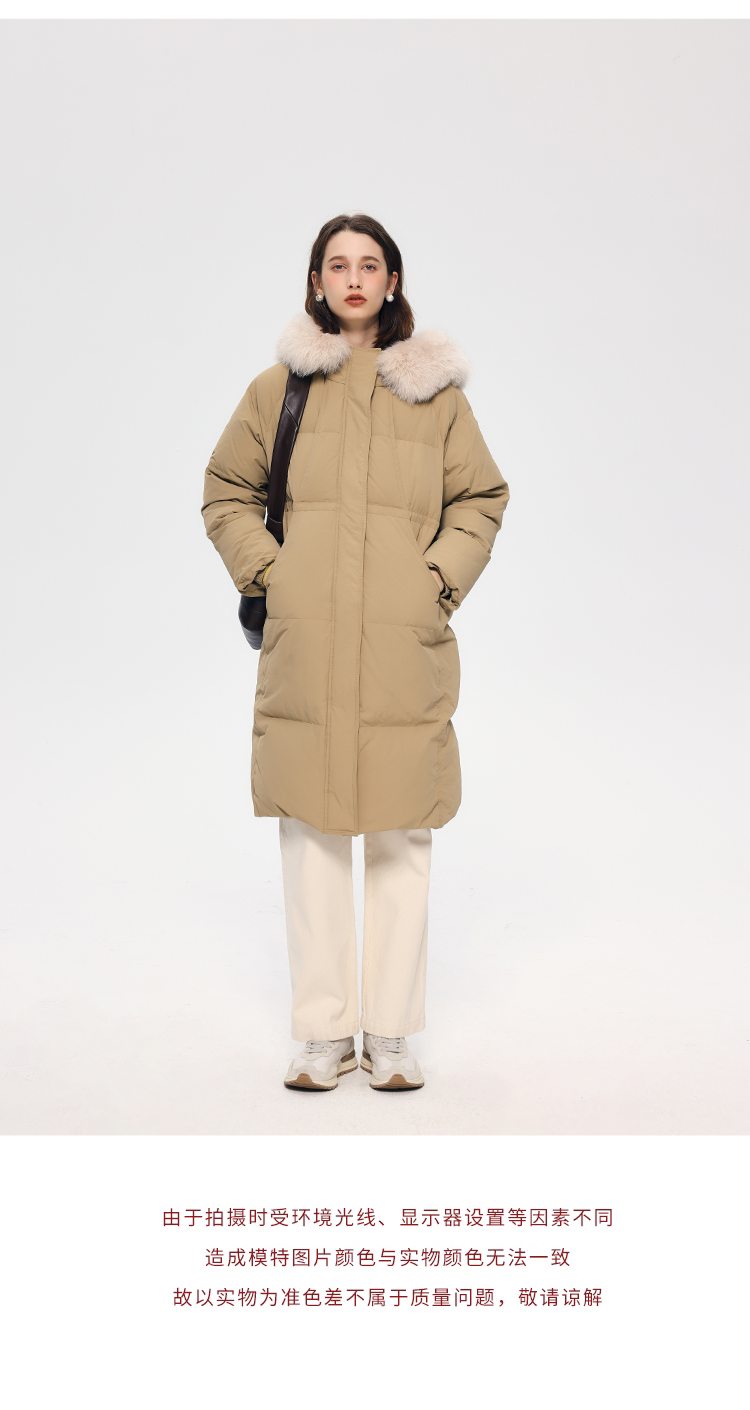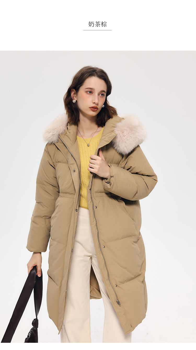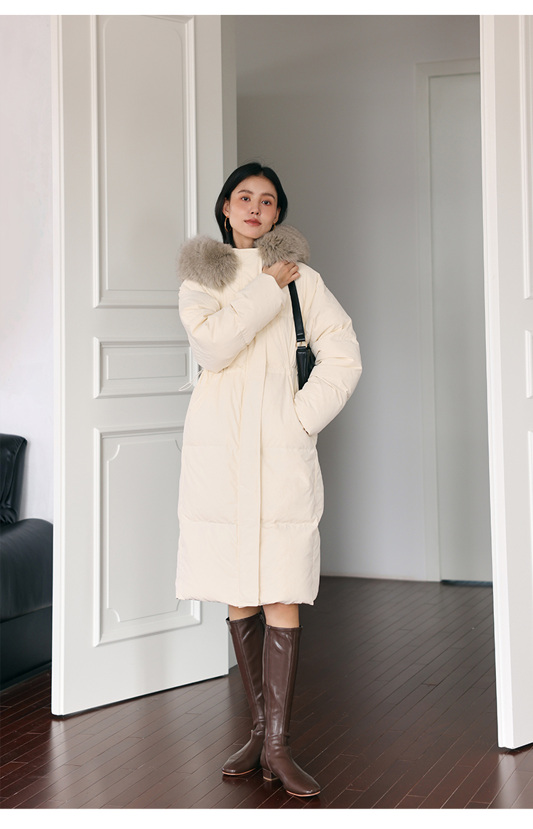HeyDress蓝狐毛连帽羽绒服女冬季宽松收腰高克重白鸭绒中长款外套
