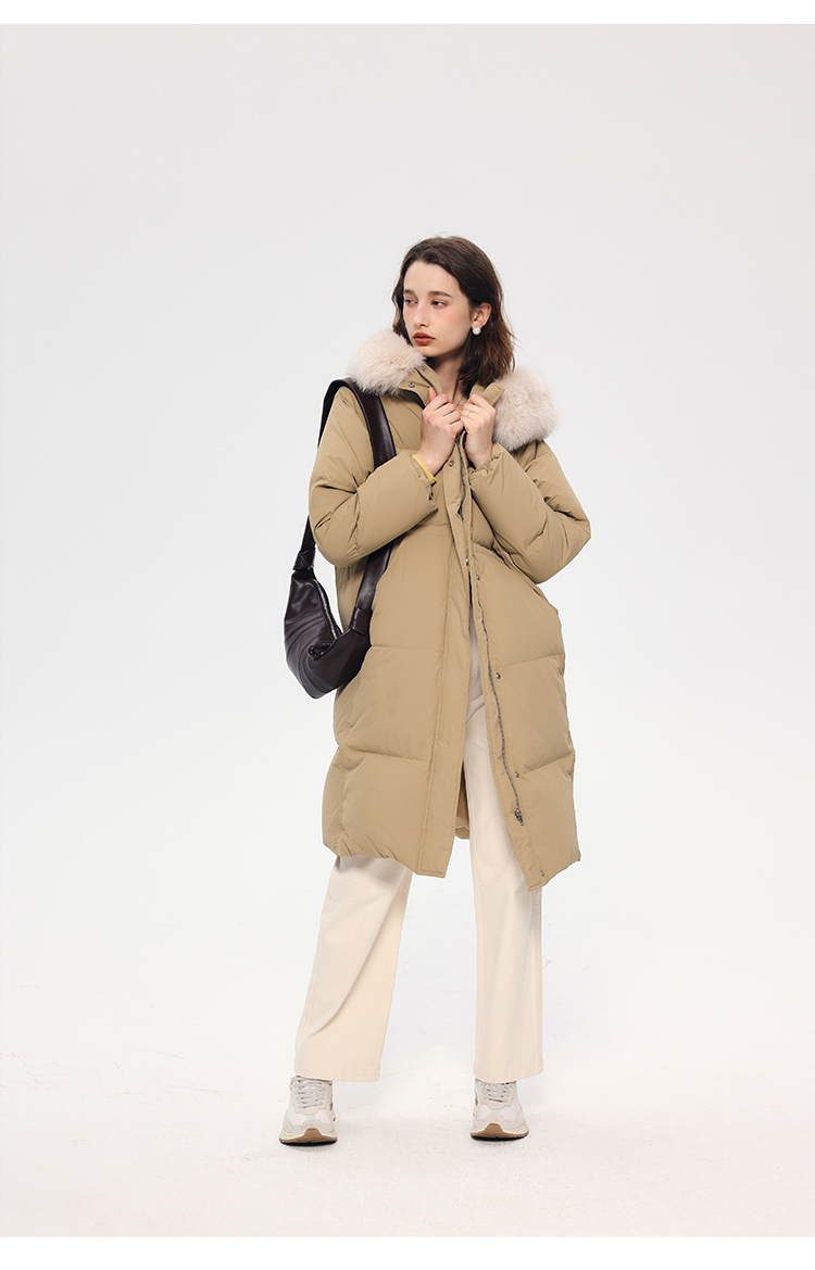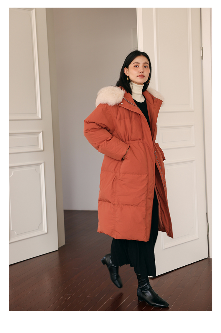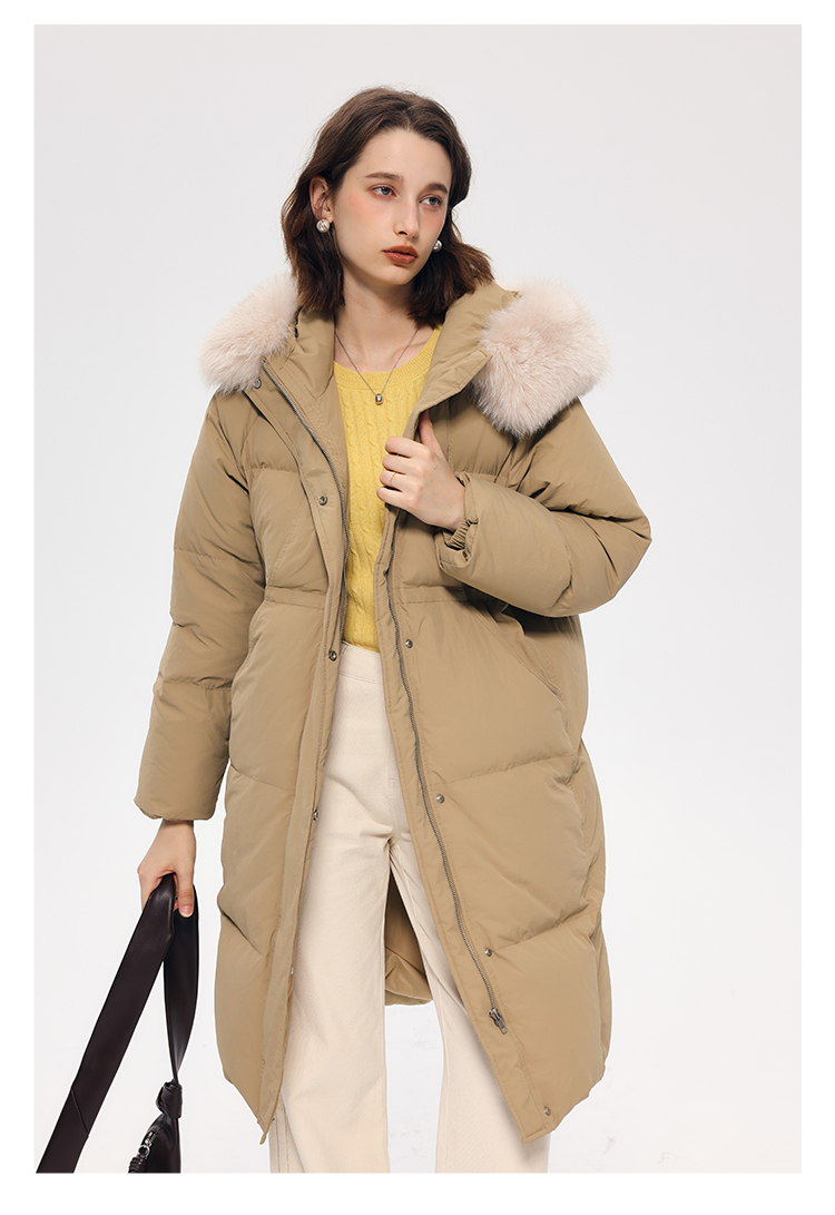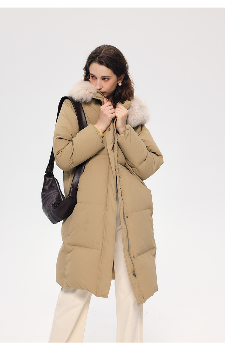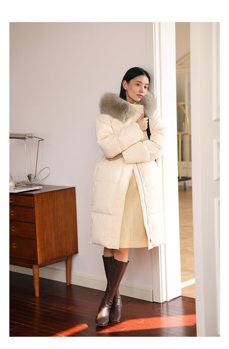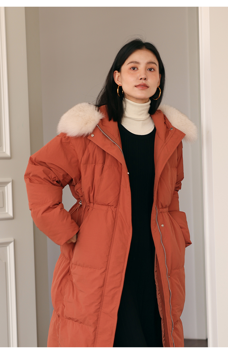 HeyDress蓝狐毛连帽羽绒服女冬季宽松收腰高克重白鸭绒中长款外套