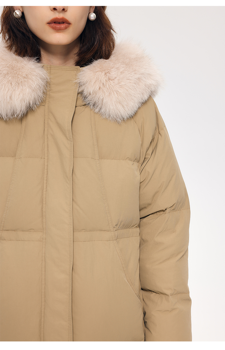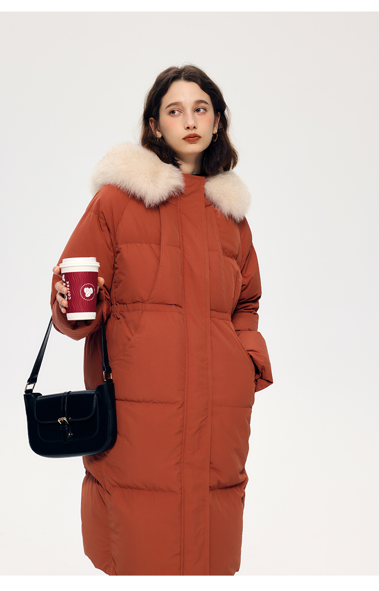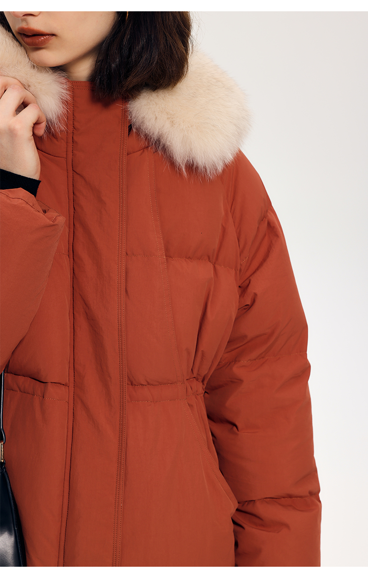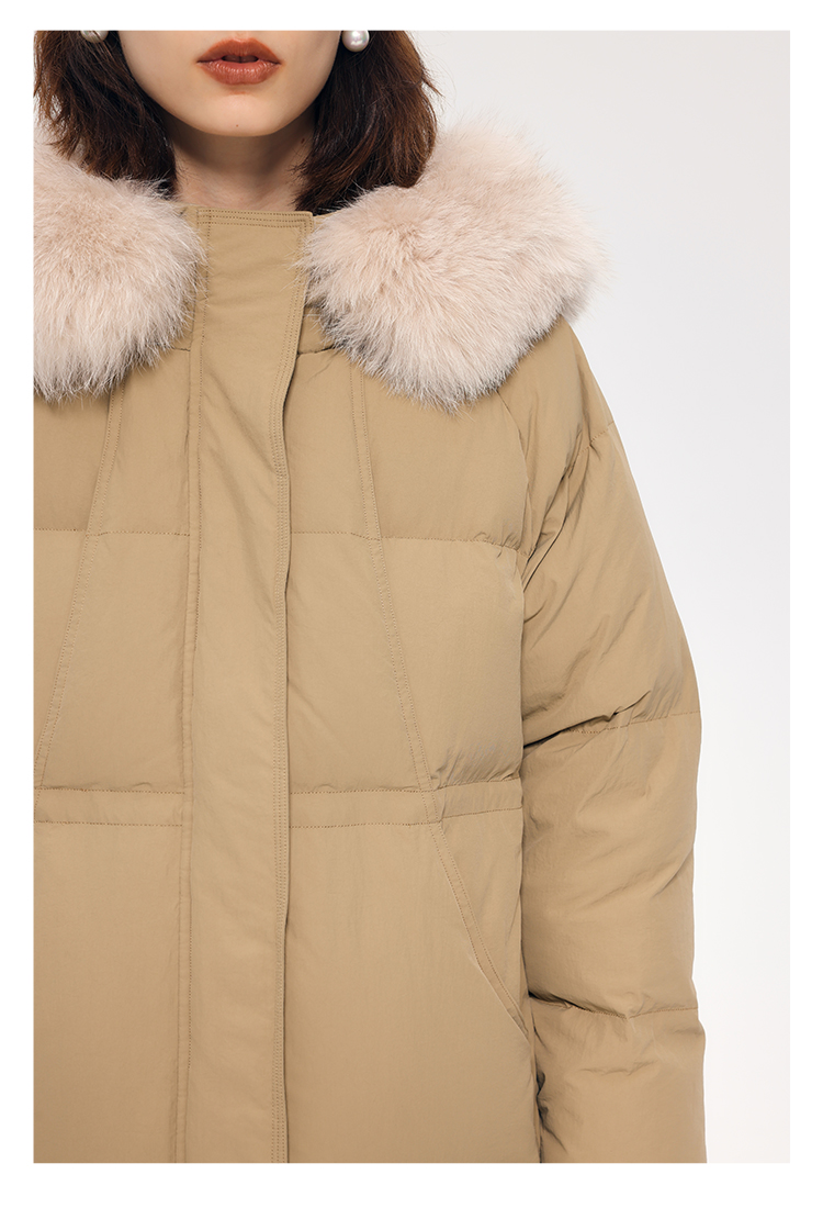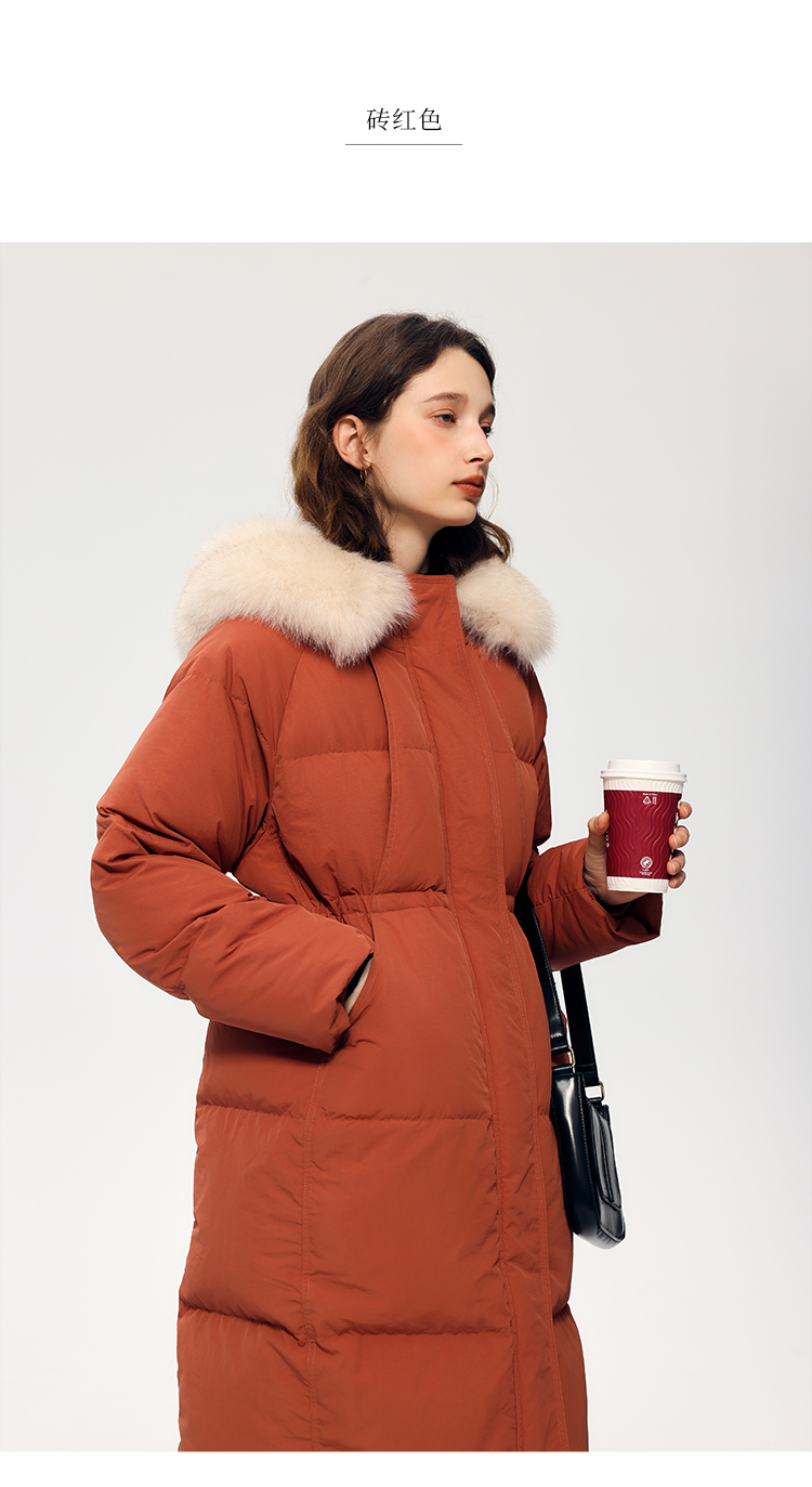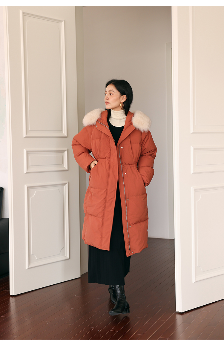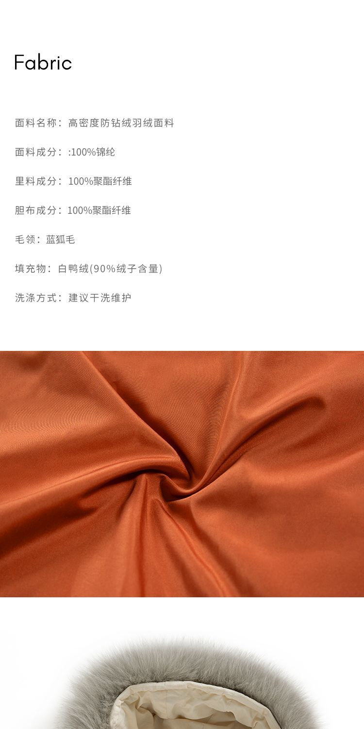 HeyDress蓝狐毛连帽羽绒服女冬季宽松收腰高克重白鸭绒中长款外套