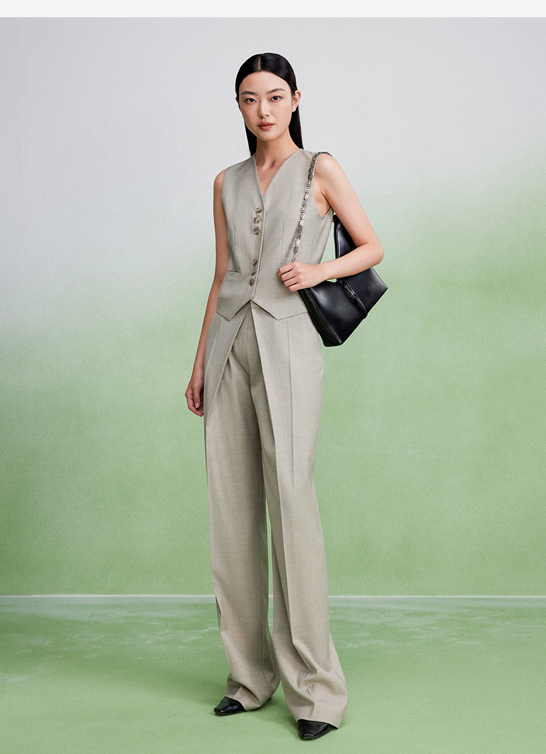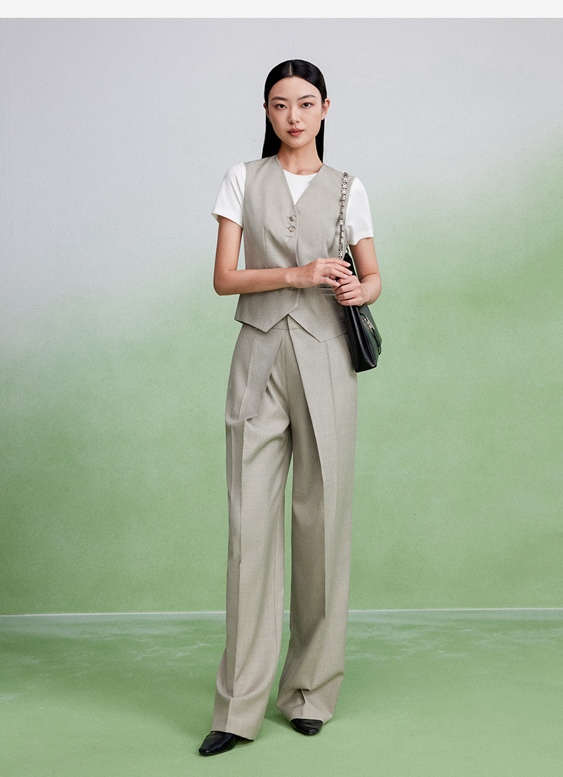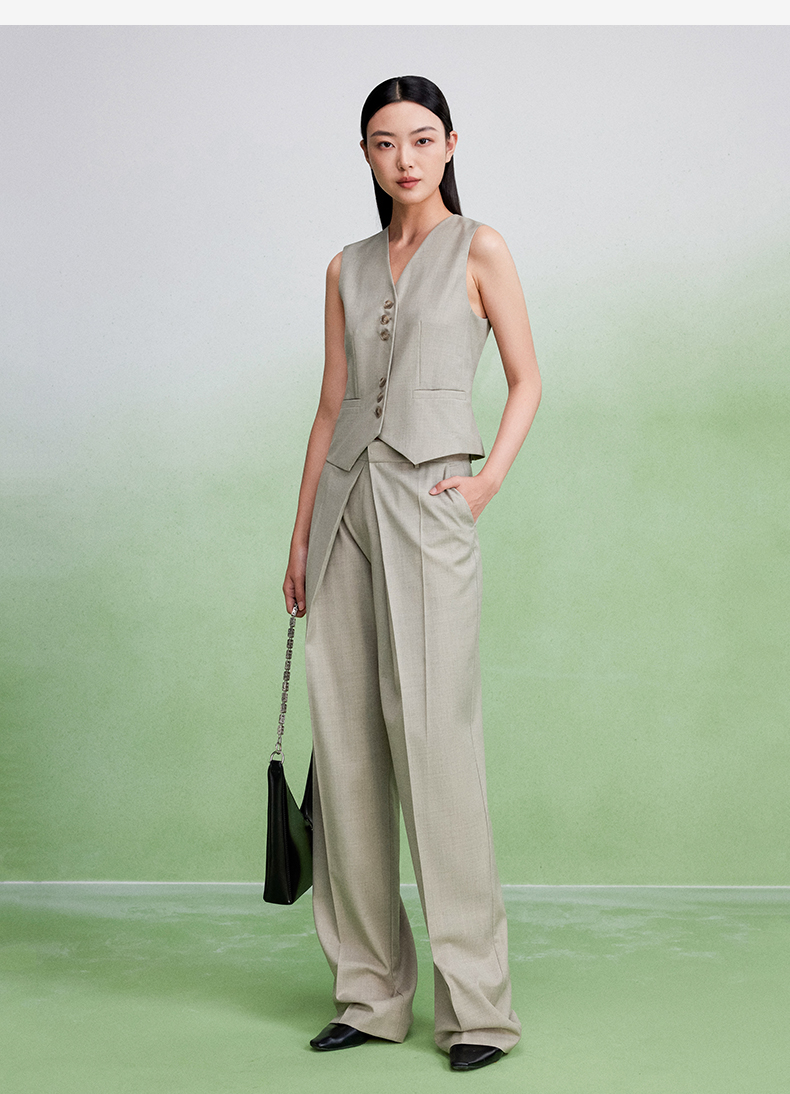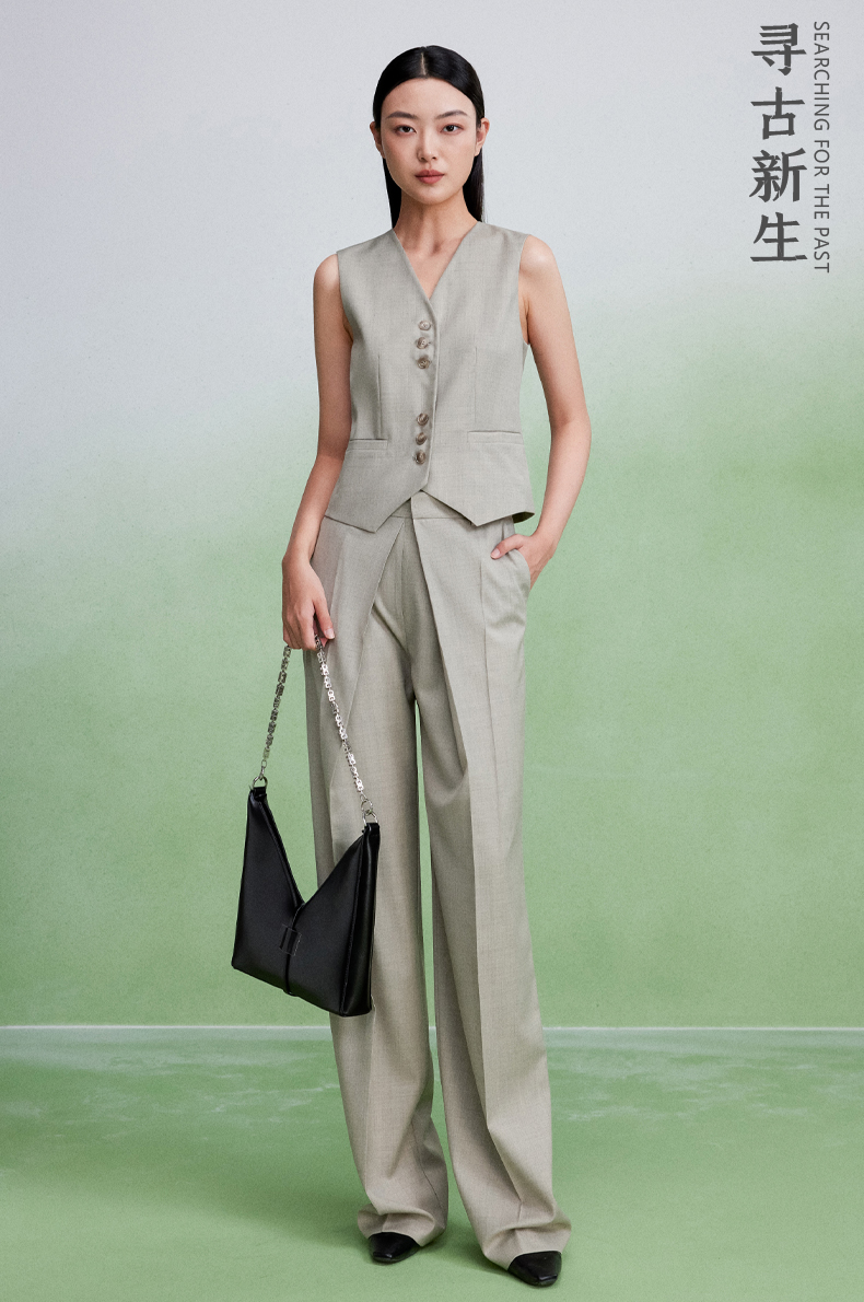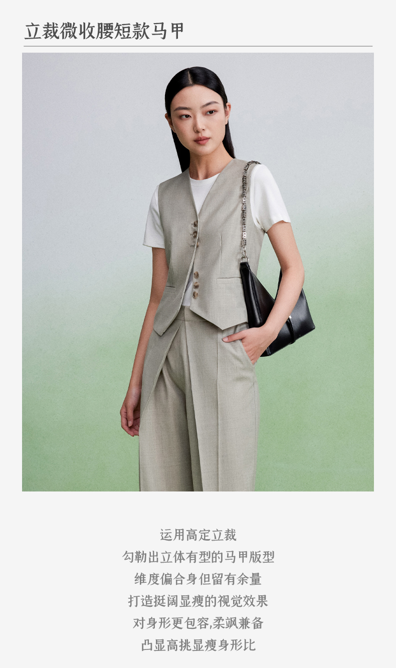 【清仓】西嘉老钱风马甲套装|混色肌理精纺羊毛经典无领马甲+对褶显瘦阔腿裤MJ2403009