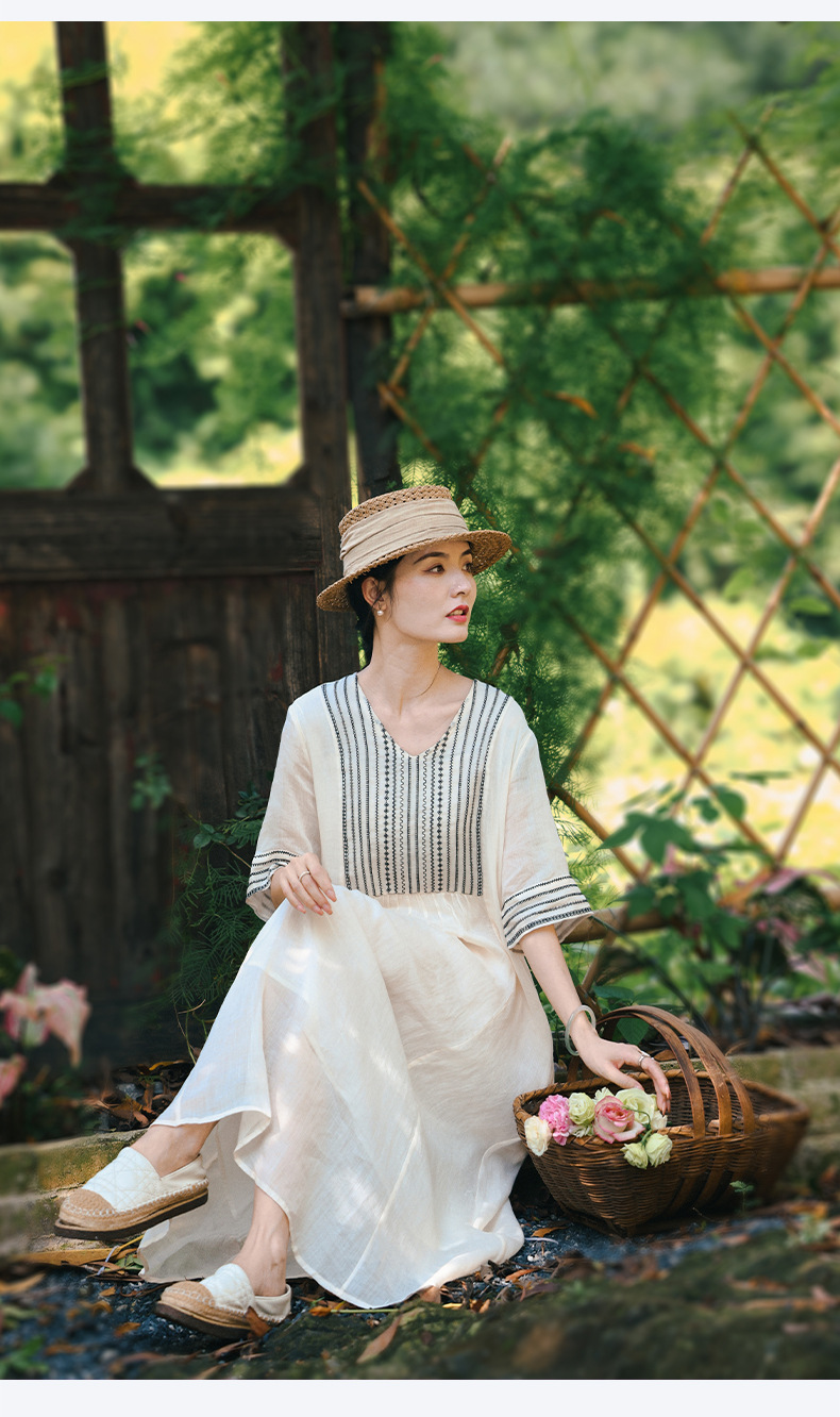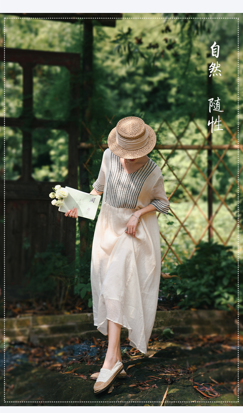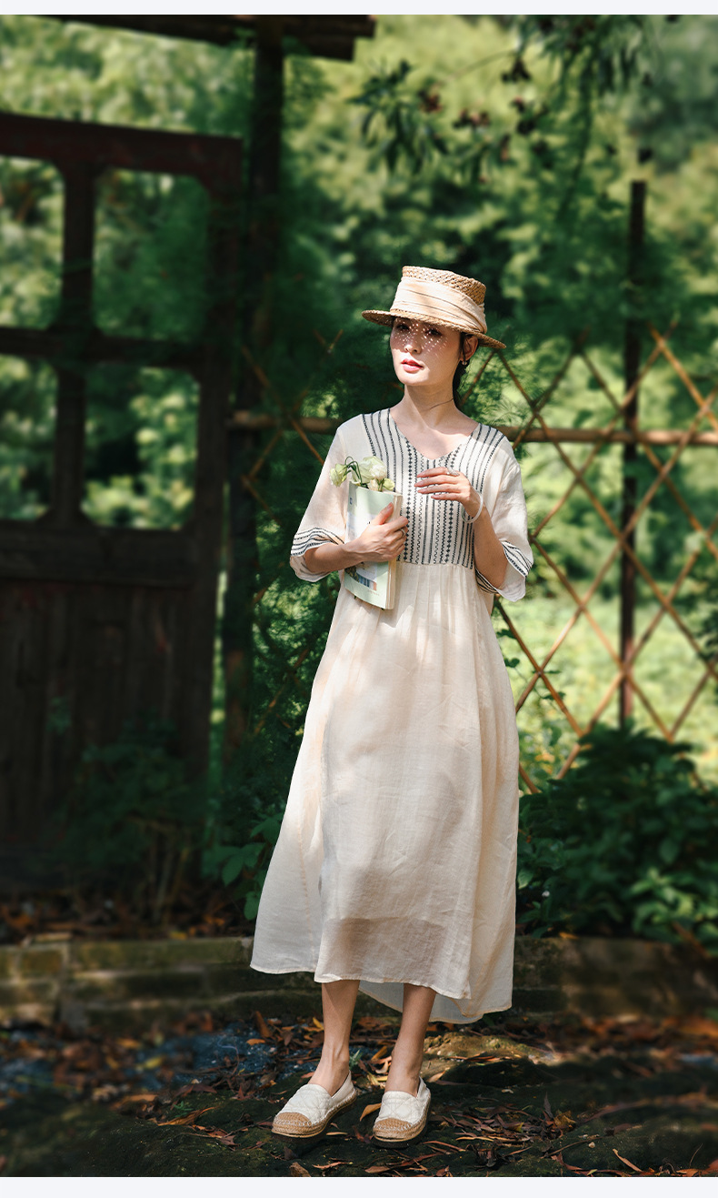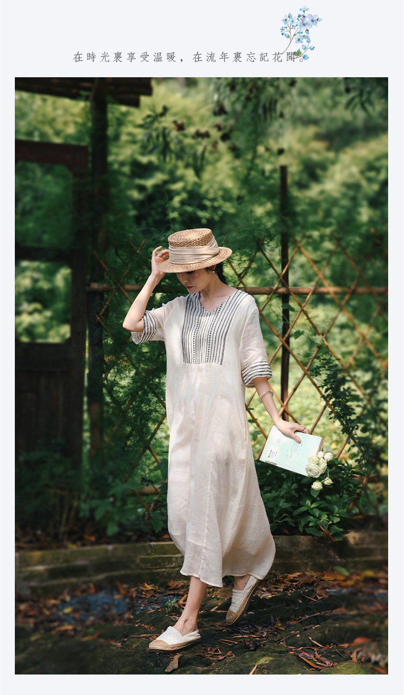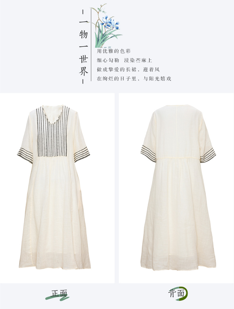 HM-S490高品质苎麻刺绣民族风连衣裙棉麻显瘦文艺夏季宽松气质大摆裙长裙
