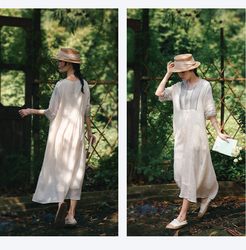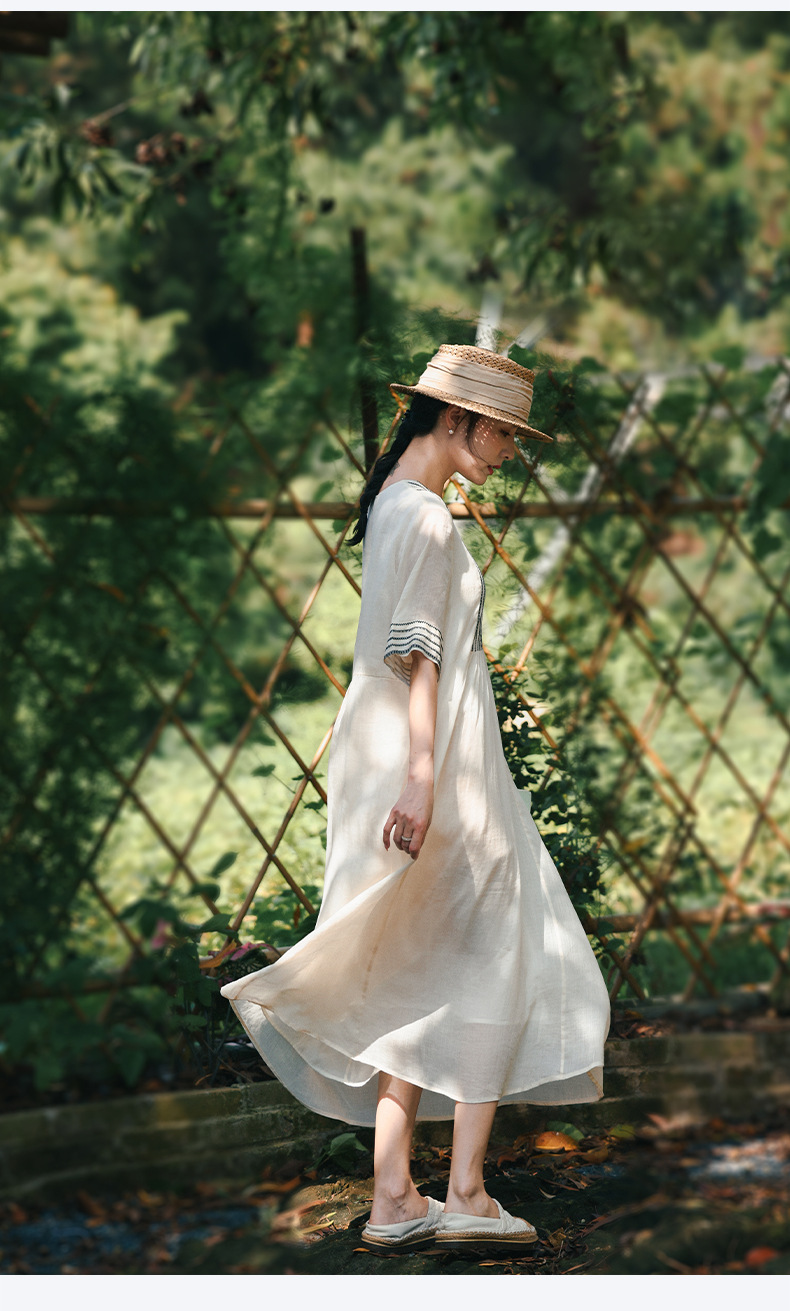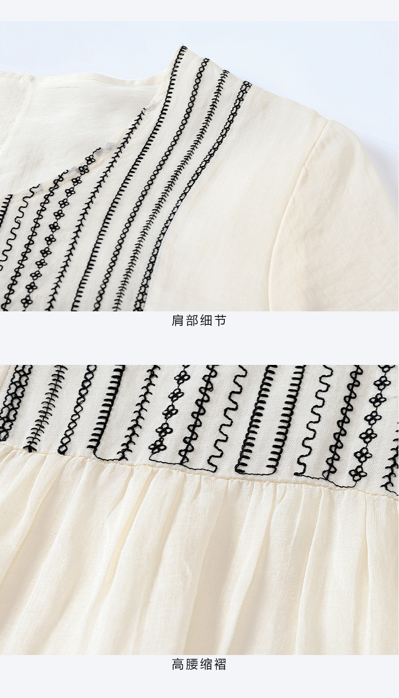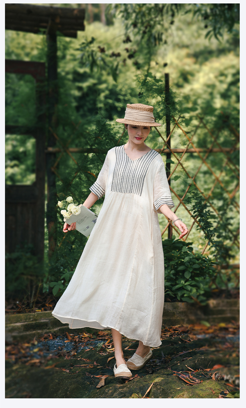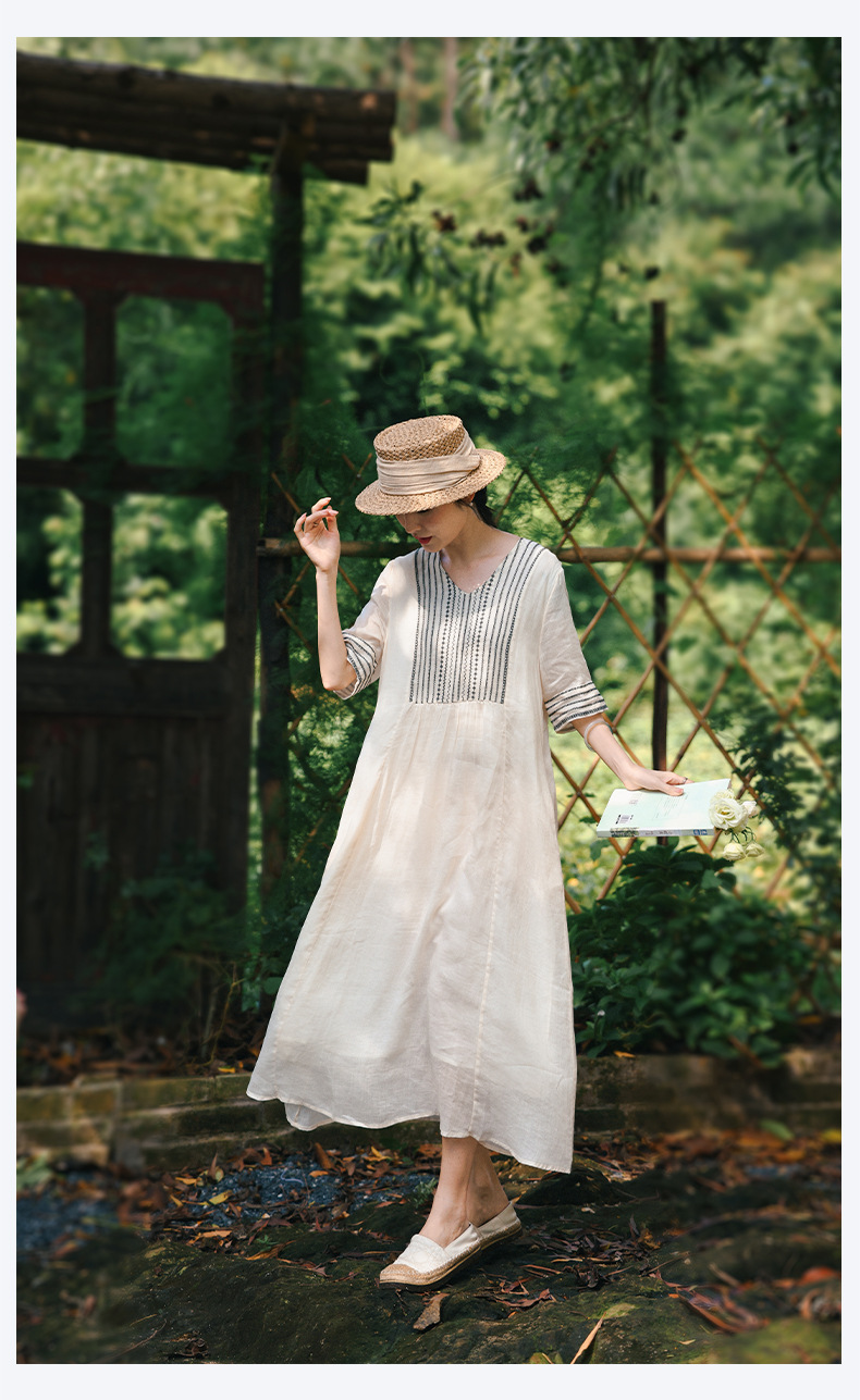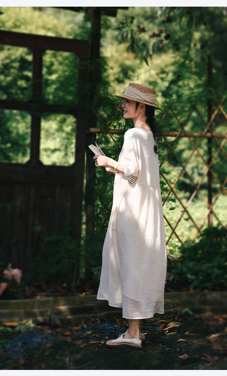 HM-S490高品质苎麻刺绣民族风连衣裙棉麻显瘦文艺夏季宽松气质大摆裙长裙