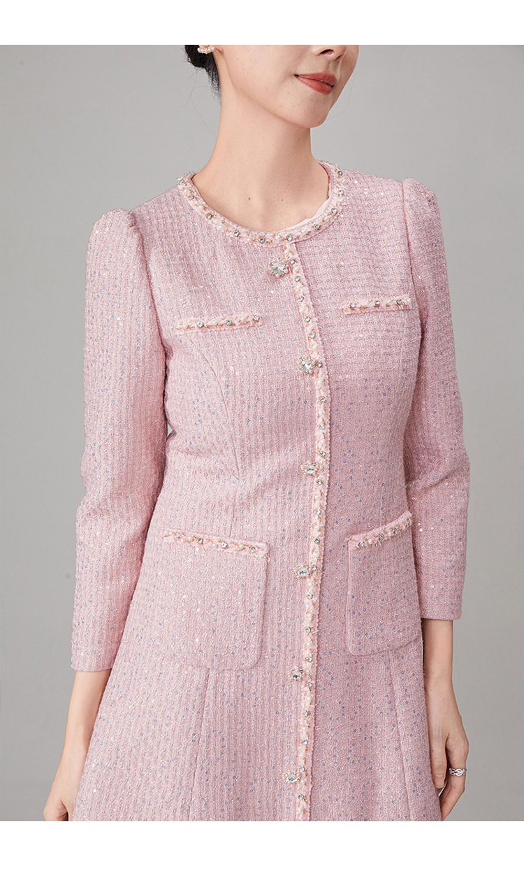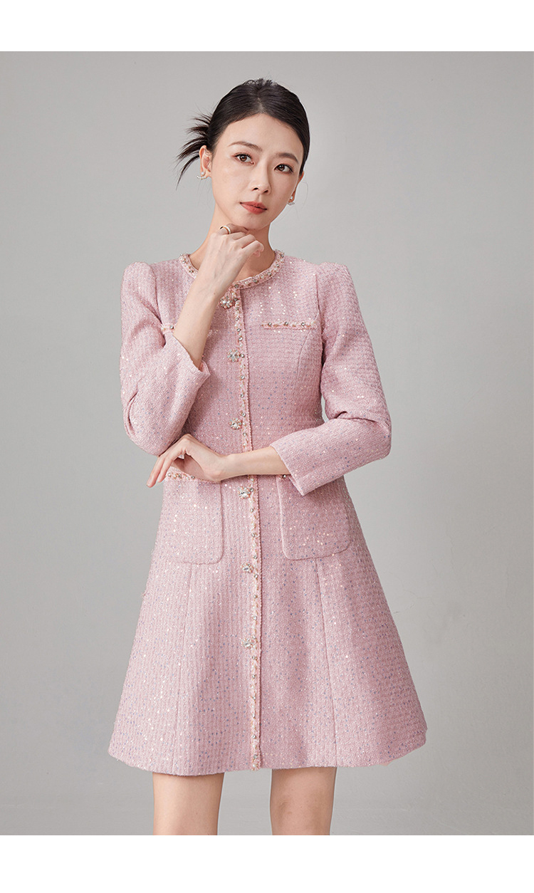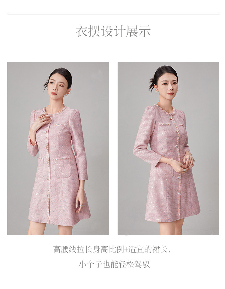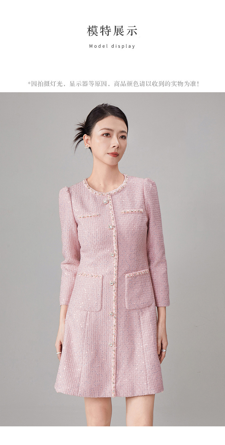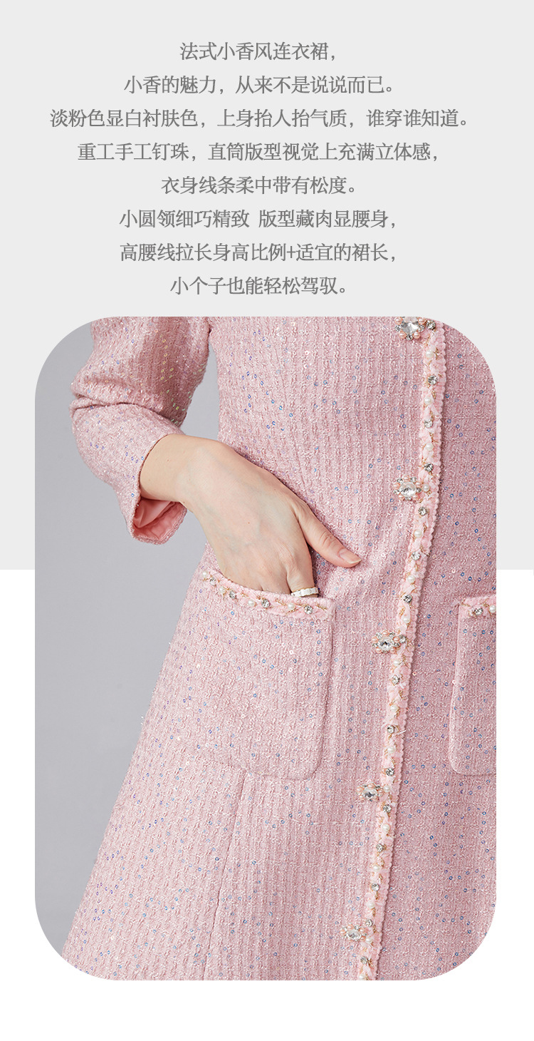 【hr】全新升级【铂金会员514/天猫689/差价175】(10929) 洛诗琳秋冬新款高端精品法式小香风圆领重工钉珠气质连衣裙