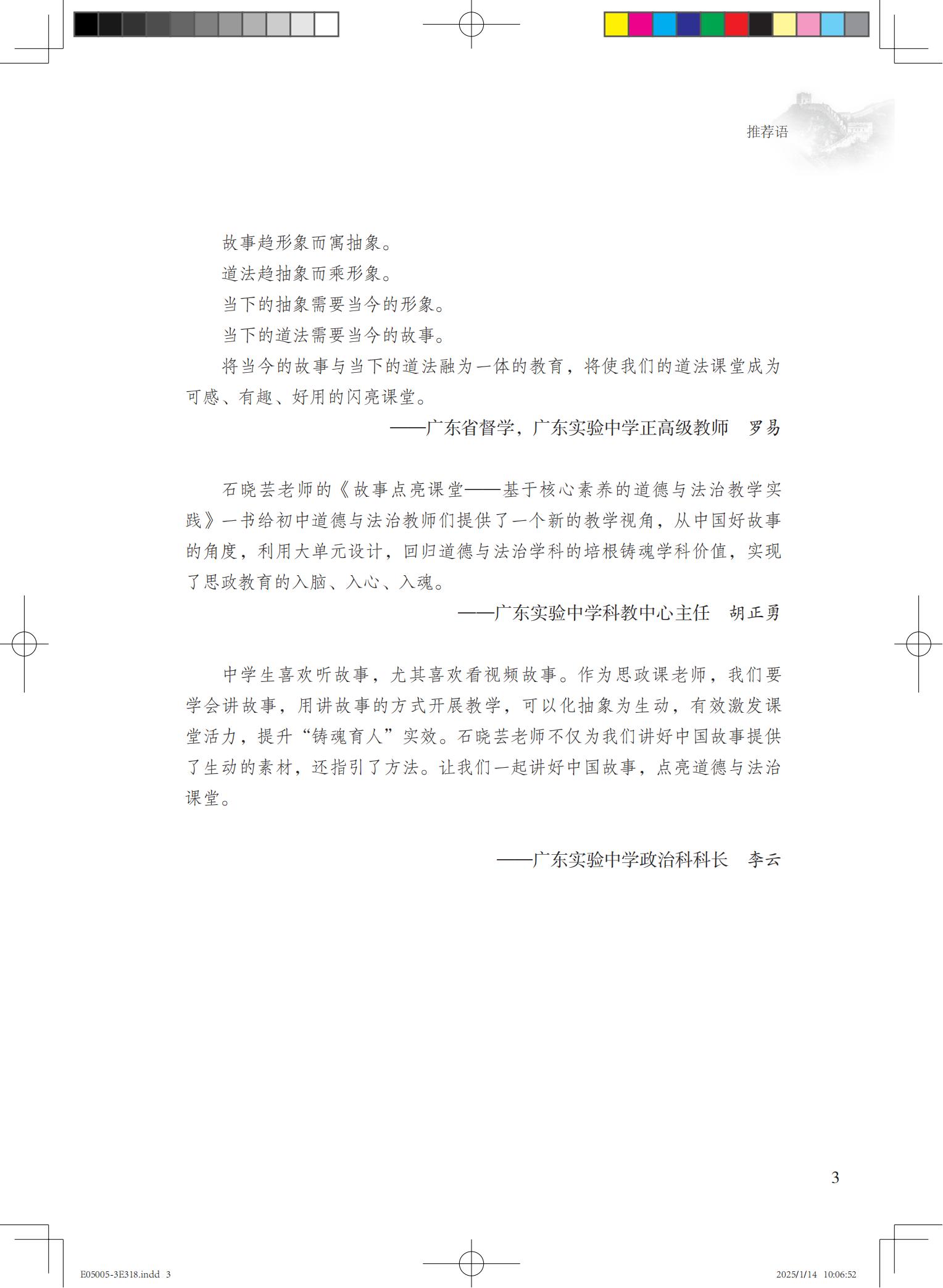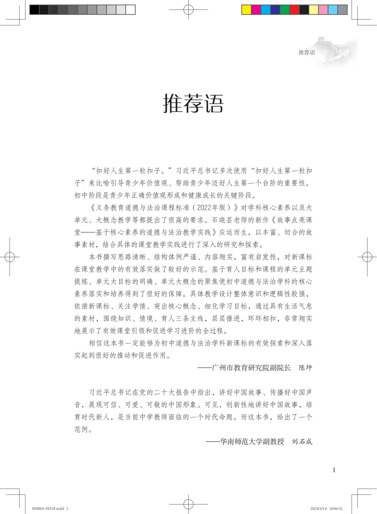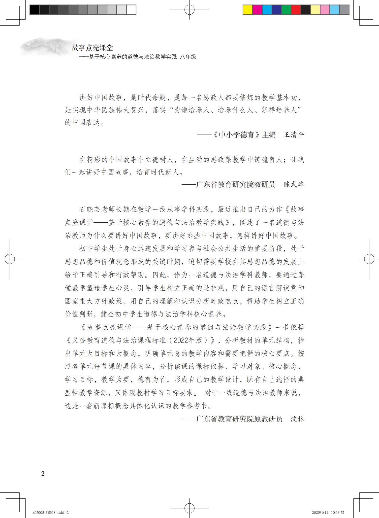 黄国君 道德与法治一级教师,天河区初中道德与法治学科核心组成员。曾获2021年广东省教育教学成果奖(基础教育)二等奖、广州市中小学青年教师教学能力大赛一等奖、天河区初中教育质量绩效评估“先进工作者”。参与编写《义务教育课程标准(2022年版)课例教学解读:道德与法治》《南方新课堂·金牌学案·道德与法治》等4本教学教辅著作,参与3项省级课题研究。