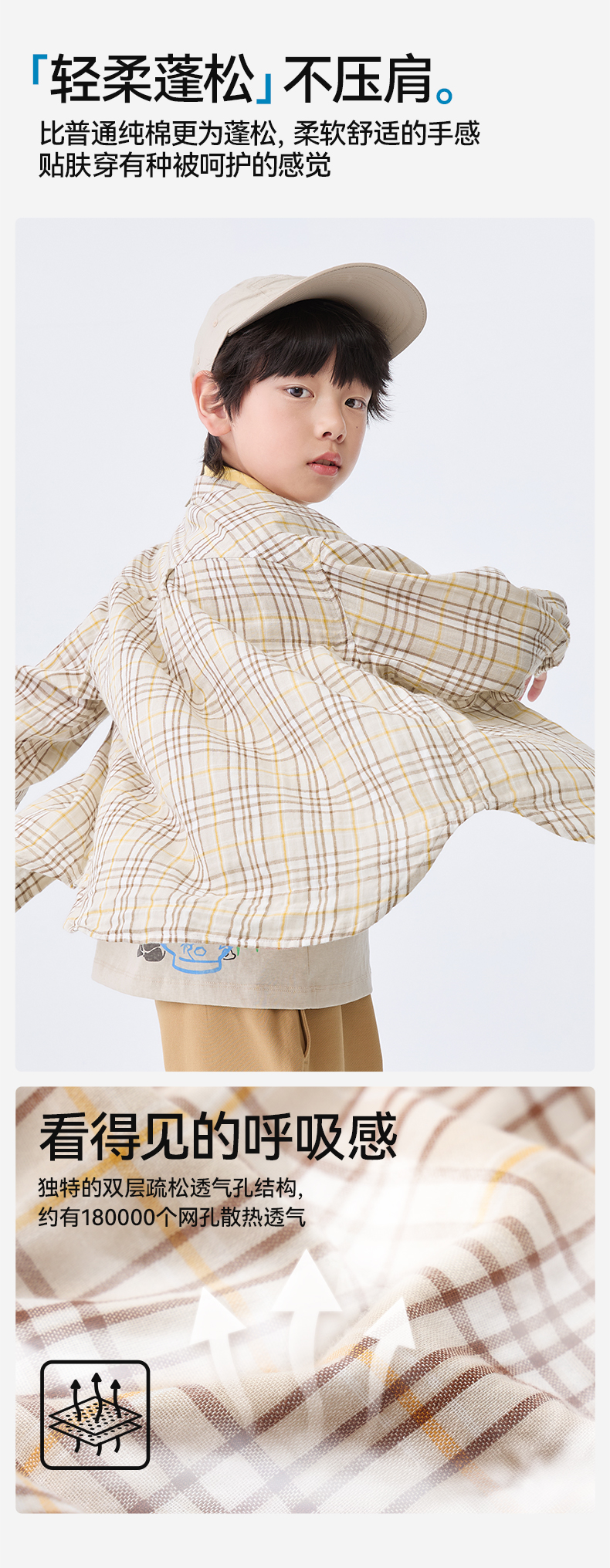 材质上,纯棉双层纱布,区别于普通的纯棉面料,采用双层疏松透气结构,一件衣服上约有180000散热透气孔,天然吸湿透气外且越洗越软