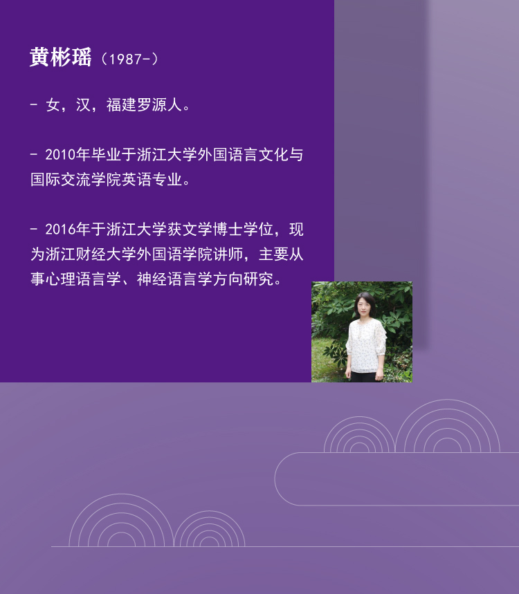 黄彬瑶(1987-)女,汉,福建罗源人。2010年毕业于浙江大学外国语言文化与国际交流学院 英语专业。2016年于浙江大学获文学博士学位,现为浙江财经大学外国语学院讲师,主要从事心理语言学、神经语言学方向研究。