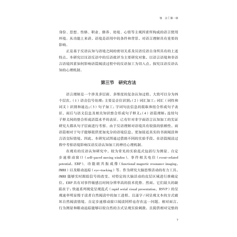 本书主要内容来源于作者博士学位论文,并在此基础上做了修改和补充。研究借助认知神经科学的实验方法,旨在考察认知语境各要素在汉语反语认知加工中的作用机制。主要包含三个实验:实验一通过问卷调查,从反语评价类型和反语语篇标记两个角度考察语篇特征对反语认知难度以及读者接受程度的影响。实验二采用眼动追踪技术,将字面/反语表达与肯定/否定量化词的“聚焦效应”相结合,在语篇阅读过程中考察语言语境(上下文关联)对于反语认知加工的影响。实验三则借助事件相关电位技术,并且采用量表对受话人(被试)的语用能力水平进行评定和分组,旨在考察说话人的交际风格和受话人的语用能力如何协同影响反语认知加工的动态过程。