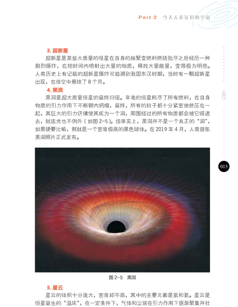 此外,对宇宙中的黑洞、暗物质和暗能量的情况也作了介绍。
