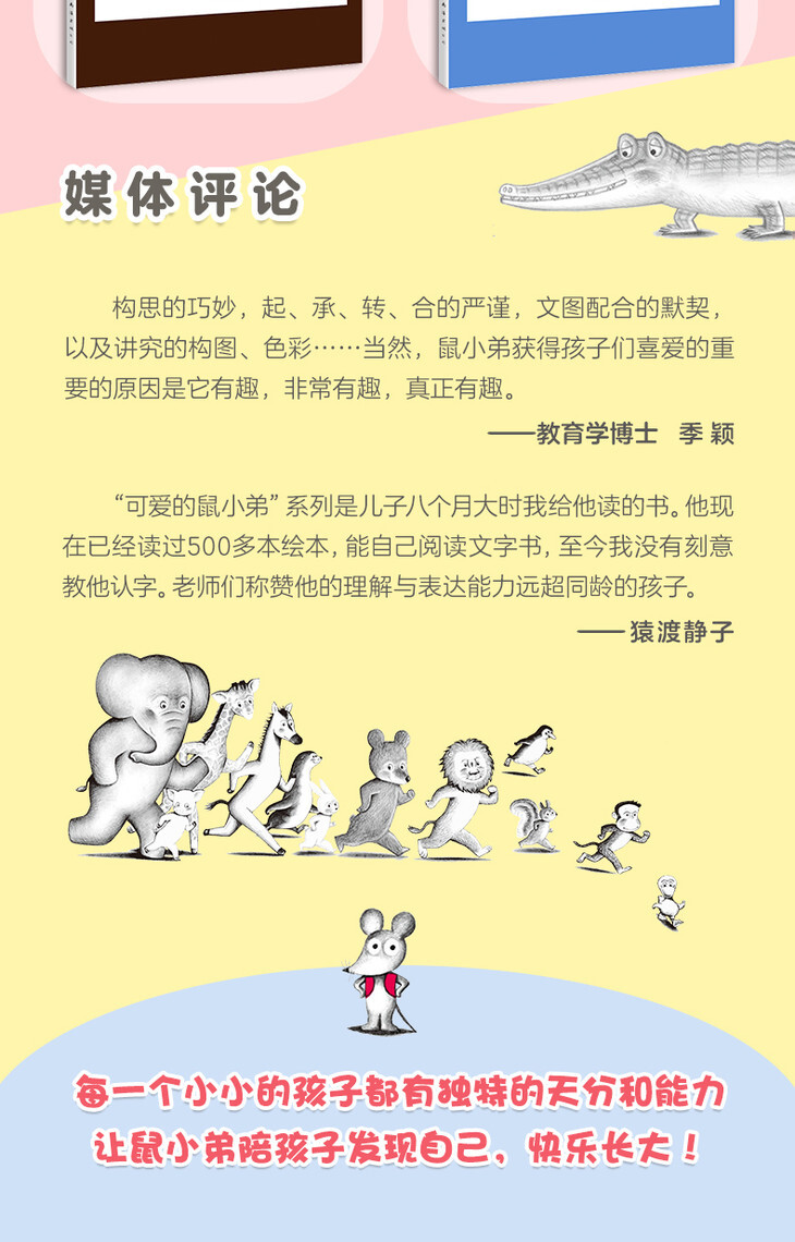 构思的巧妙,起、承、转、合的严谨,文图配合的默契,以及讲究的构图、色彩……当然,鼠小弟获得孩子们喜爱的重要的原因是它有趣,***有趣,真正有趣。