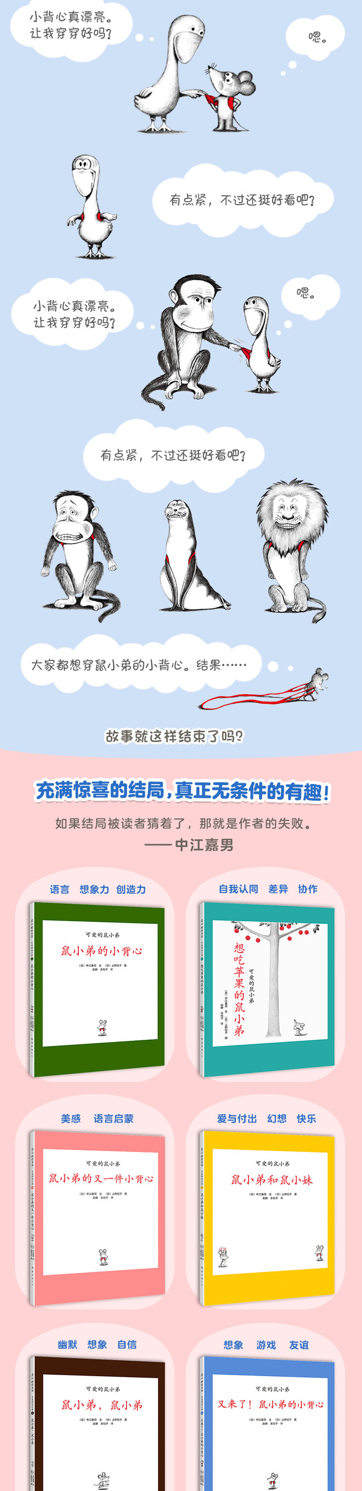 他个子小小的,总穿着一件红色的小背心。他胆子小,力气也小,但他知道怎么跟这样的自己相处,总是笑眯眯地度过每***。他就是绘本界家喻户晓的“人气明星”——可爱的鼠小弟。
