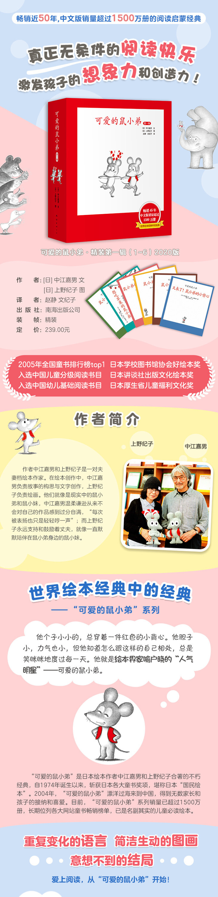“可爱的鼠小弟”系列是日本绘本作者中江嘉男和上野纪子合著的不朽经典,自1974年诞生以来,斩获日本各大童书奖项——日本学校图书馆协会好绘本奖、日本产经儿童出版文化奖、日本讲谈社出版文化绘本奖、日本厚生省儿童福利文化奖,堪称日本“国民绘本”。