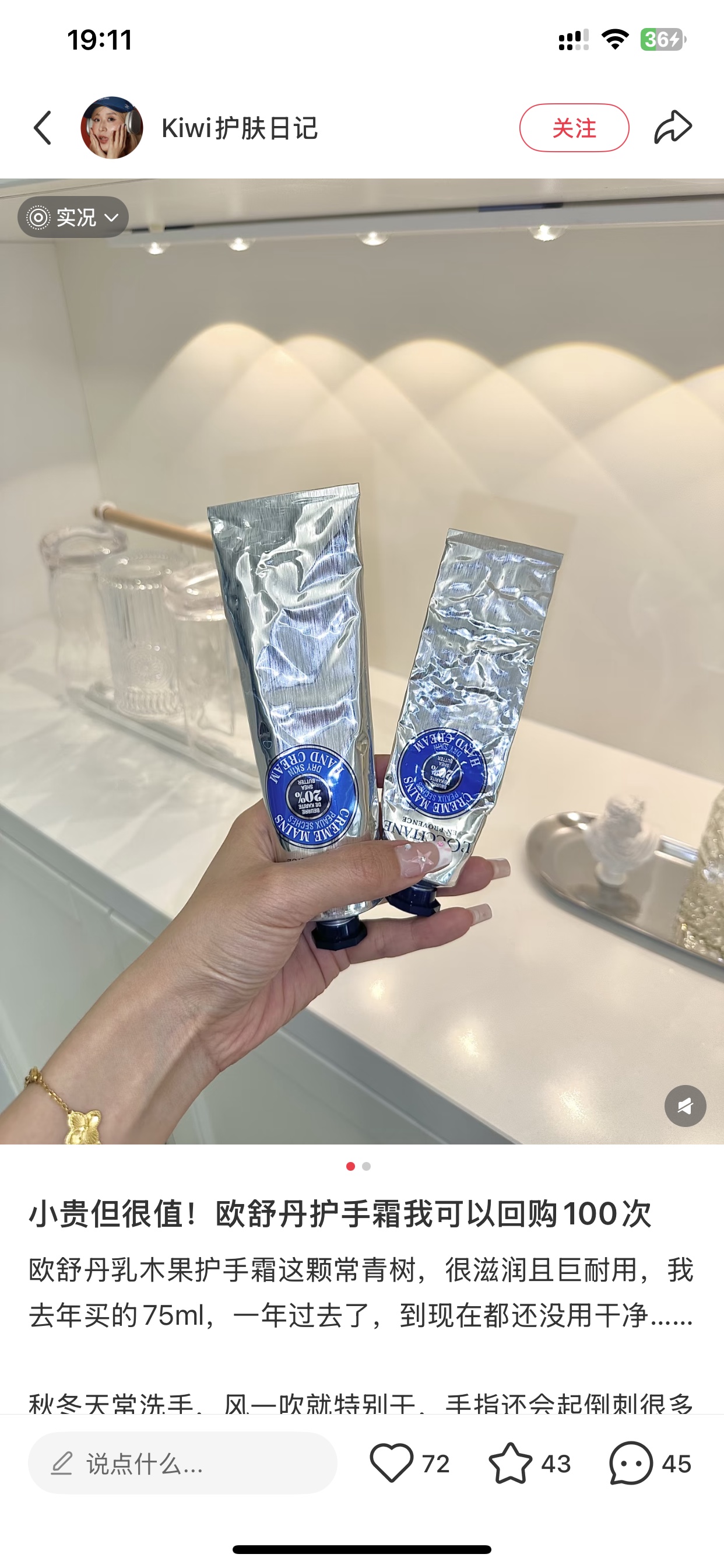 出天猫正品‼️ 欧*舒丹护手霜,这批正装30ml,中标到25.6的。⚠️实际五年可用到28年后!⚠️自用无敌!卖出了小样价!专柜30ml卖95一只!只有乳木果哈!用完不黏、一秒成膜,摸手机眼镜都不担心留指纹~!手真的肉眼可见的软乎细腻!感觉蚊子在我手上都得滑的劈叉…高于5%的乳木果才有滋润效果,这款浓度达到20%! 肤感都没踩过雷,木质香调!!欧&舒丹乳木果经典护手霜!30ml正装!手部皮肤比面部更薄,皮脂腺分布也更少,天生就更容易干燥!坚持涂护手霜能有什么改变?真的没那么干瘪了!也没那么黄气了!不仅能保湿,还能对抗自由基,延缓胶原流失,让双手保持年轻状态。主打20%的乳木果,比普通系列更滋润,但不油腻!30ml的欧*舒丹!原价95,只有乳木果!最经典的!中标到25.6!注意!五年到28.6⚠️好的护手霜兼具了情绪价值和实用功能!今天是30ml得正装欧*舒丹!拥有漫画手只是时间问题!30ml的正装欧*舒丹!爱护自己的双手,如同小鸟给自己梳洗羽毛一样!这批只有乳木果,!总之确实很经典!10个人去专柜9个人买乳木果嗷!!