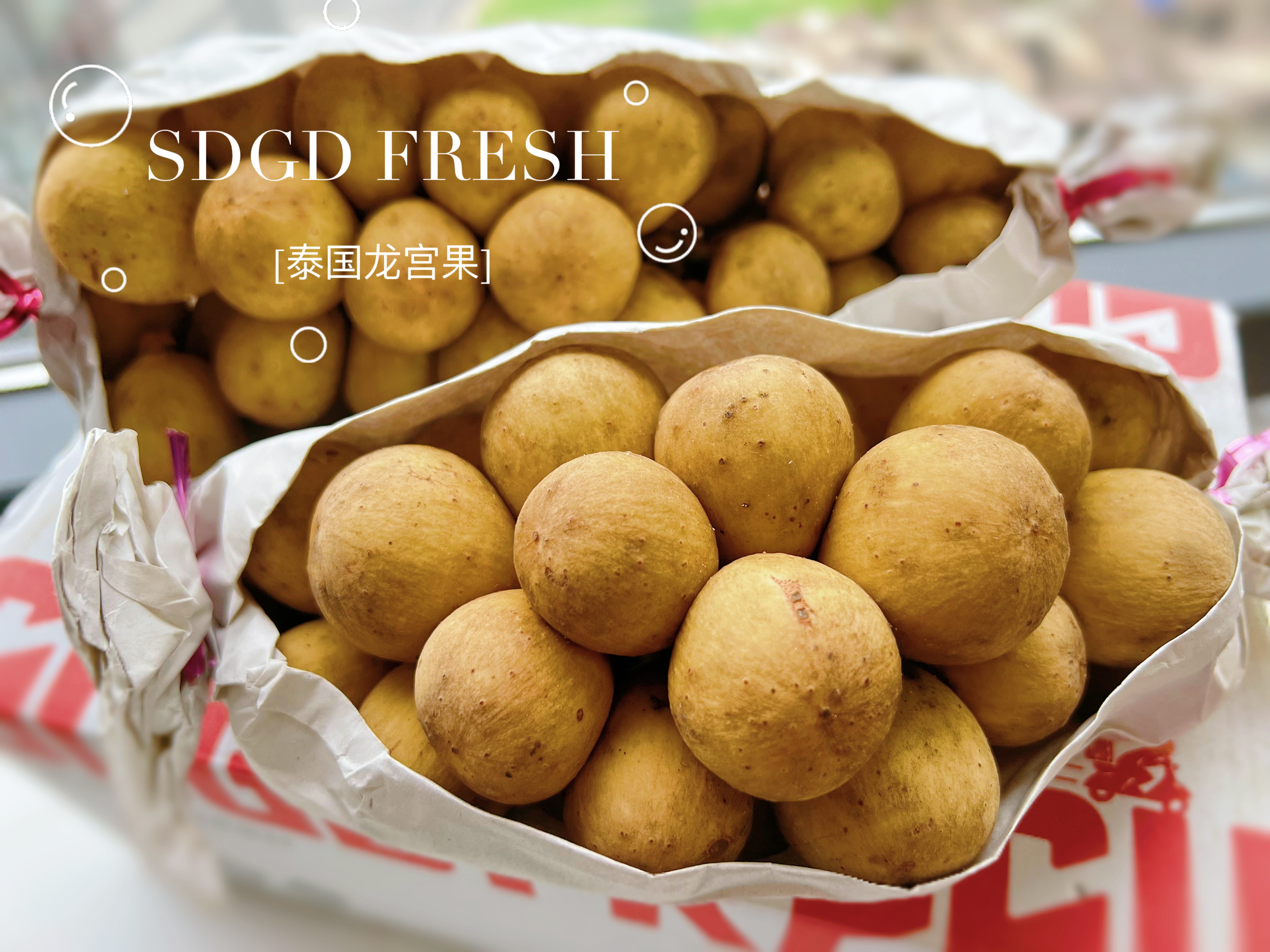 龙宫成串生长,小圆球状,果皮淡黄。外形似枇杷,比枇杷略小,果肉分瓣,晶莹洁白,气味芬芳软糯,剥皮即食,味道醇美,大的偏甜,小的甜中微酸,口感有些微像荔枝,但果肉更嫩一些,水分更多,甘爽可口,据说是泰国王妃最爱的水果。