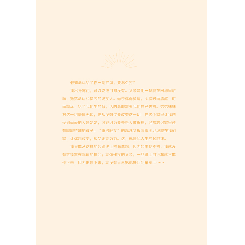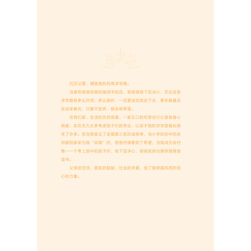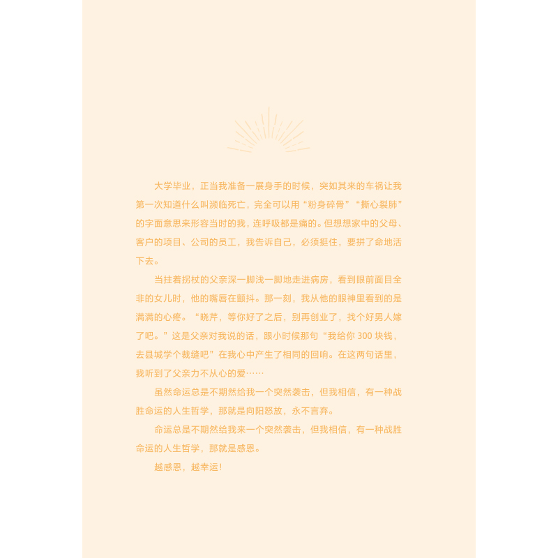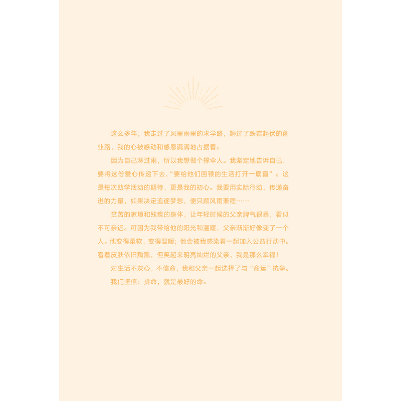 父亲意外去世两个月后,梁晓芹发现没有教她学过一个字的父亲,竟然是如此伟大:他身体力行地教会了她立命之本,如果不是这样一位父亲,她将很难穿越那么多的至暗时刻。整本书以一个一个小故事的形式记录了一位平凡而伟大的父亲,一个农民,残疾人,只读到小学三年级的父亲以身作则,影响和感染着女儿从“寒门学子”到“上海市三八红旗手”、“政协委员”、“人大代表”,再到“青年企业家”的故事,记录了梁晓芹和父亲一路携手拼命奋斗改变命运的心路历程。