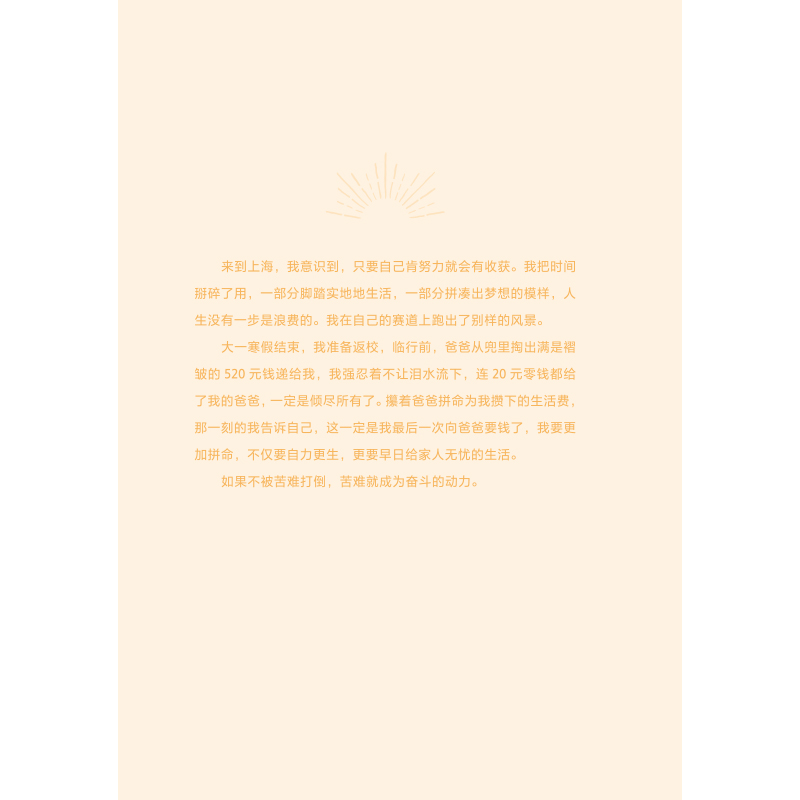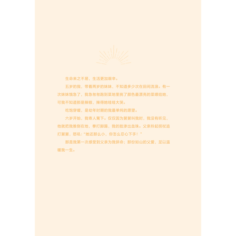 小小的女孩,人生经历却已跌宕起伏,每一个小故事都鼓舞人心。《你当向阳怒放》像万物缝隙照射进来的光,让人豁然开朗,这个时代需要这样的透亮。
