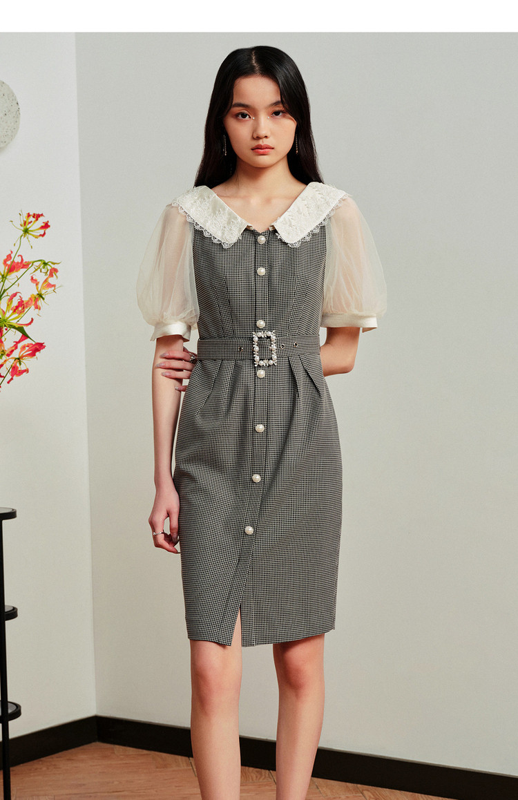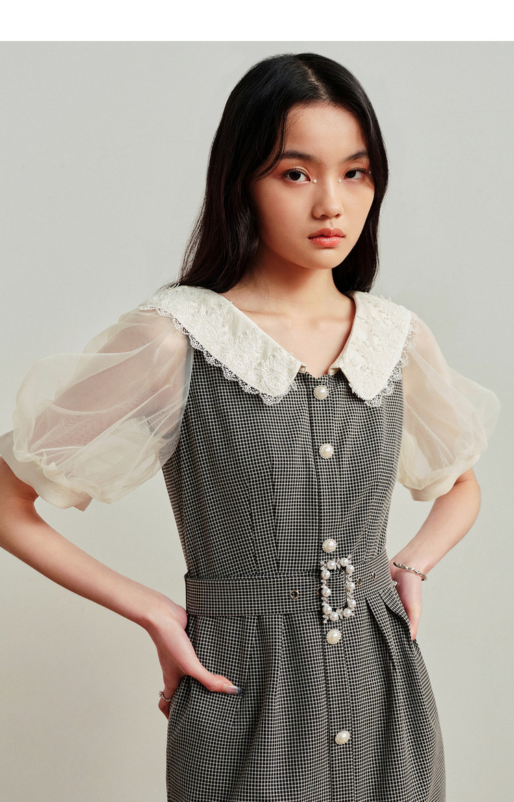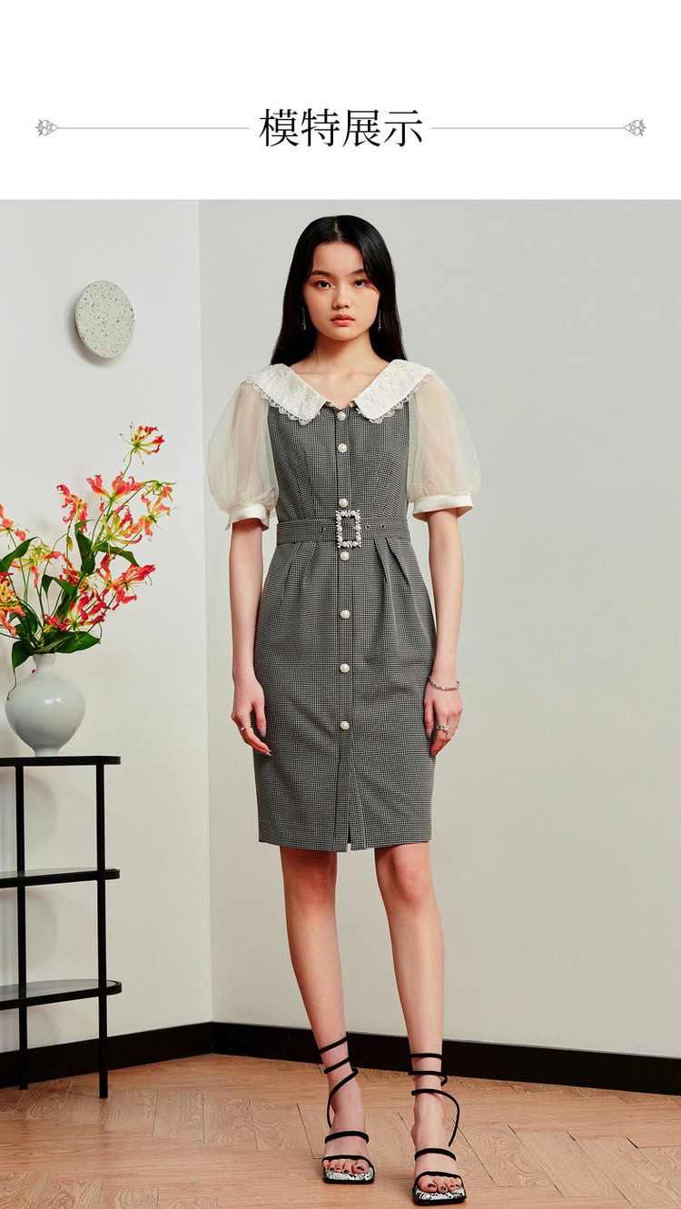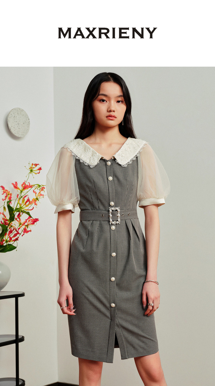 MAXRIENY法式浪漫黑白格纹翻领连衣裙2023夏季新款复古格纹裙子女MS88DR321Z00