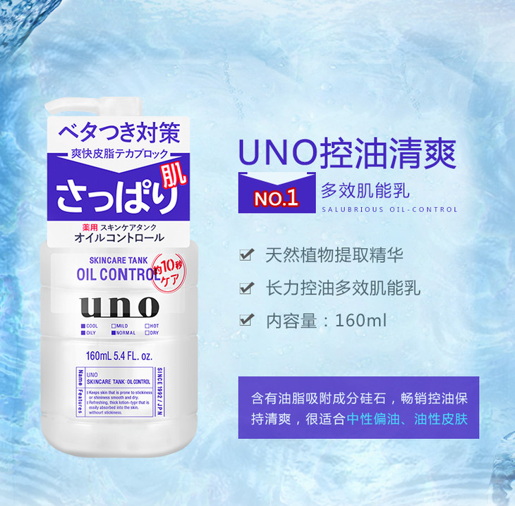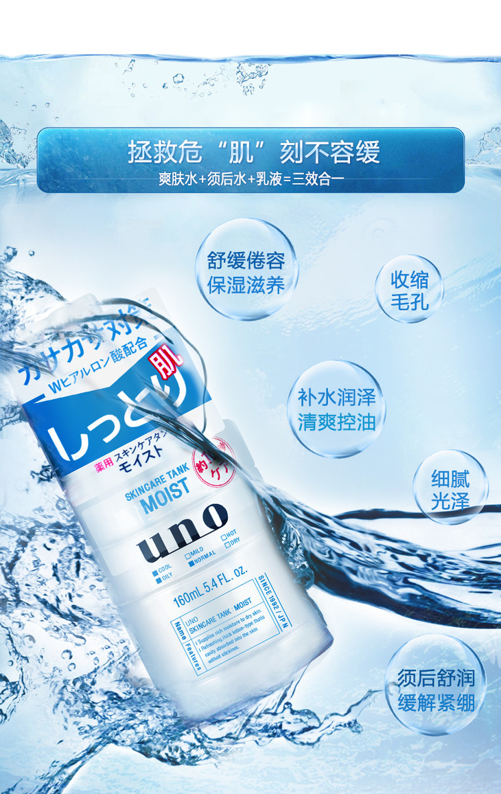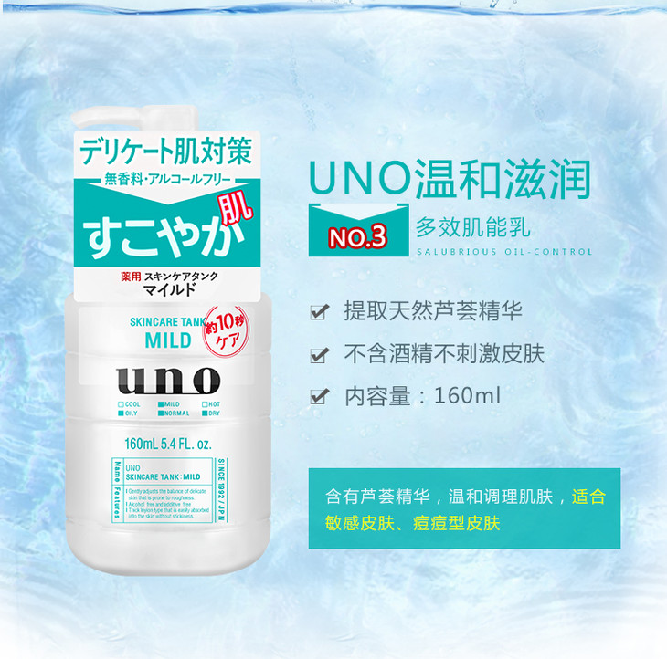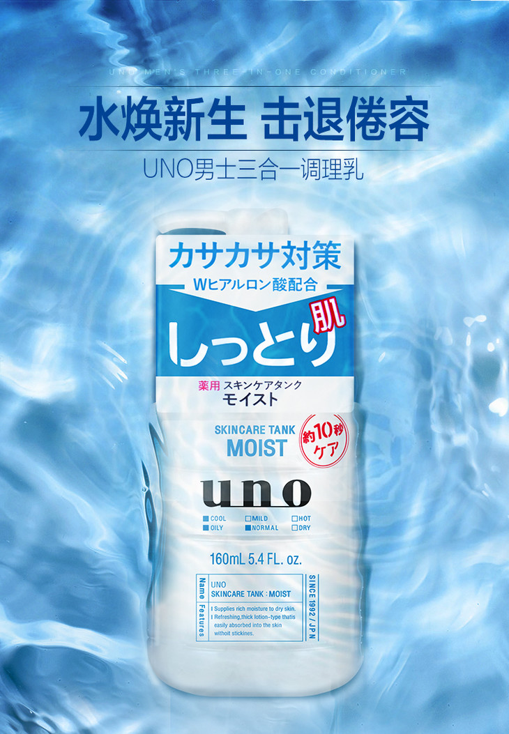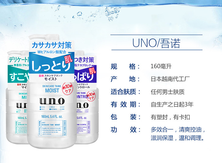 资生堂Uno男士多效合一润肤乳😍😍資生堂Uno多效合一潤膚乳实现保湿化妆水、乳液及须后护理三合为一的集效护肤。👔👔功效: 保湿 滋润 锁水 提亮肤色 、💦补水、收缩毛孔、控油!💙清爽型 (深蓝色瓶)添加油脂吸附成分,补水同时有效控油,触感清爽不黏腻。适合中、油性皮肤💘滋润型 (浅蓝色瓶)添加双倍玻尿酸,锁水保湿,触感温润不黏腻。适合中、干性、缺水皮肤💚敏感型 (淡绿色瓶)添加芦荟精华、甘油、不含酒精。触感温和不黏腻。适合中、干性、缺水皮肤,尤其适合调理敏感肌肤。