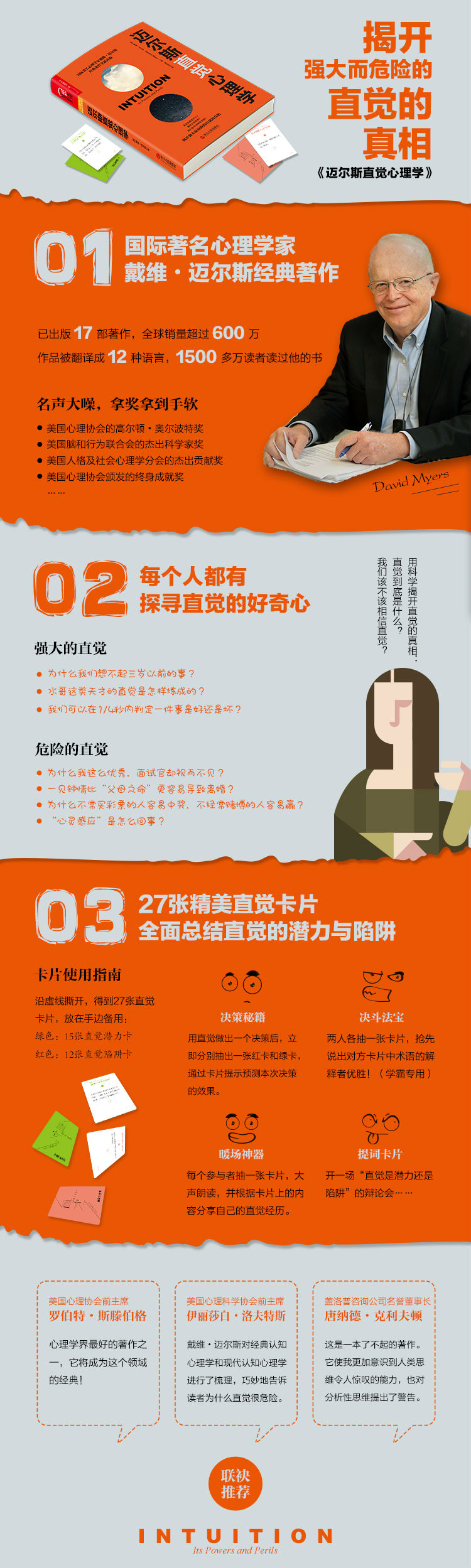 l 《迈尔斯直觉心理学》绝非迎合猎奇心理的娱乐书籍。它通过很多通俗易懂的事例,以科学的态度,客观地把“直觉”这一神秘莫测的事物解释得非常透彻。