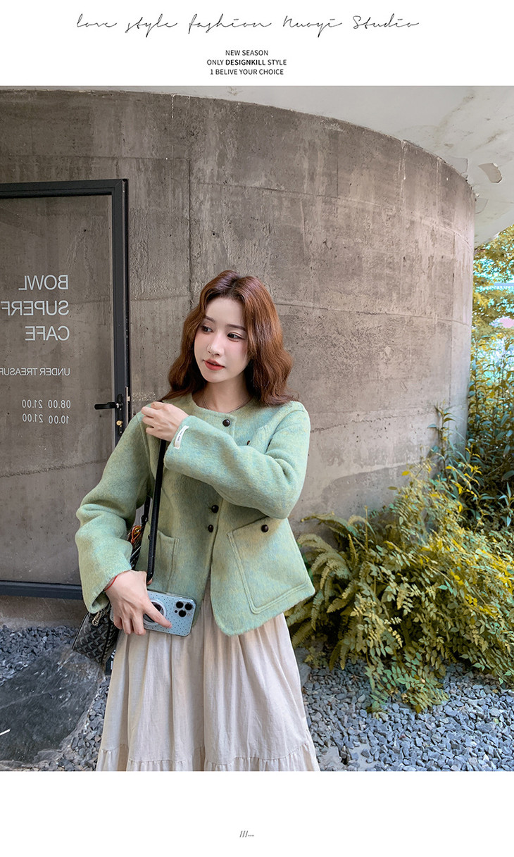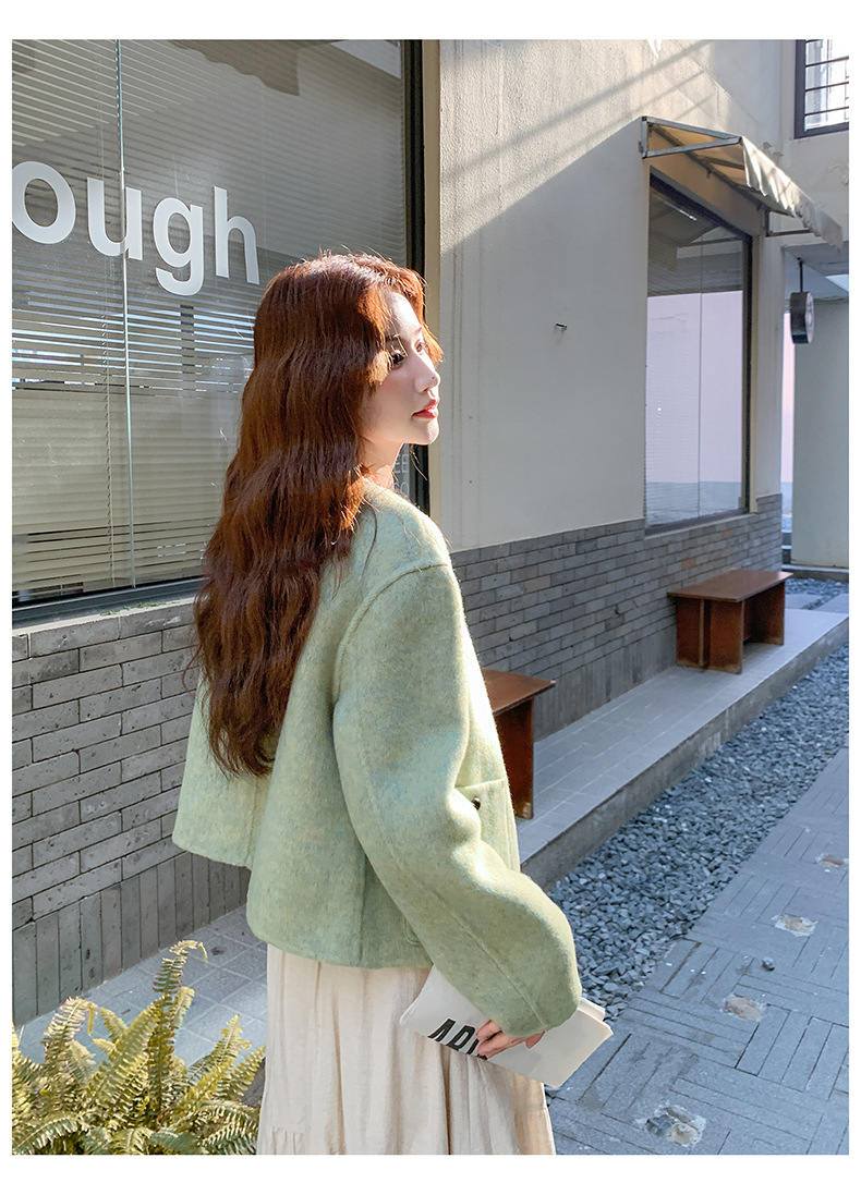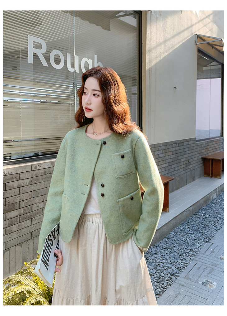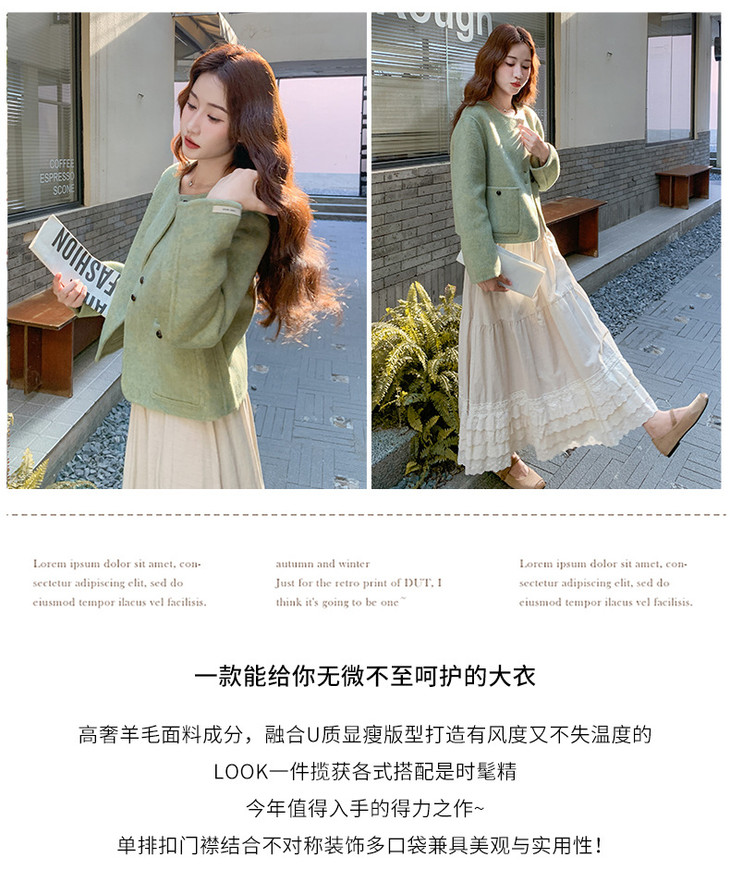 羊毛呢外套2025秋季新款女装圆领小香风绿色呢大衣SLYS9653