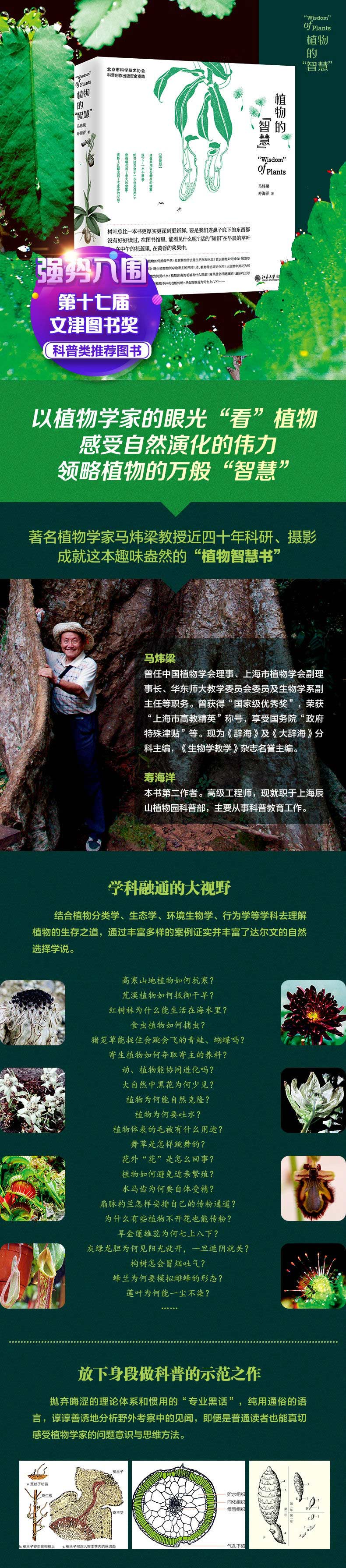 被子植物来到地球一亿多年,它们在适应多变环境的过程中逐渐生成了多种多样的“智慧”,以至于演化出具有二十多万种、一万多个属、四百多个科的丰富多彩的大群。植物学家马炜梁教授近四十年来一直在寻求植物的生存“智慧”,他认为:植物虽然站在原地不动,不能位移,但确实可以主动去找寻异性;植物没有神经系统,但确实有接受刺激的反射弧,能够很快地做出反应;当食叶昆虫噬咬叶片后,植物能分泌一种物质招引昆虫的天敌来保护自己;植物能设计出复杂的传粉路线,让昆虫为它携带花粉;植物有利用环境的能力,能与动物协同进化……在这本趣味盎然、图文并茂的科普著作里,他结合植物分类学、生态学、环境生物学、行为学等学科去理解植物的生存之道,以丰富的实例,结合精美**的微距摄影图片,令人信服地揭示了植物在演化进程中所形成的与根茎叶、花朵、果实与种子等相关的种种“智慧”,证实并丰富了达尔文的自然选择学说。本书是“放下身段做科普”的示范之作。学科融通的大视野、丰富多样的案例、通俗晓畅的语言以及精美**的图片,有助于博物爱好者乃至植物学专业人士深度认知生命的奥秘,并真切感受植物学家的眼光与情怀、问题意识与思维方法。