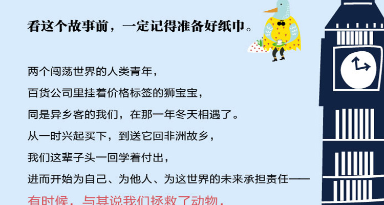 《我在伦敦买了一头狮子》:这是一段感动人的不可思议情缘,更是一次关于真爱、成长、自由与重逢的深情阅读。两个闯荡世界的大男孩,一时兴起在货公买下一头狮宝宝,开始了一段跌跌撞撞,又充满意外惊喜的旅程。可爱大猫很快长成雄狮,并在众人努力下回到洲故乡。分隔一年之后,心爱的小狮子是否还认得他的人类老朋友?