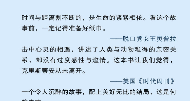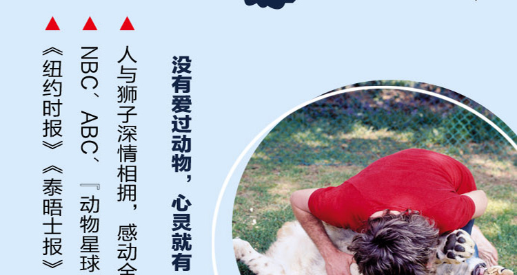 ▲NBC、ABC、“动物星球”、专访。▲《纽约时报》《泰晤士报》畅销书。▲5000 点击的YouTube网红视频,人与狮子的深情拥抱,打破你我心底的坚冰,让美国脱口秀女王奥普拉泪洒节目现场。▲时间与距离割不断的,是生命的紧紧相依。▲没有爱过动物,心灵就有一部分未被唤醒。
