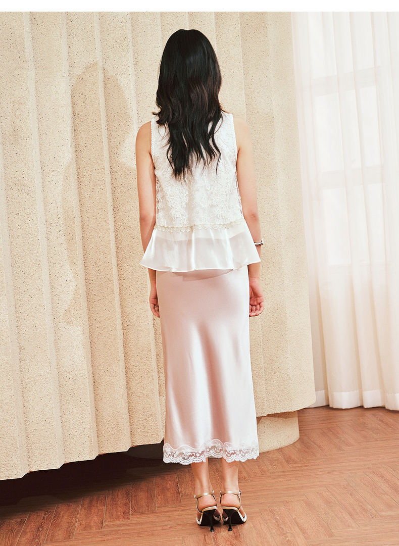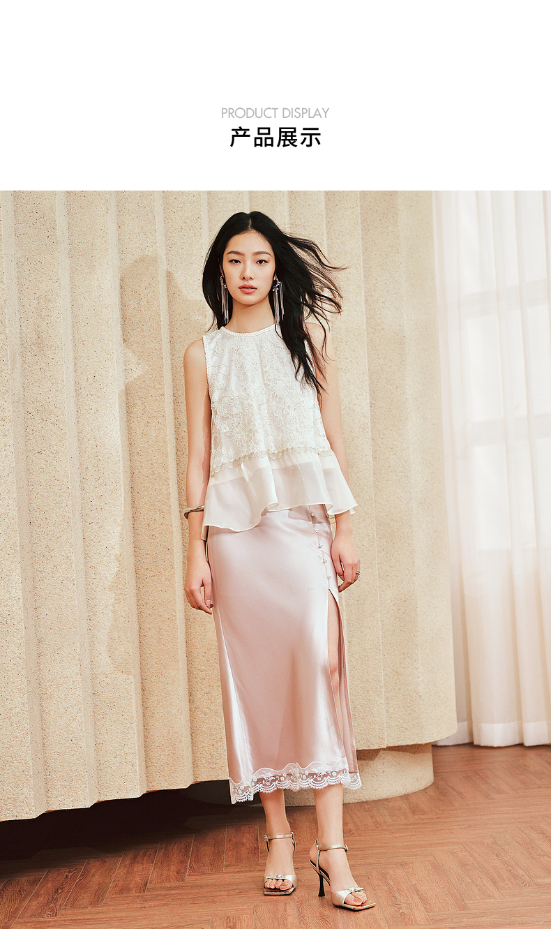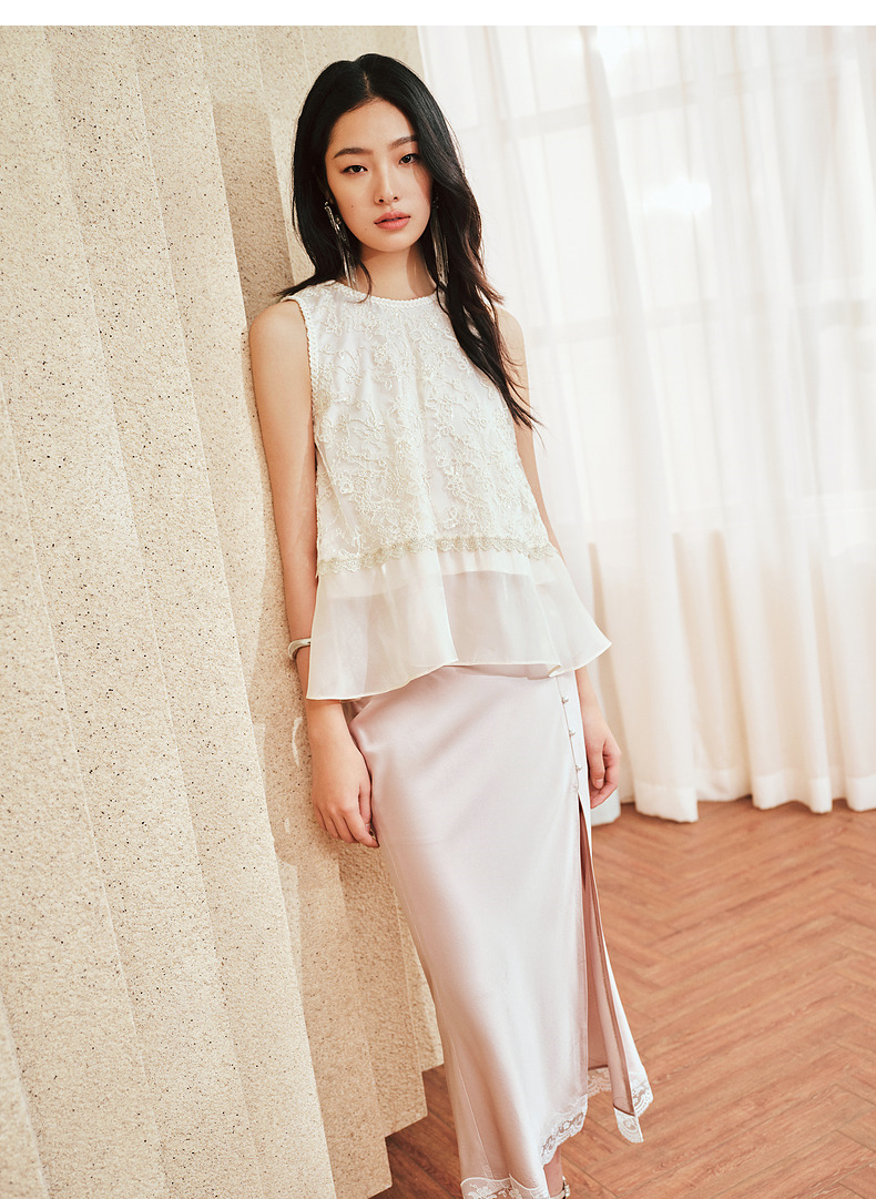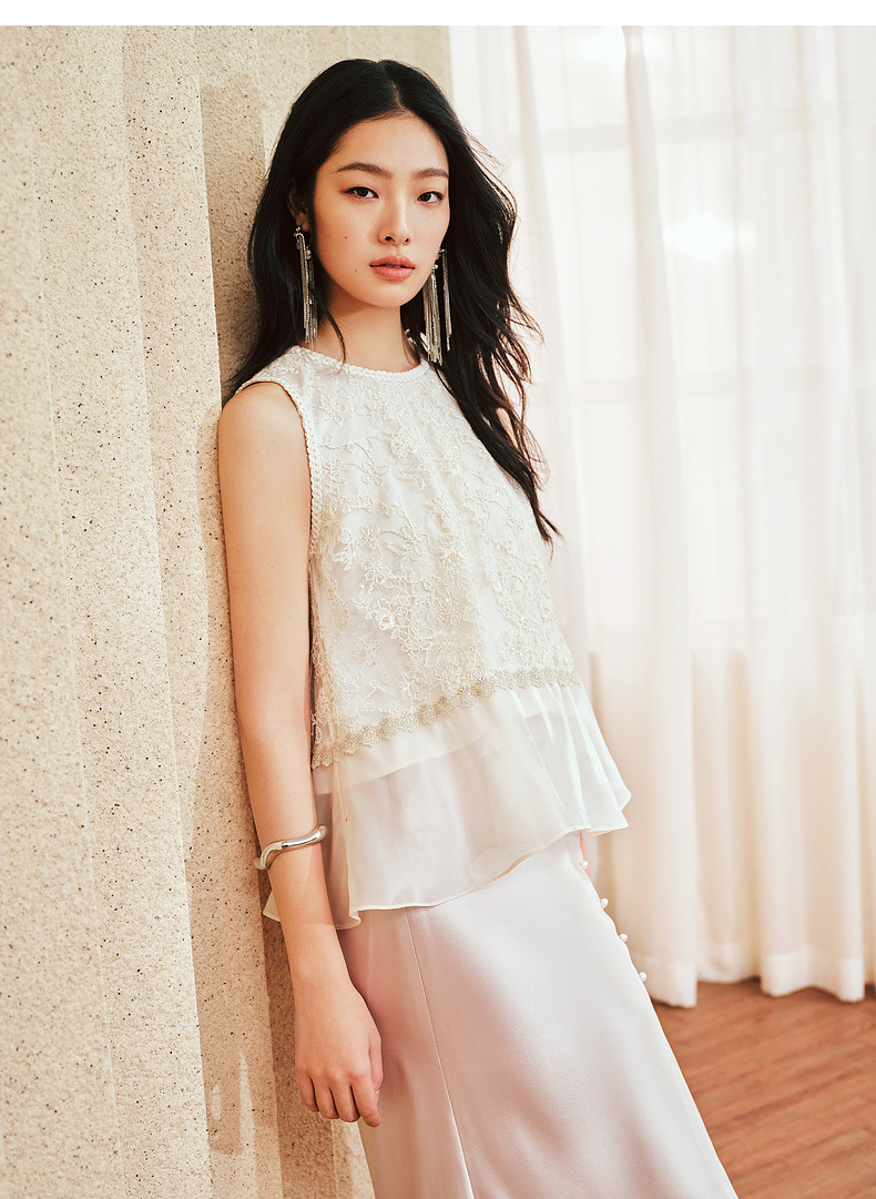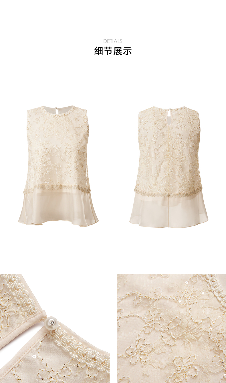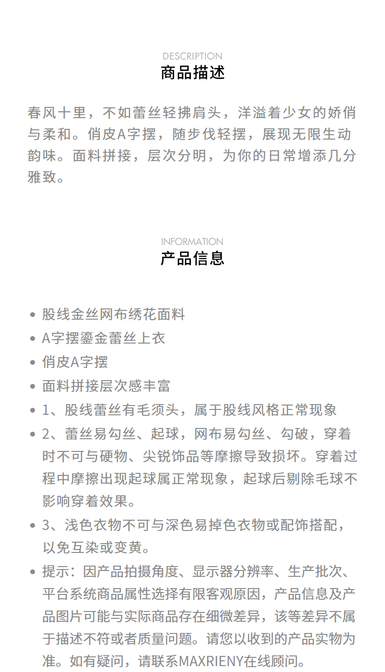 MAXRIENY千金风雪纺衫女A摆鎏金蕾丝上衣修身显瘦(货号:MS85TP255)